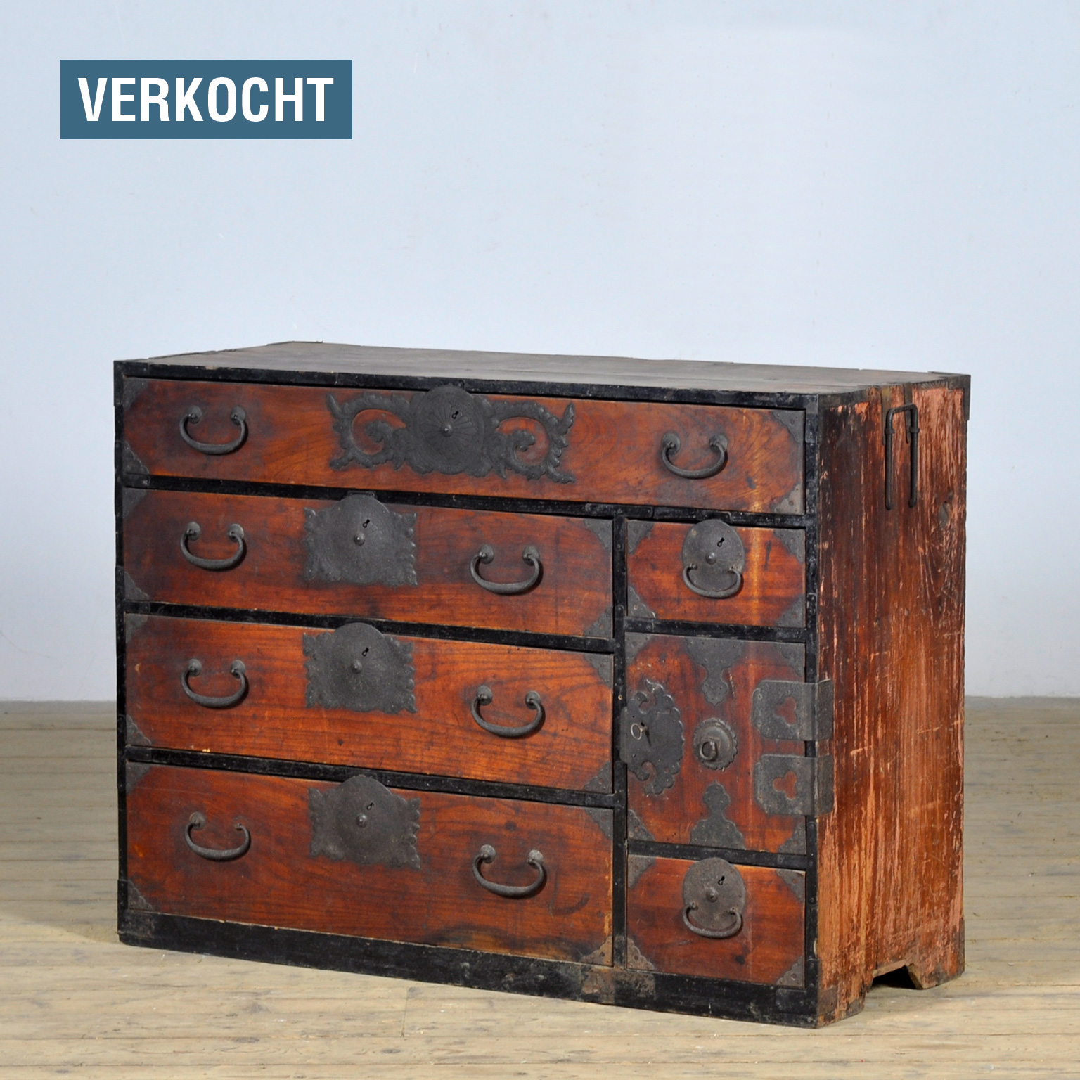 Functional and charming, this Tansu offers versatile storage with multiple drawers and two smaller drawers behind a door, perfect for storing documents or personal belongings. A piece that adds a unique, historical touch to any modern or classic interior.