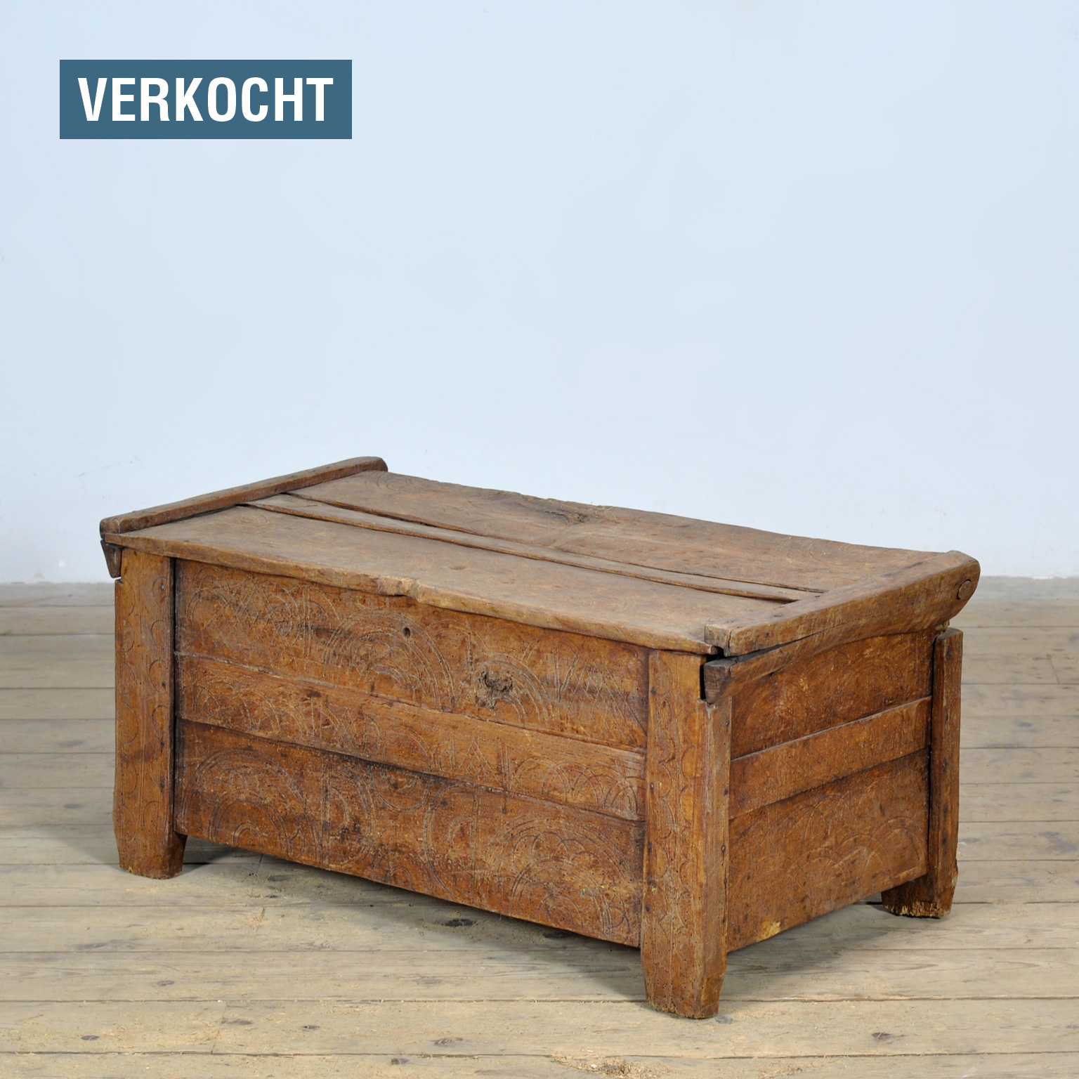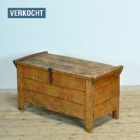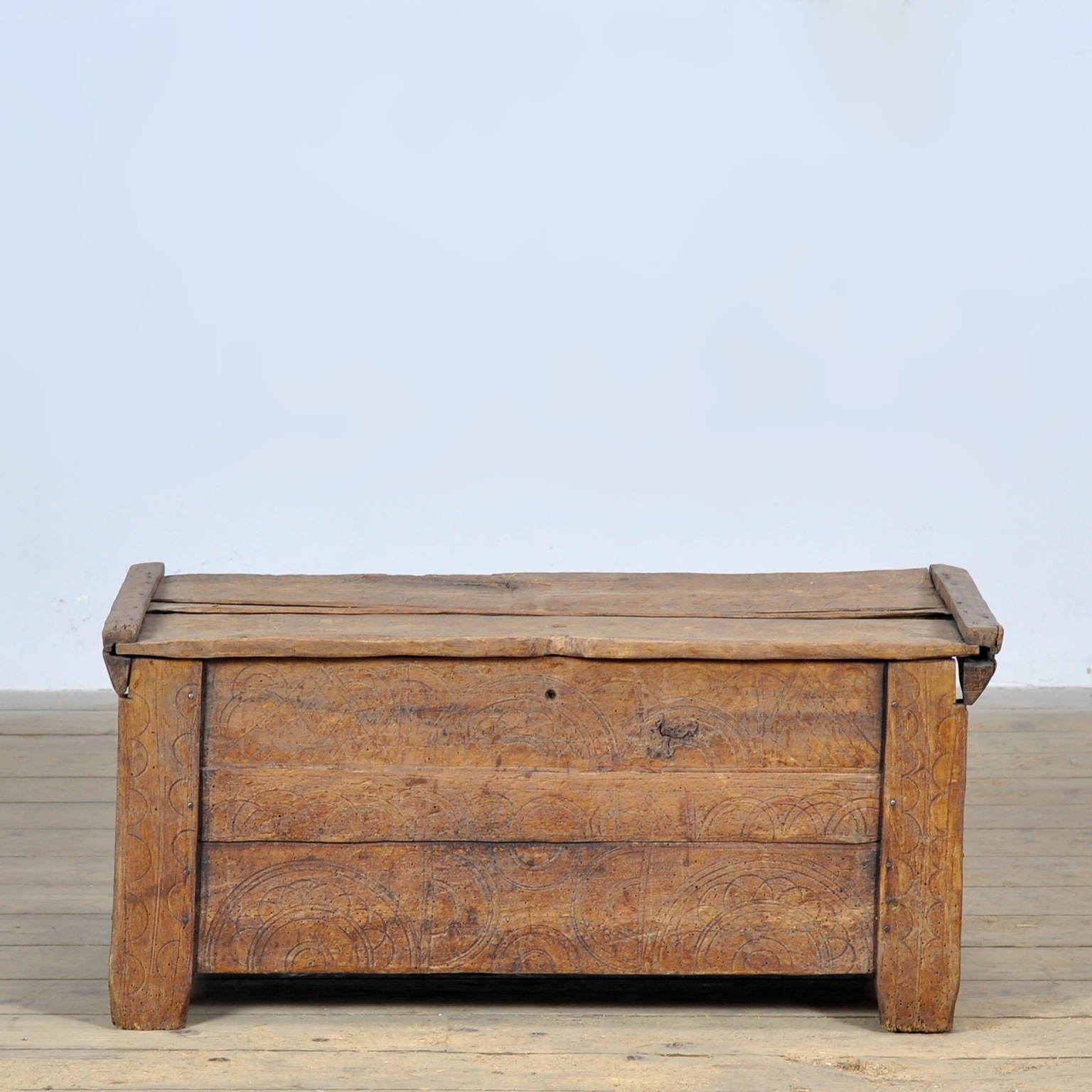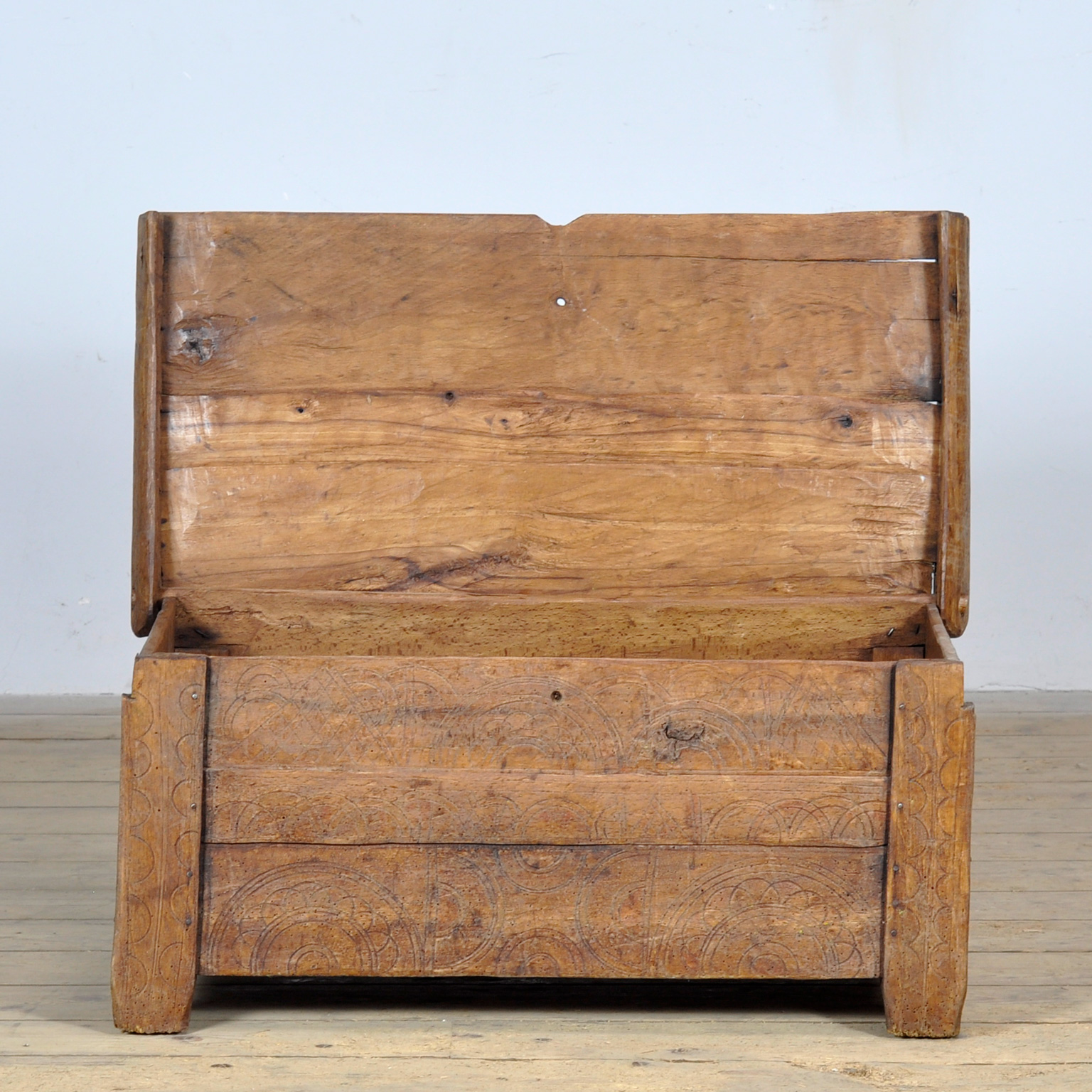 Low shepherd’s chest with a beautiful appearance and proportions. These chests were made in the same way for centuries. They were decorated with traditional geometric symbols. Reduced to a natural finish. Raw, authentic. Originating from the mountains of Transylvania around the middle of the 19th century. The chest is made of beech wood.