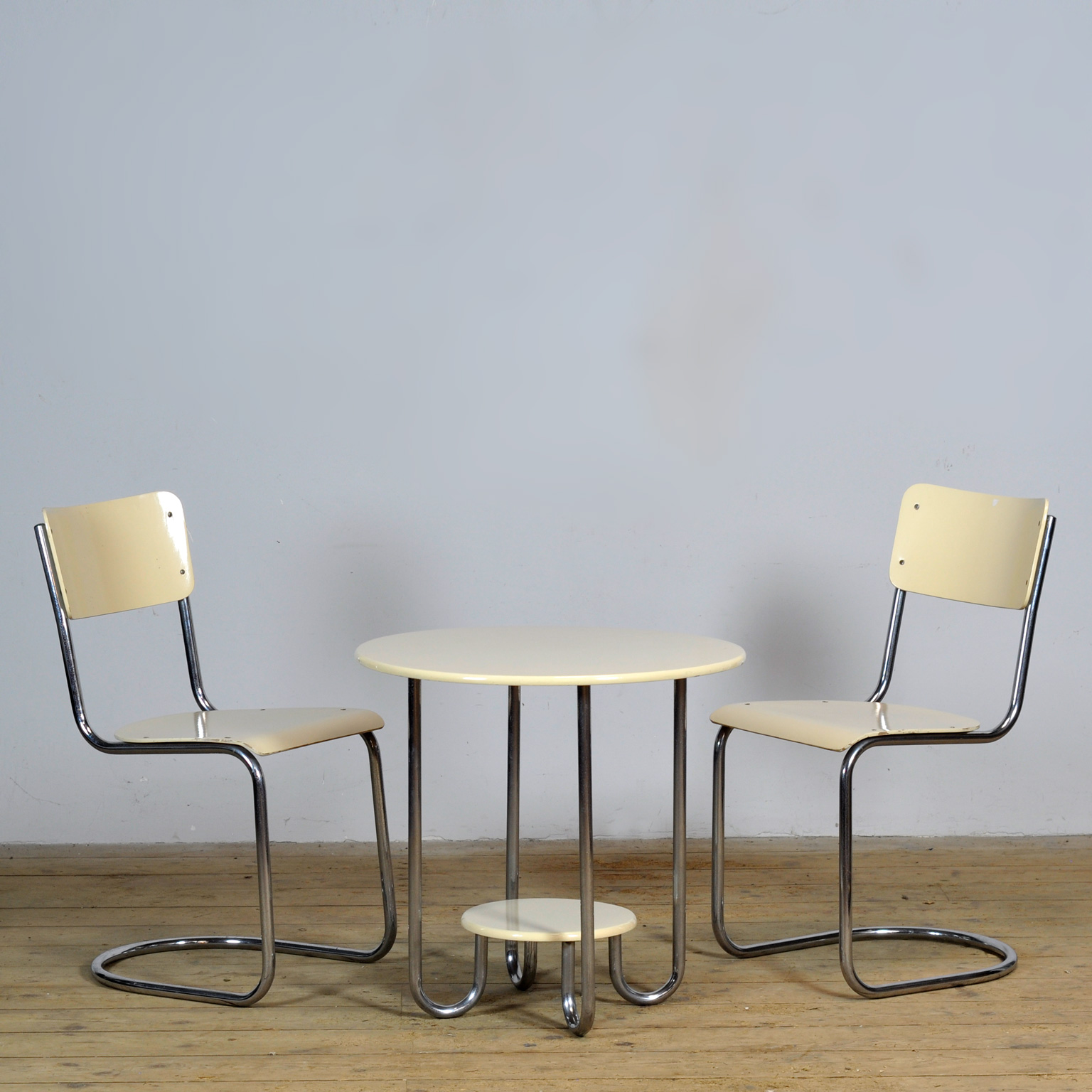 Stylish tubular furniture set by Auping from the 1930s, consisting of a pair of chairs (model 656) and a side table (model 584). The design is characterized by the elegant, curved chrome tubular frames typical of the modernist design of the interwar period. The chairs and table are finished in cream, creating a fresh and timeless look that fits effortlessly into both classic and modern interiors.