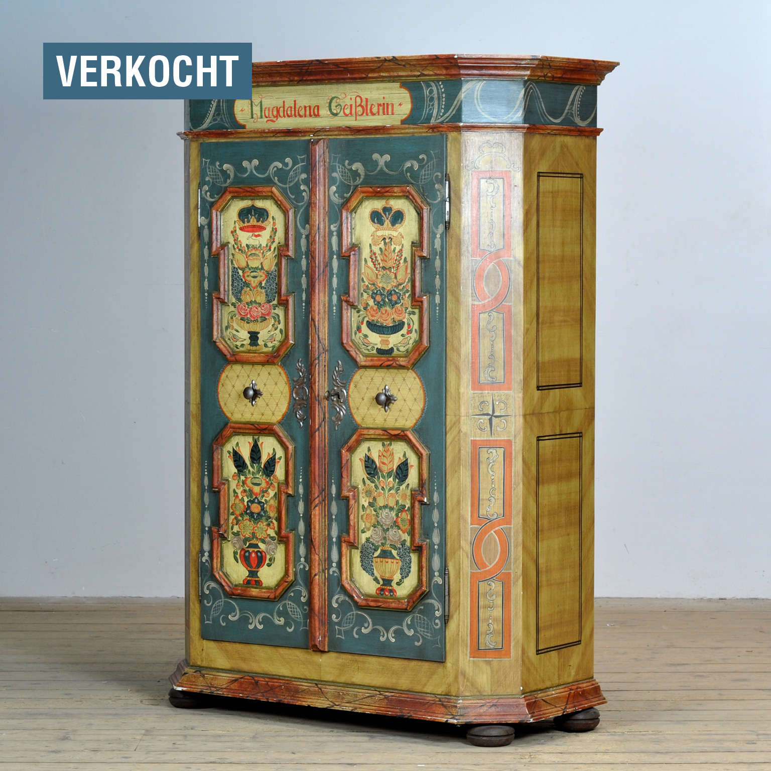 A beautiful cabinet from the rural south of Germany. The cabinet was once given as a wedding gift. This cabinet is hand-painted in vibrant colours. The cabinet has its original hinges and lock, made of pine with a hardboard back. Inside 3 shelves and a rod. Is in good condition and is ready for use. Free of woodworm.