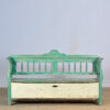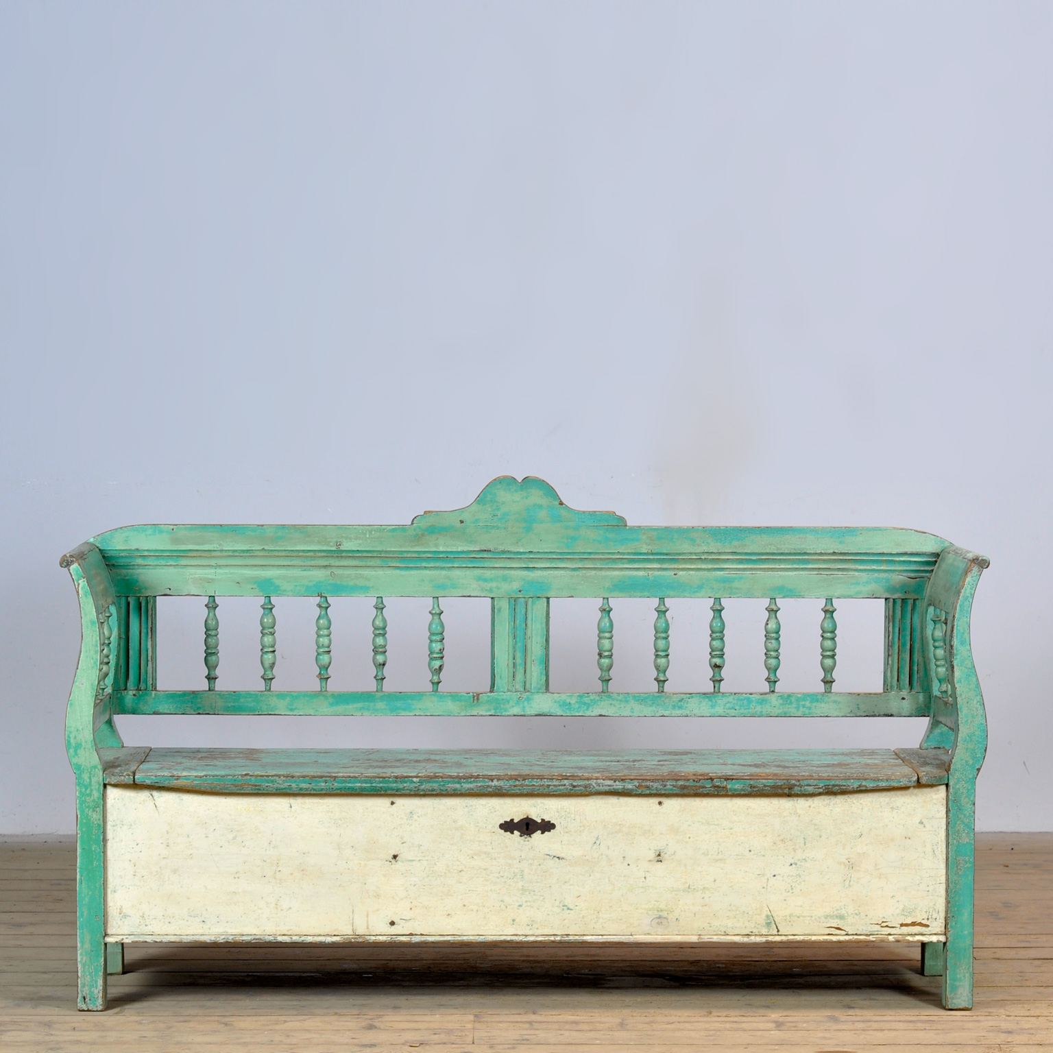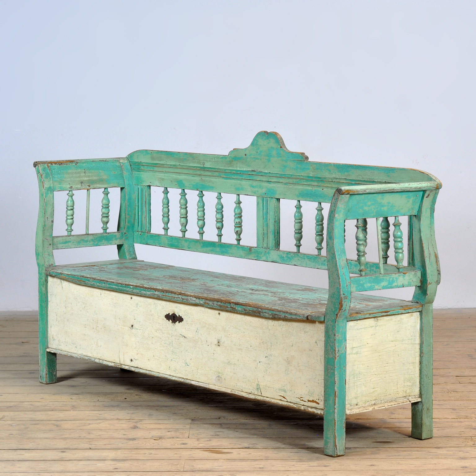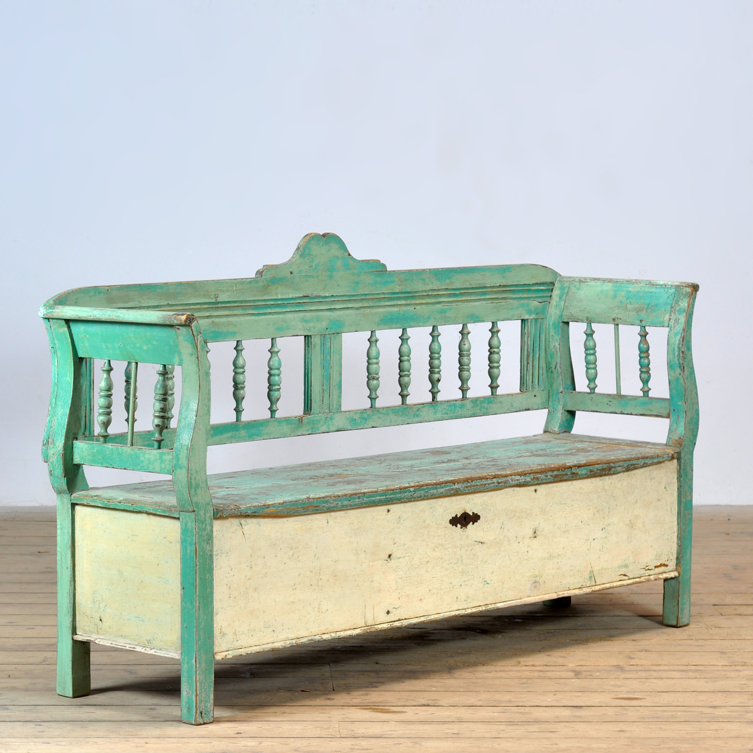 A charming bench from Hungary with the original paint. Over time and use, the paint has worn away in places, down to the wood. It features storage space under the seat, divided into three compartments.