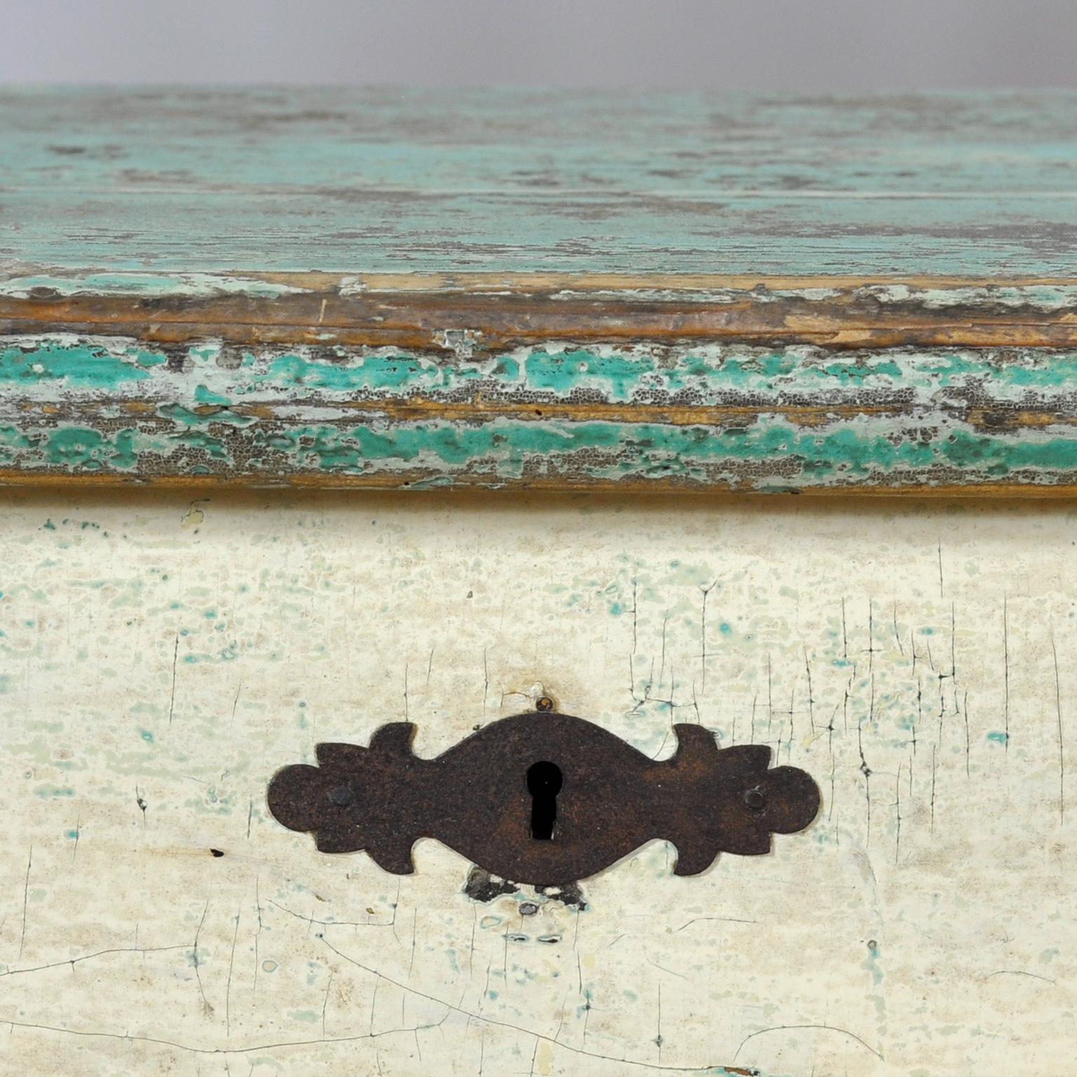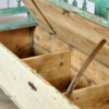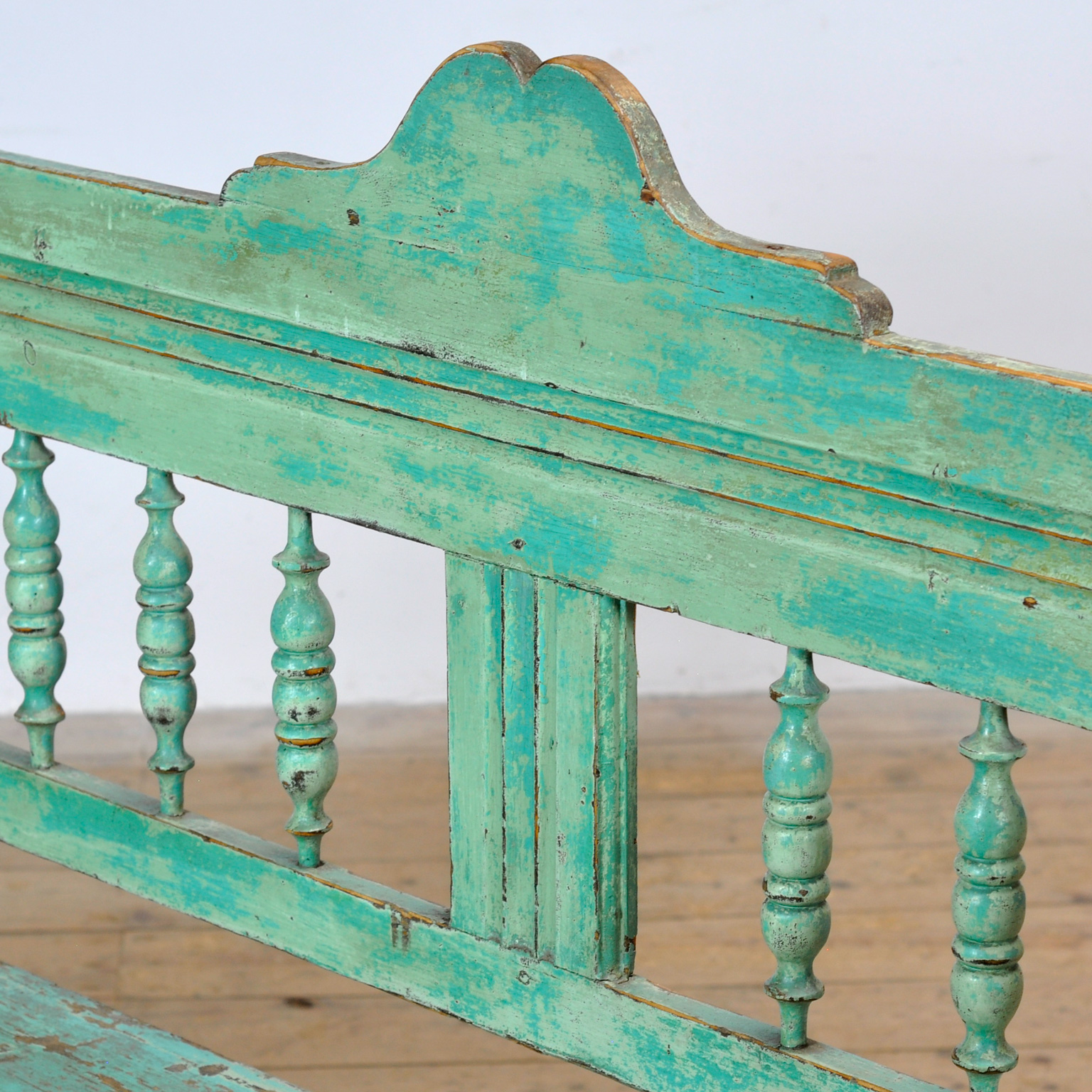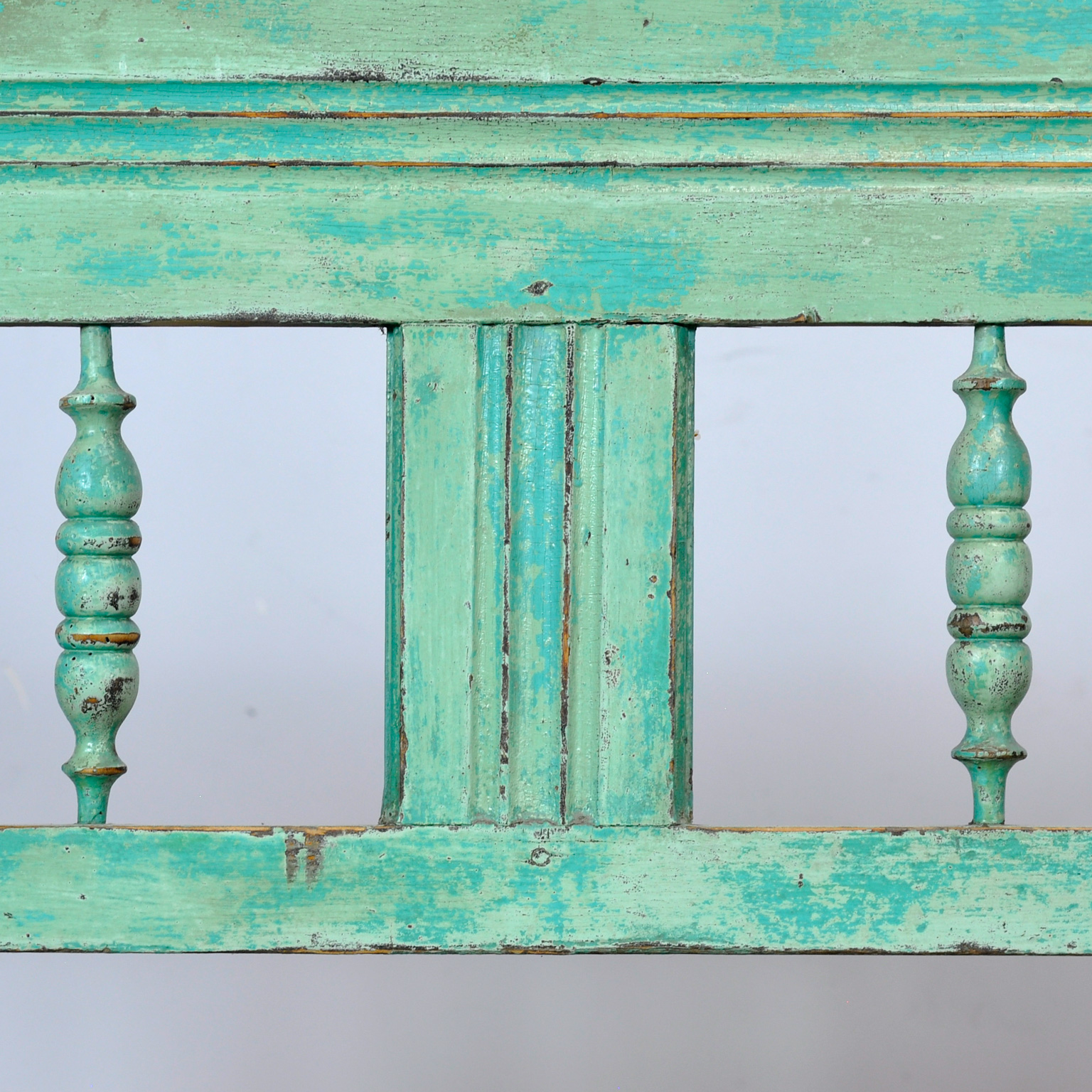 A charming bench from Hungary with the original paint. Over time and use, the paint has worn away in places, down to the wood. It features storage space under the seat, divided into three compartments.