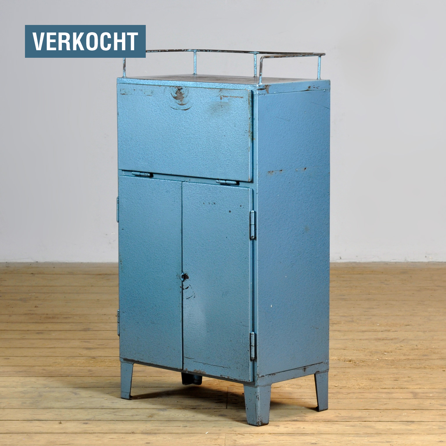 Bring a touch of vintage industry to your interior with this robust 1970s cabinet. Made of iron and finished in a blue hue with authentic signs of wear, this piece exudes character and history. The cabinet features four practical drawers, a spacious compartment with an interior shelf, and a flap on the bottem – perfect for storing tools, papers, or home accessories. Thanks to its compact size, it fits effortlessly in any space: from living room and hallway to workshop or office. Finished with rust-resistant oil.