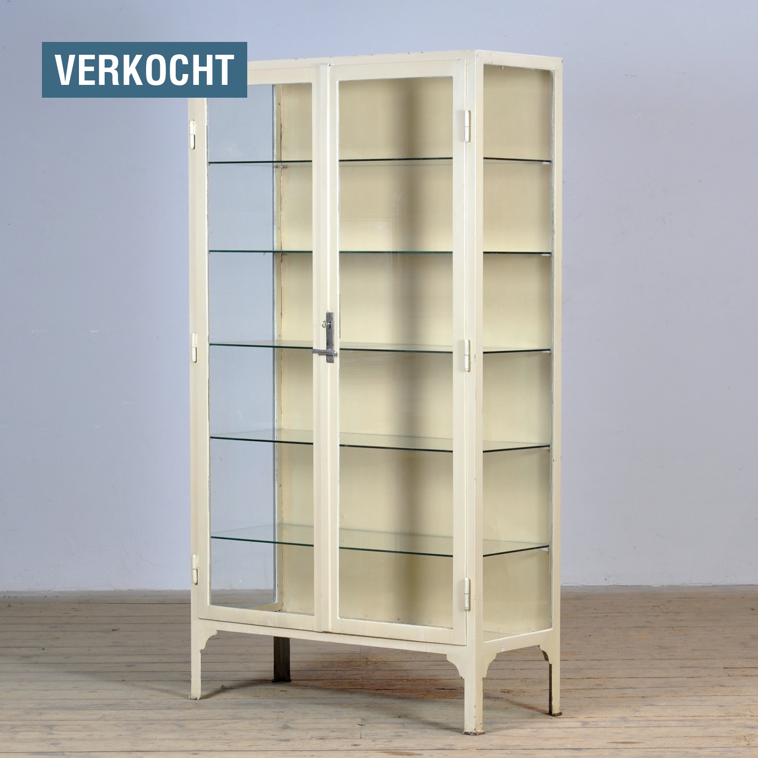 Medical cabinet from the 1930s with the original lock and handle. This display cabinet is made of iron with glass shelves, ideal for displaying or storing your most beautiful items. Combining industrial charm with timeless elegance, it fits perfectly in both modern and vintage interiors. A unique piece with character and history. The cabinet still has its original antique glass except for one side.