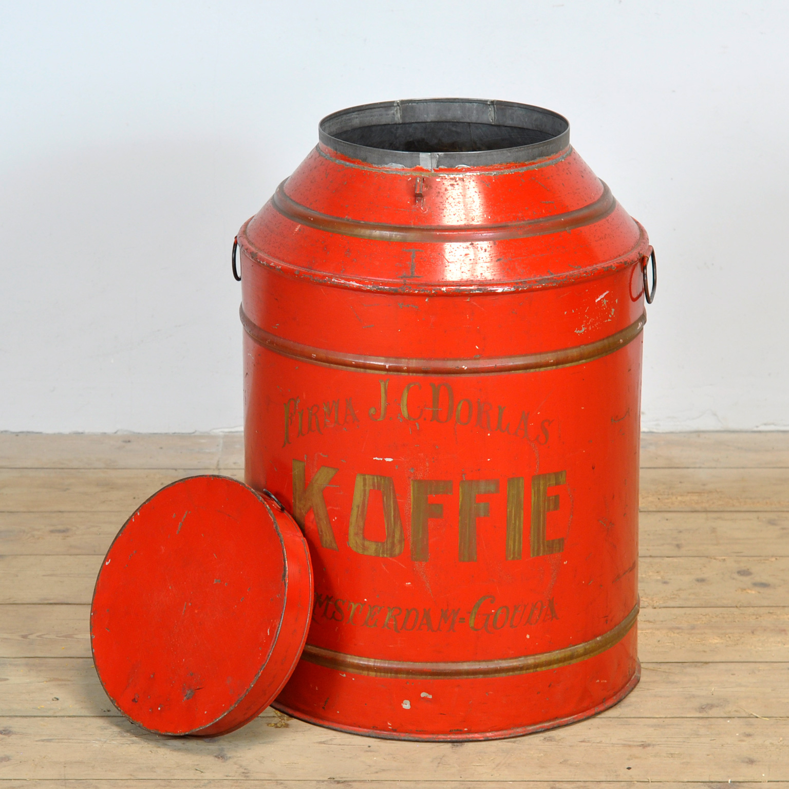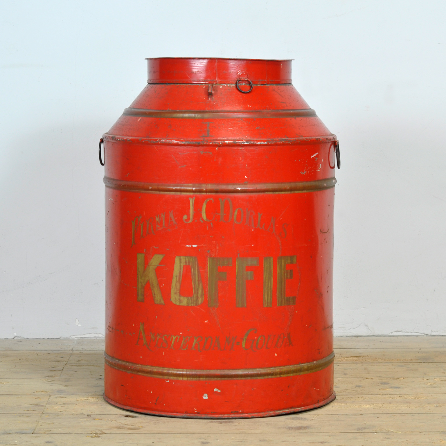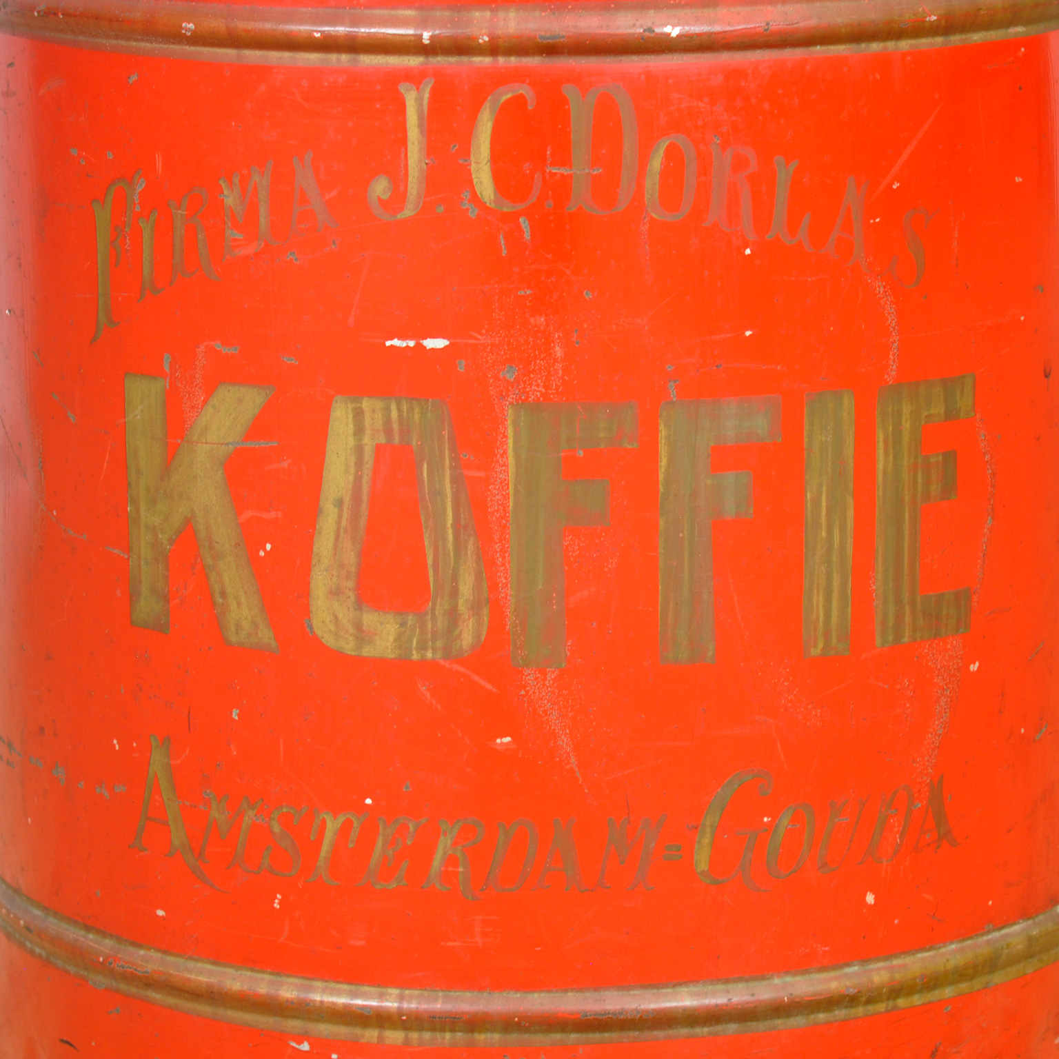 The tin is made of sturdy metal and has a striking red color with the imprint “J.C. Dorlas – KOFFIE – Amsterdam-Gouda.” The Dorlas company was located in Gouda until 1926. It is in used condition, with authentic signs of wear that contribute to its vintage look and character. At 64 centimeters tall, this is an impressive and atmospheric piece.