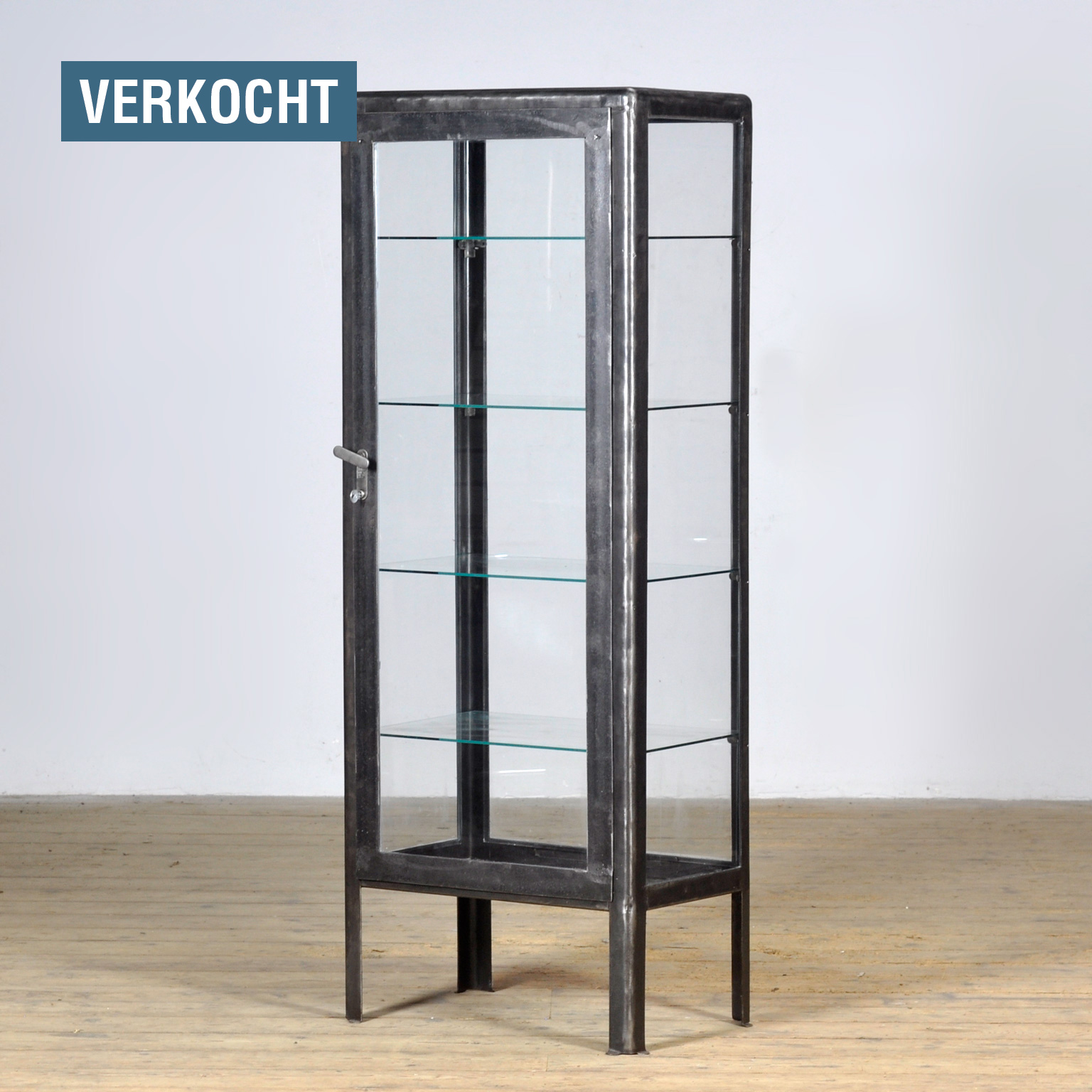 This medical cabinet from Ukraine is a single piece with glass on all four sides, allowing your items to be beautifully displayed. The metal frame is completely stripped of paint, creating a rugged, industrial look. The lock features the inscription CCCP 1963, a unique historical detail that adds to the cabinet’s charm. With its glass shelves and solid construction, this is the perfect piece for stylishly displaying your items.
