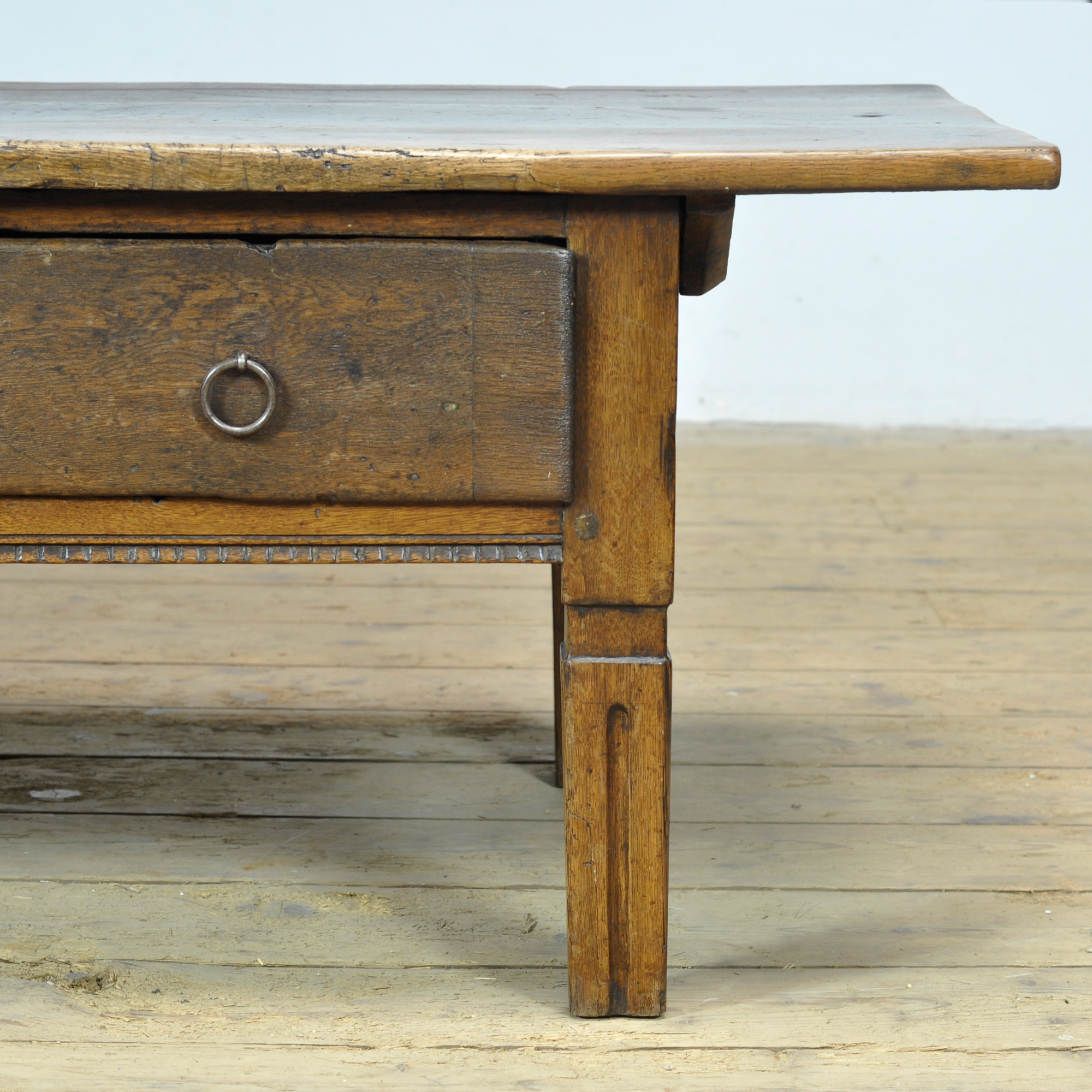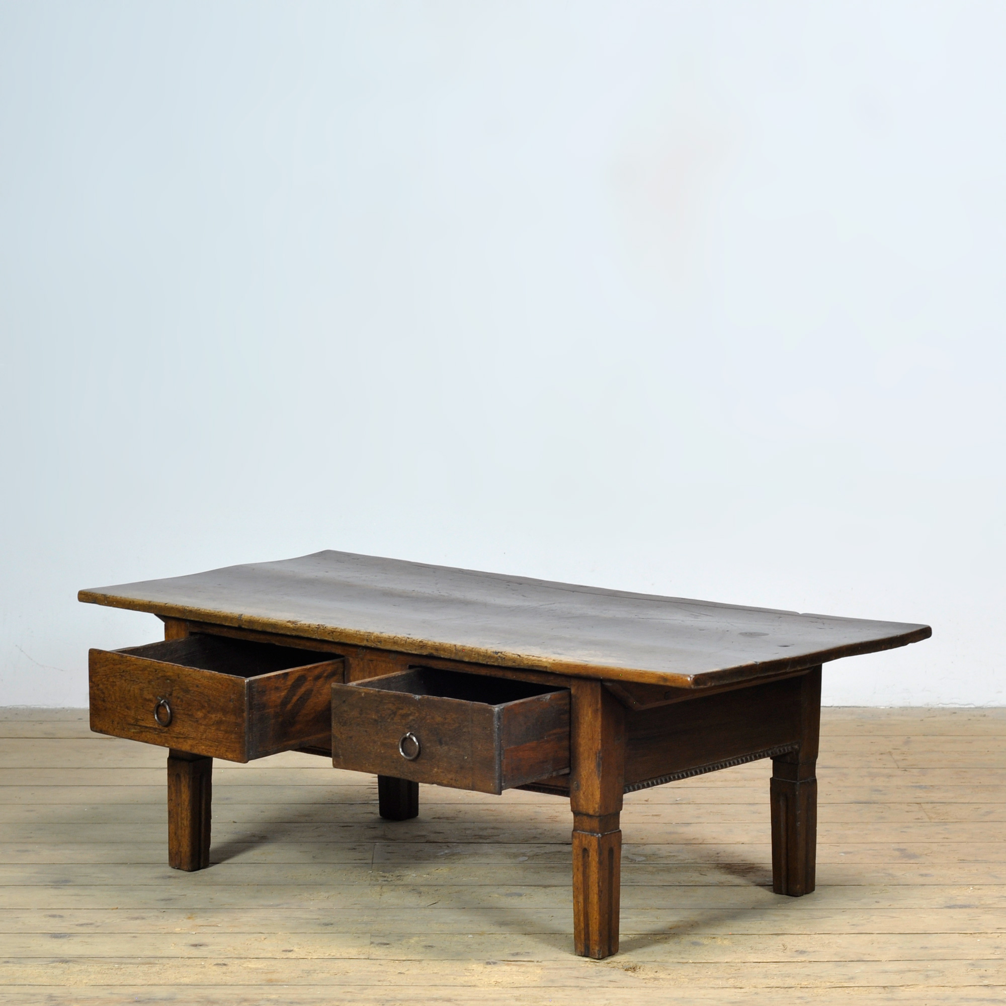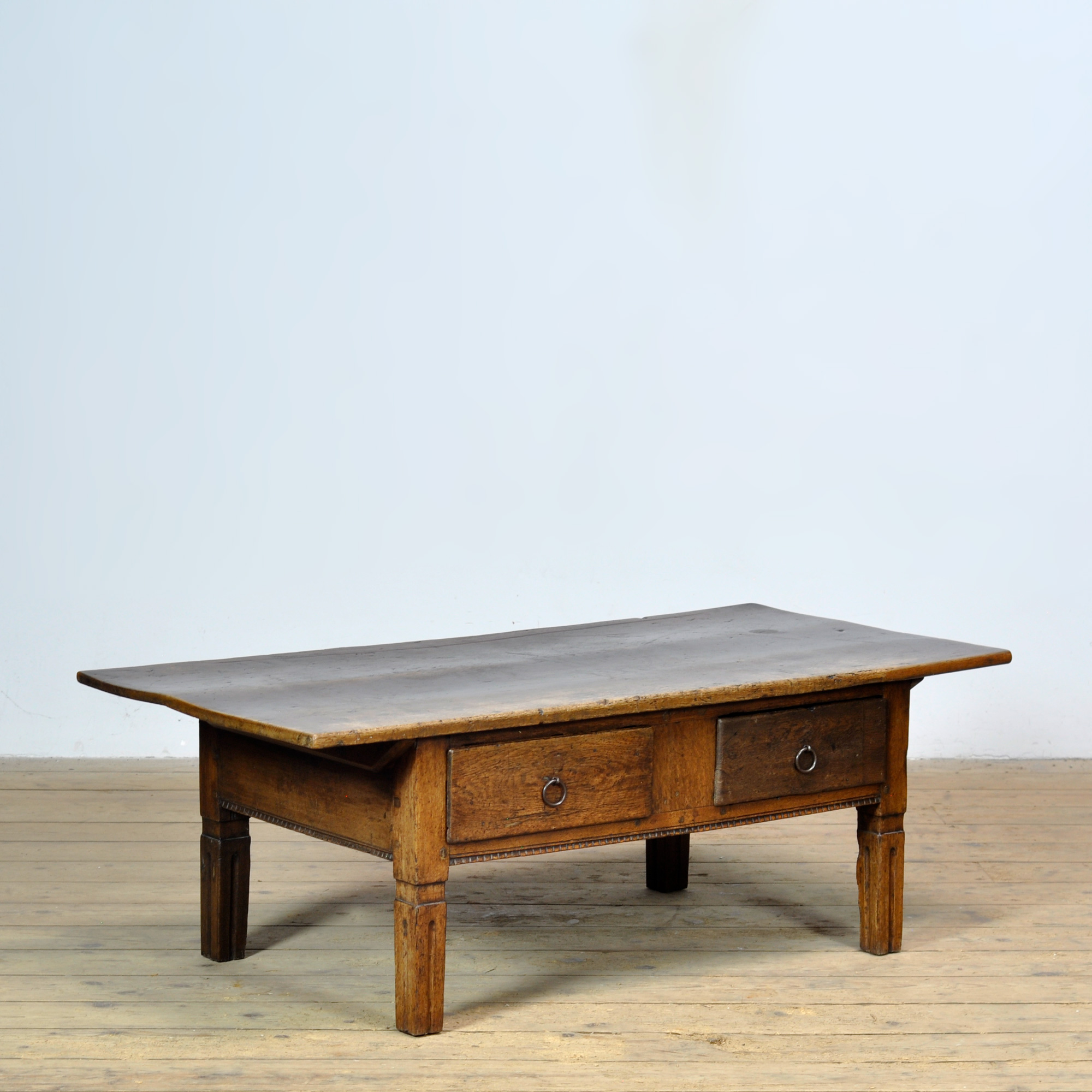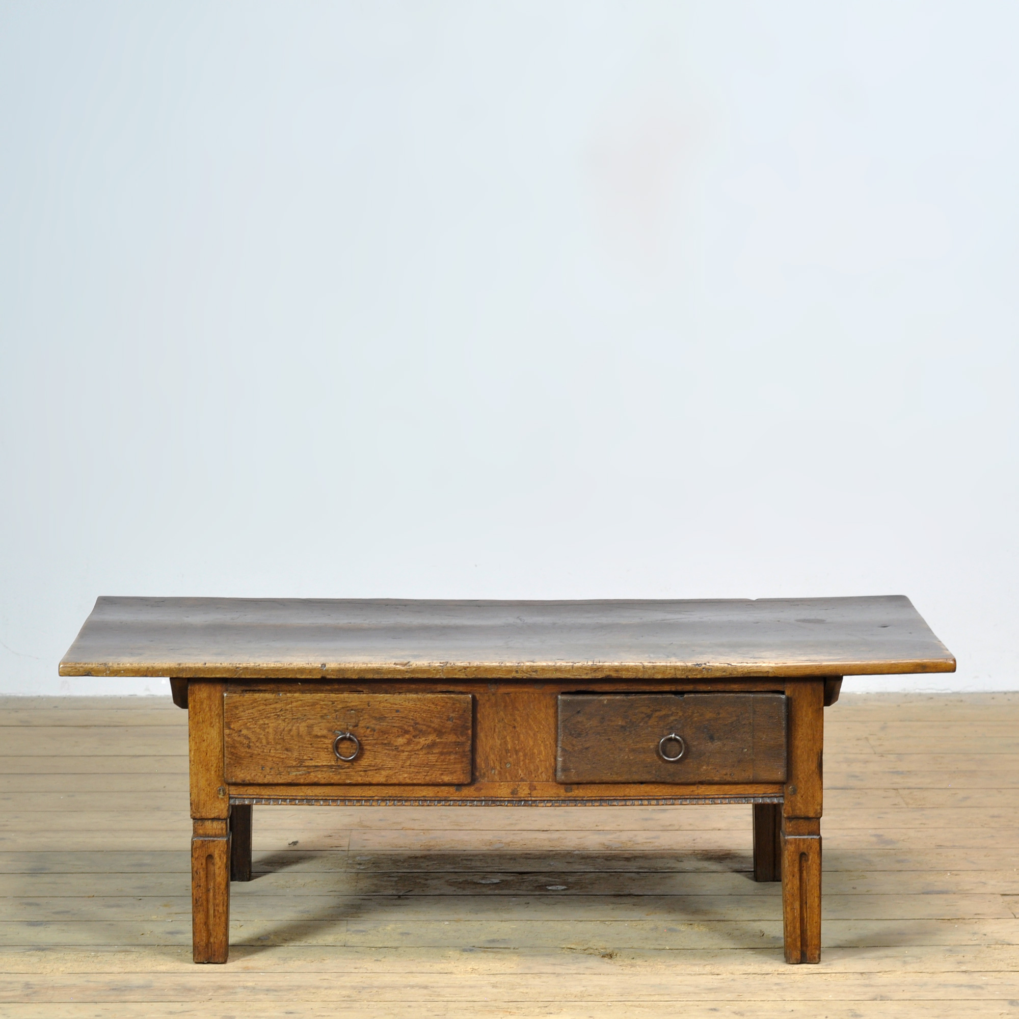 This oak coffee table, dating from circa 1820, is a special and characterful piece of furniture that beautifully reflects the craftsmanship of its time. Crafted from solid oak, the table has developed a warm, lived-in appearance over the years that contributes to its unique charm. The table features two drawers, traditionally constructed with dovetail joints. The drawers retain their original fittings, underscoring the historical integrity and authenticity of the piece.