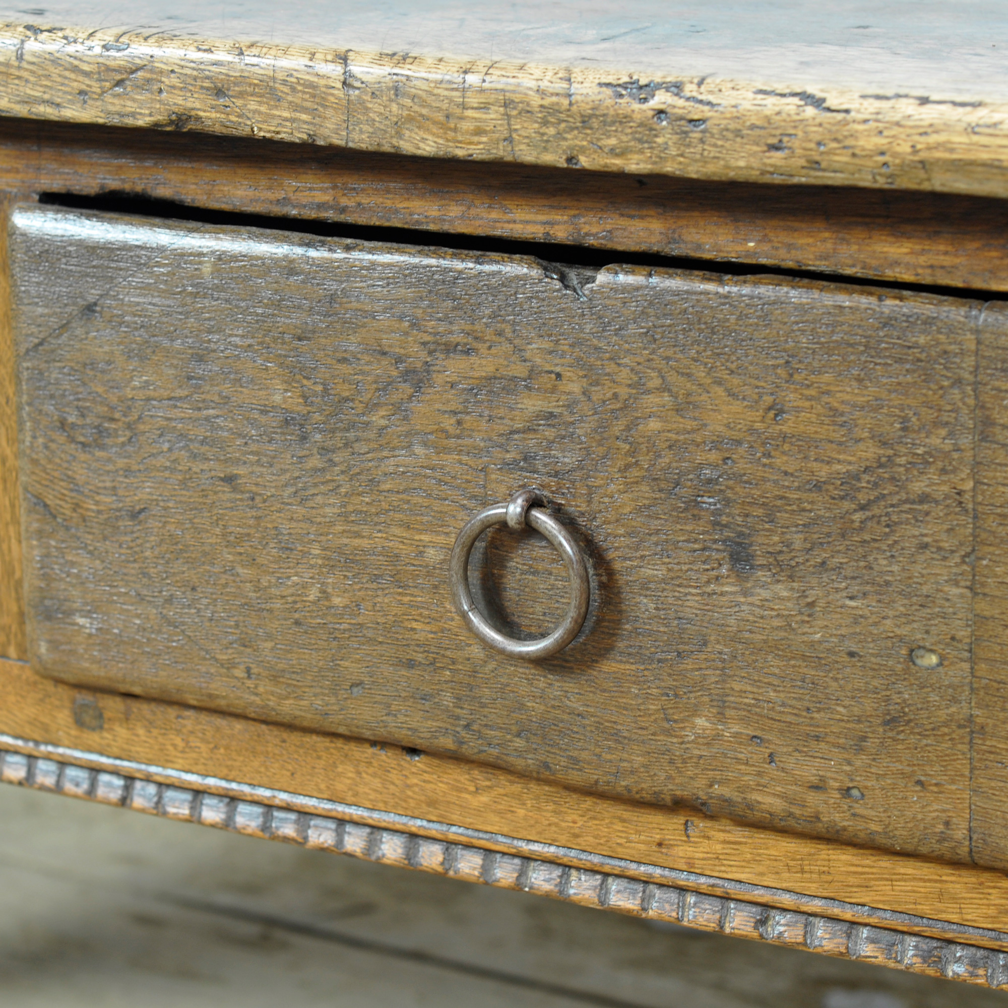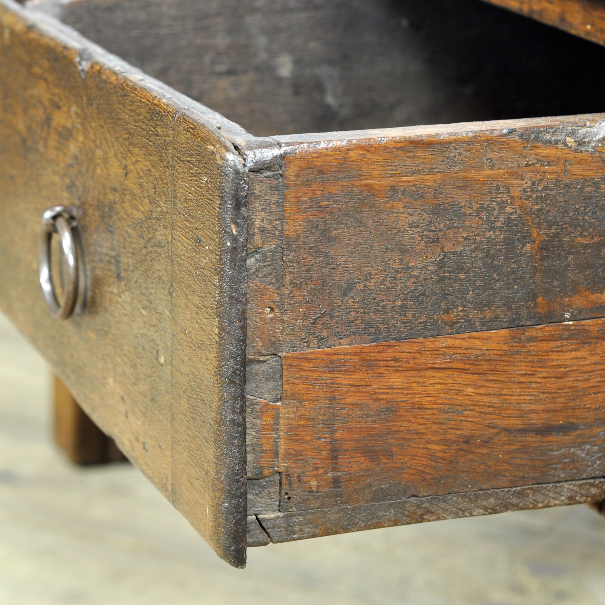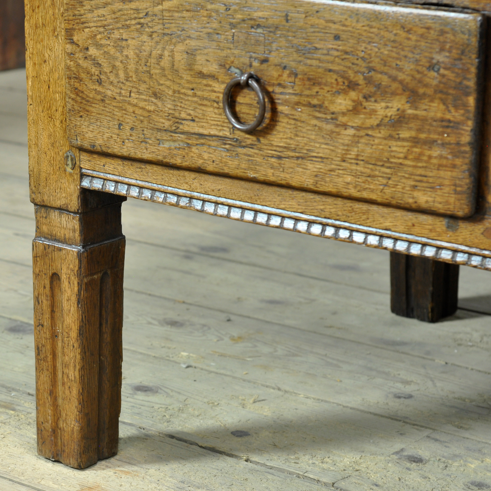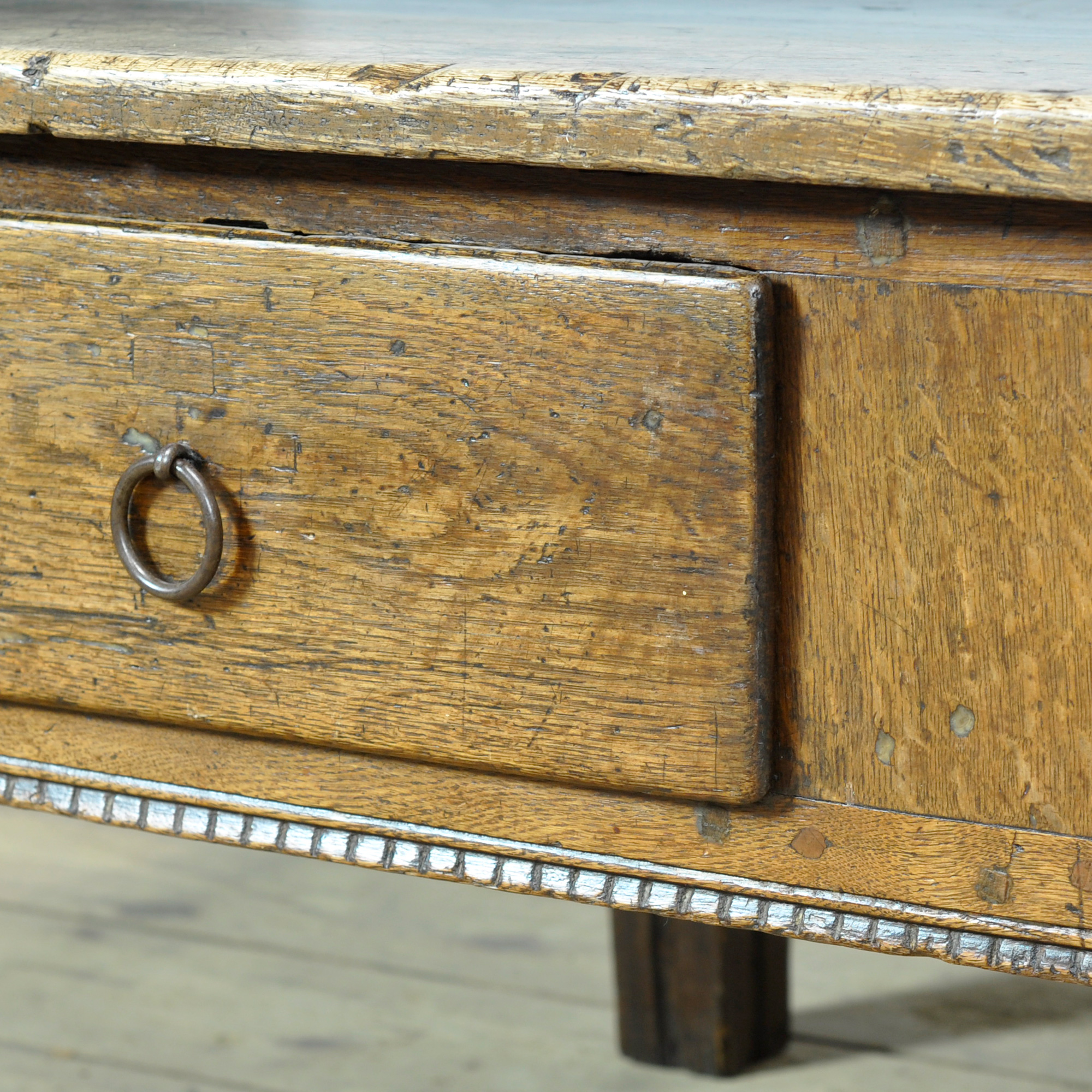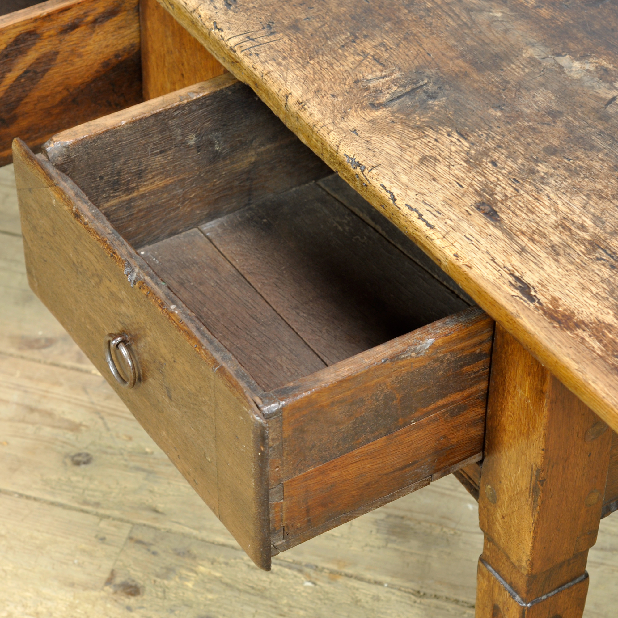 This oak coffee table, dating from circa 1820, is a special and characterful piece of furniture that beautifully reflects the craftsmanship of its time. Crafted from solid oak, the table has developed a warm, lived-in appearance over the years that contributes to its unique charm. The table features two drawers, traditionally constructed with dovetail joints. The drawers retain their original fittings, underscoring the historical integrity and authenticity of the piece.