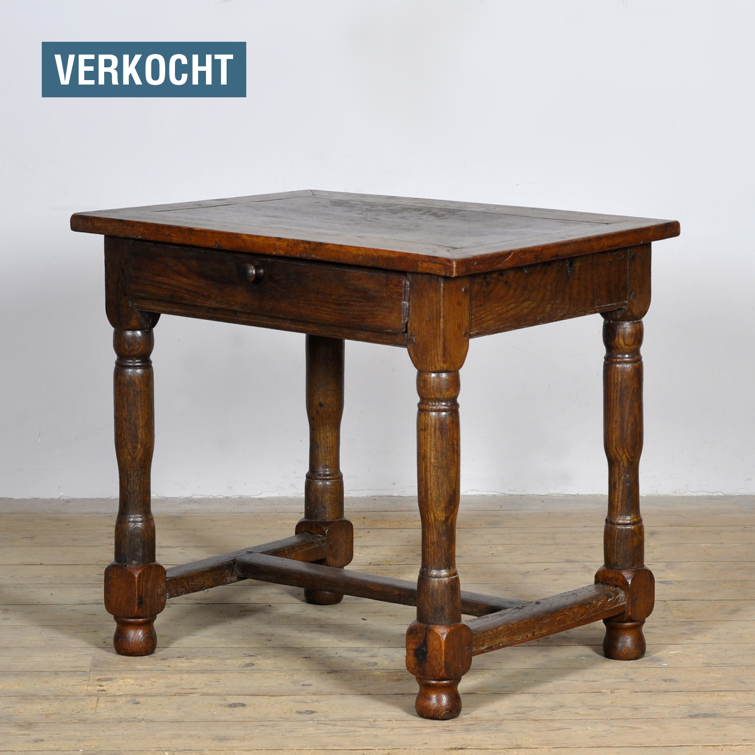 Authentic oak pay table from the 17th/18th century, with distinctive signs of wear that testify to its long history. Beneath the top is a drawer with the original wooden knob. The table rests on four beautifully turned legs, connected by a sturdy H-shaped crossbar, providing extra stability and a robust, balanced silhouette. The warm patina and natural wear give this piece a charming and authentic appearance.