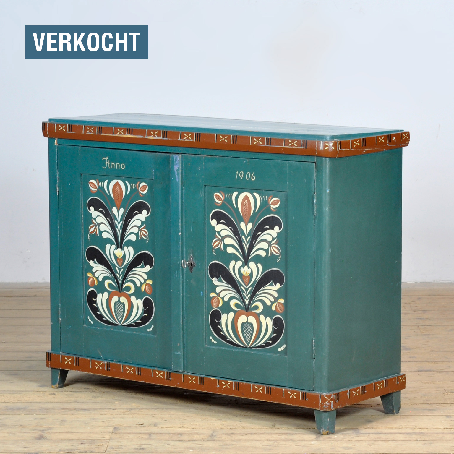 Original antique Swedish cabinet with blue-green folklore-style painting, dated 1906