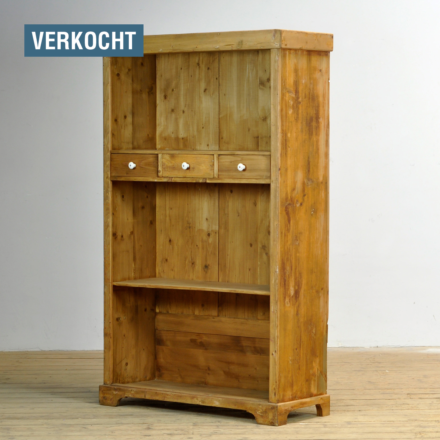 Pine cabinet with two shelves and three drawers. The cabinet was made around 1930.