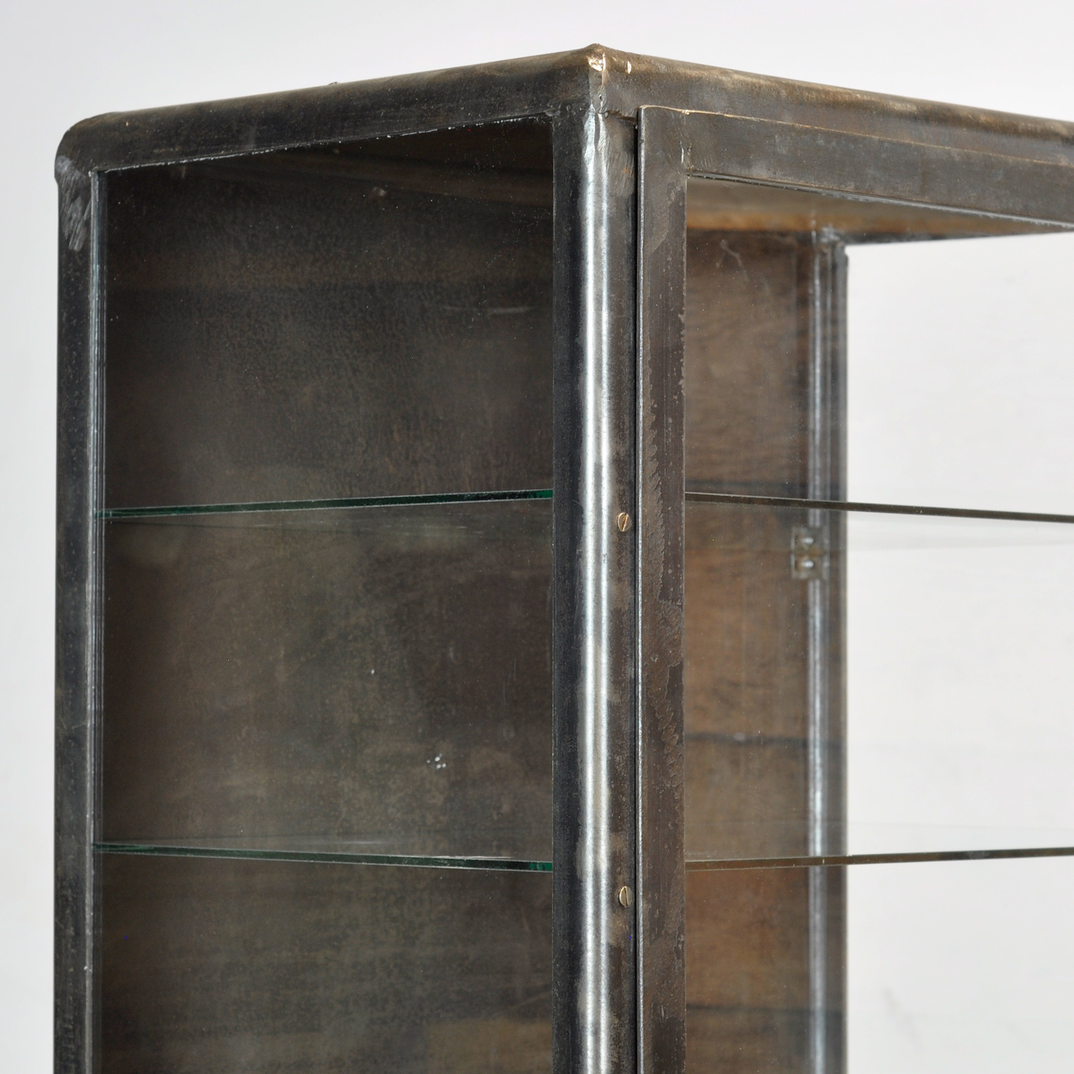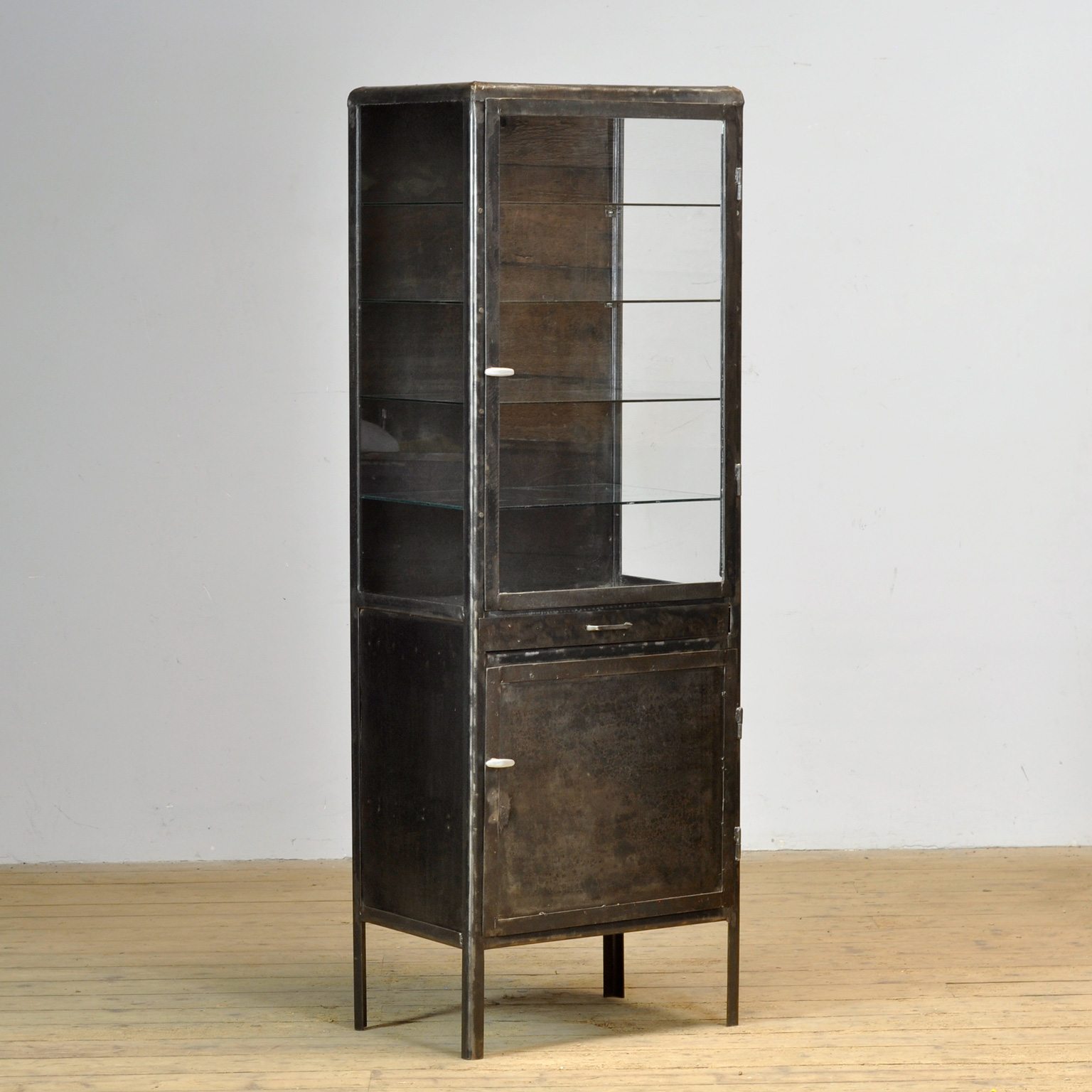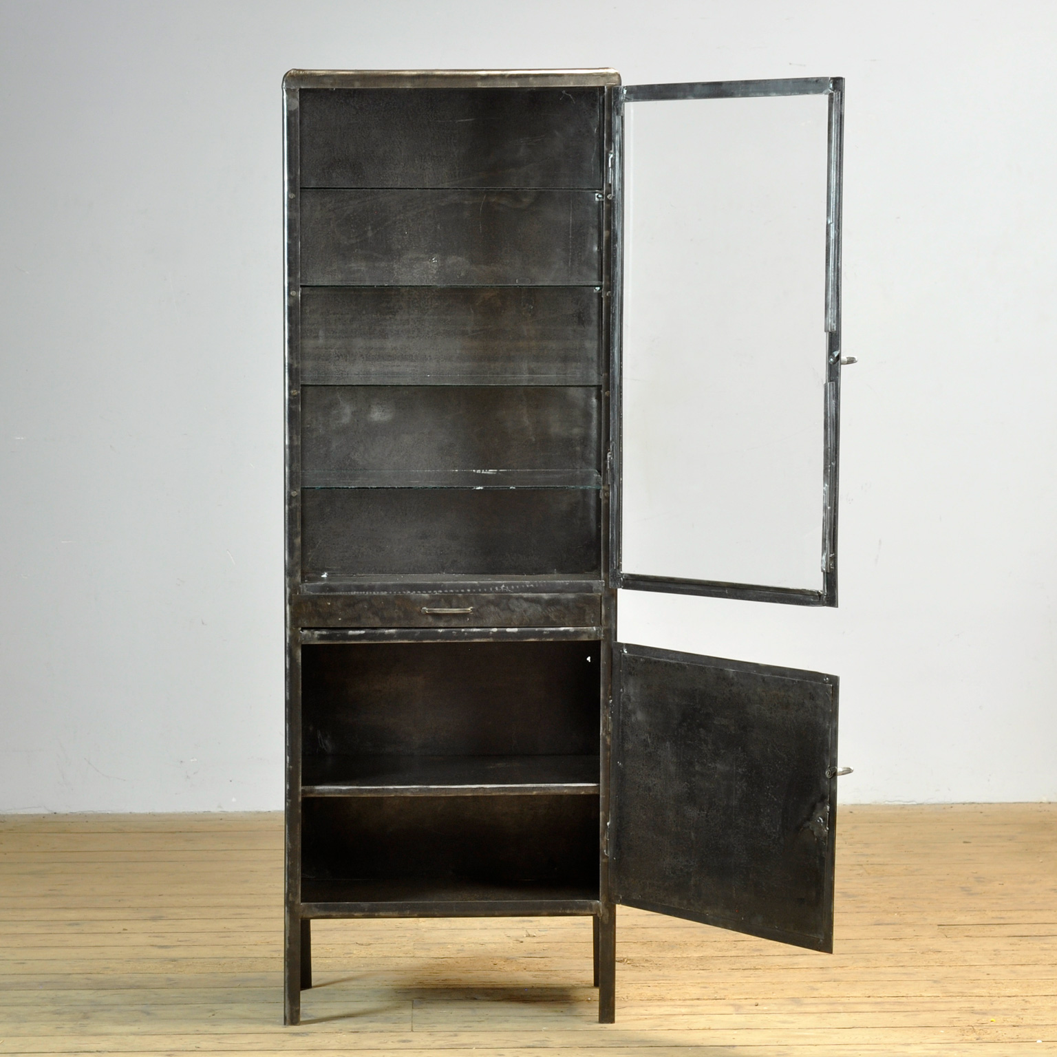 Medicine cabinet from the 1950s, manufactured in former Yugoslavia. This cabinet is made of iron and glass, creating a rugged industrial look. The cabinet has been stripped down to the metal and finished with an anti-rust oil, preserving its authentic character. Thanks to the four glass shelves, the cabinet offers ample space for displaying tableware, glassware, or collectibles. With its robust appearance, this medicine cabinet is not only functional but also a real eye-catcher in any interior — from industrial to modern.
