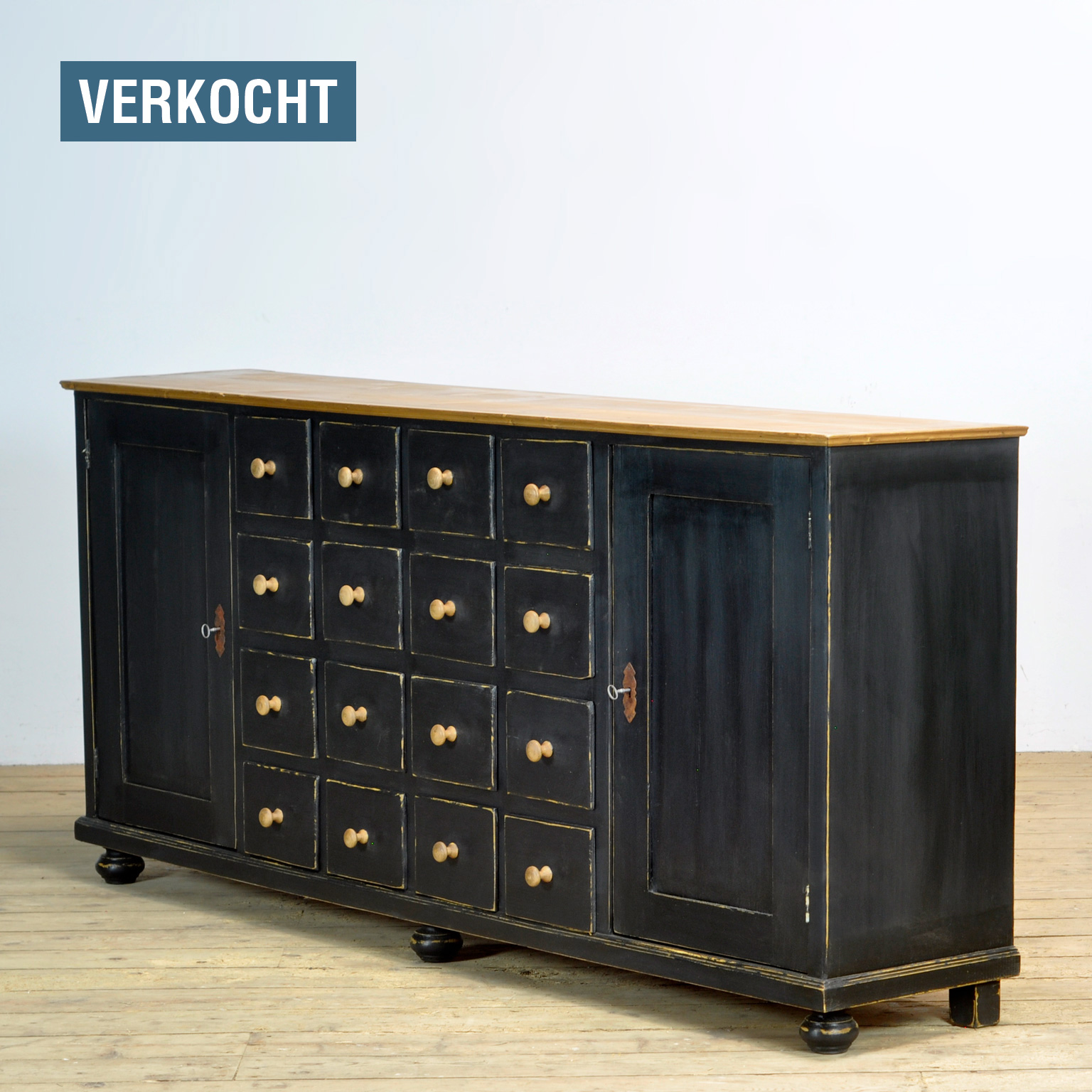 Pine dresser base from around 1920 with 16 drawers and two doors with 2 shelves behind them. Repainted in a rustic style. The entire cabinet is assembled with dovetail joints. The sideboard is in restored condition.