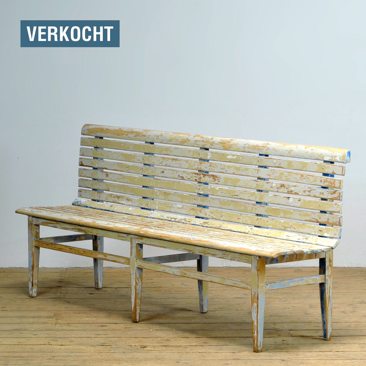 Bench made of pine wood in the 1940s. This bench was located at a train station in Debrecen, Hungary.