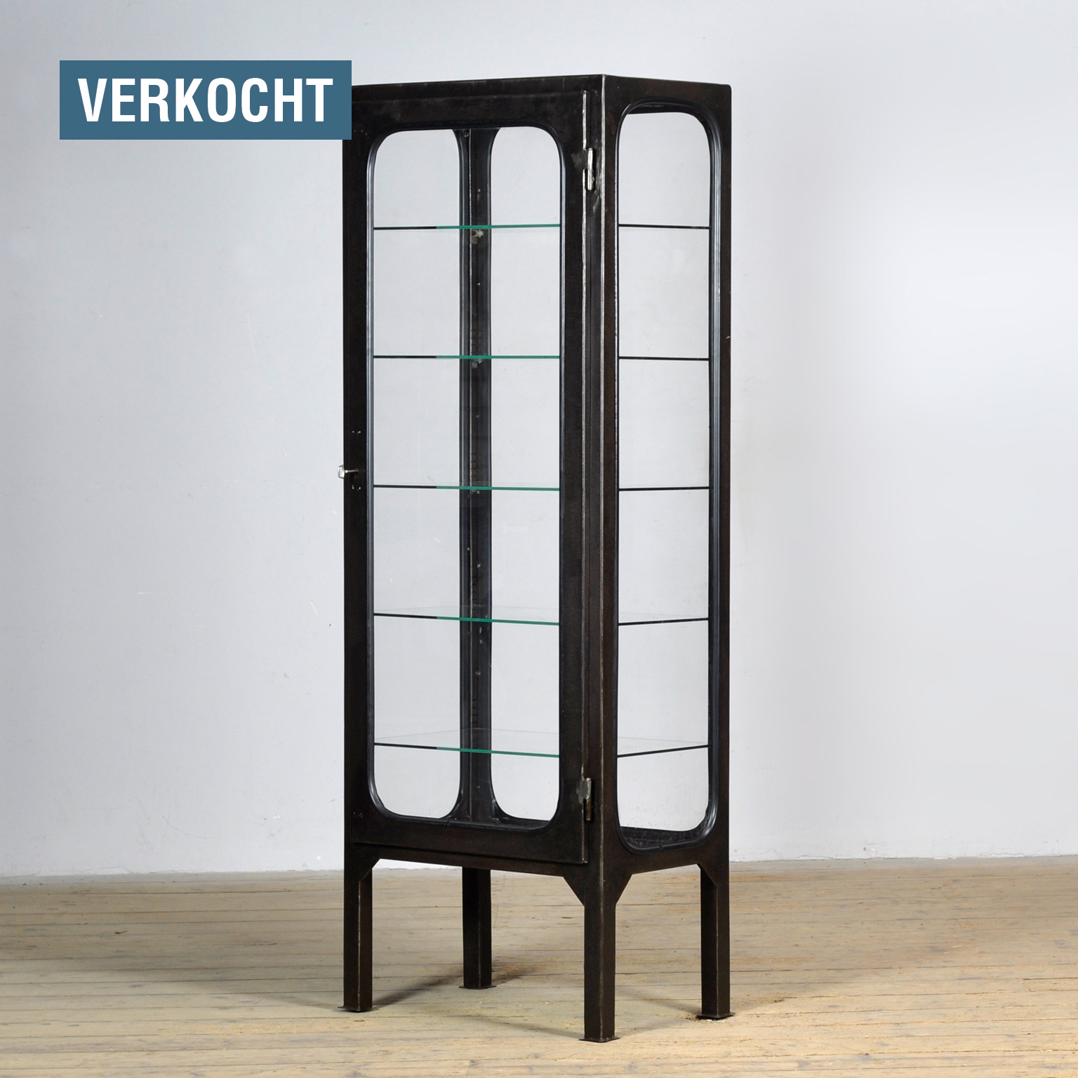 Vintage medicine cabinet from the 1970s, made in Hungary. This cabinet is a real eye-catcher thanks to its industrial design and all-glass walls on all four sides. Made of iron and glass, the glass is firmly clamped to the frame with rubber strips. The cabinet is stripped down to the metal and then finished with a clear lacquer, preserving its original industrial look. The cabinet comes with five adjustable glass shelves, ideal for stylishly displaying objects, tableware, or collectibles. The surrounding glass allows plenty of light to enter, beautifully showcasing the contents.