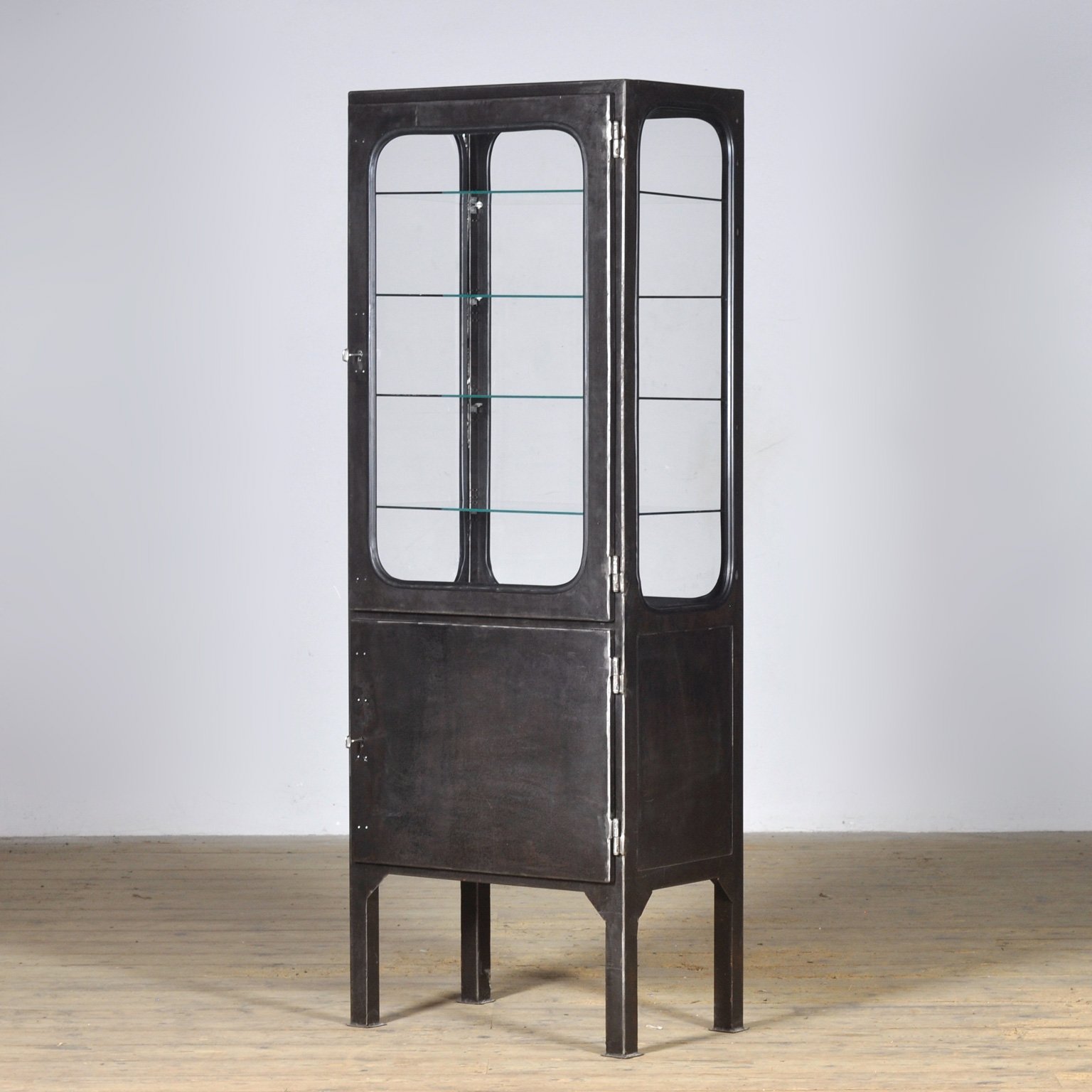 Vintage medicine cabinet from the 1970s, made in Hungary. This cabinet is a real eye-catcher thanks to its industrial design and all-glass walls on all four sides. Made of iron and glass, the glass is firmly clamped to the frame with rubber strips. The cabinet is stripped down to the metal and then finished with a rust-resistant oil, preserving its original industrial look. The cabinet comes with four adjustable glass shelves, ideal for stylishly displaying objects, tableware, or collectibles. The glass surround allows plenty of light to enter, beautifully showcasing the contents.