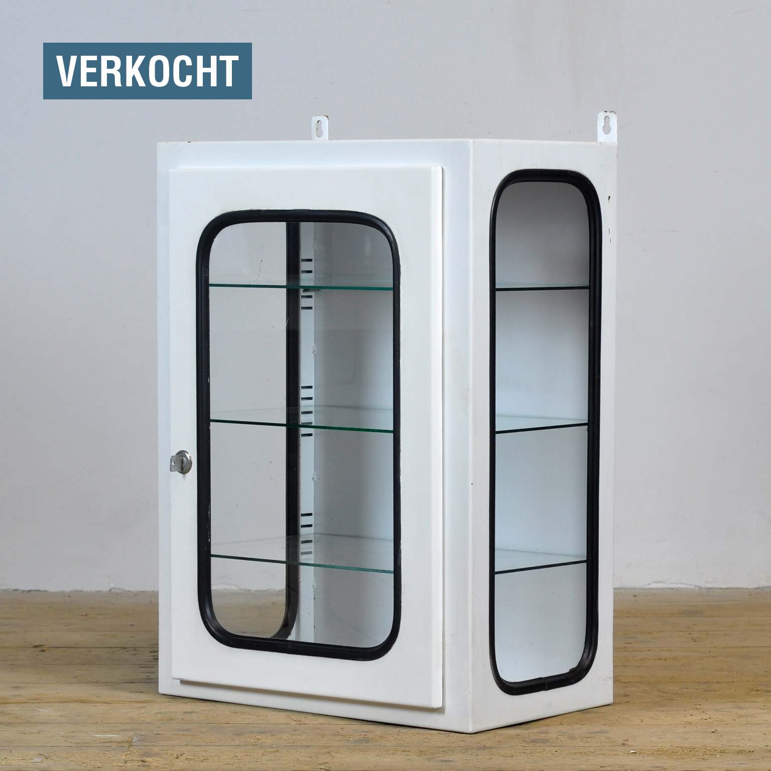 Medicine cabinet (wall unit) from a hospital. Made of iron and glass that is clamped into the steel by a rubber strip. This cabinet comes from the 70s and was produced in Hungary. With 3 adjustable glass shelves.