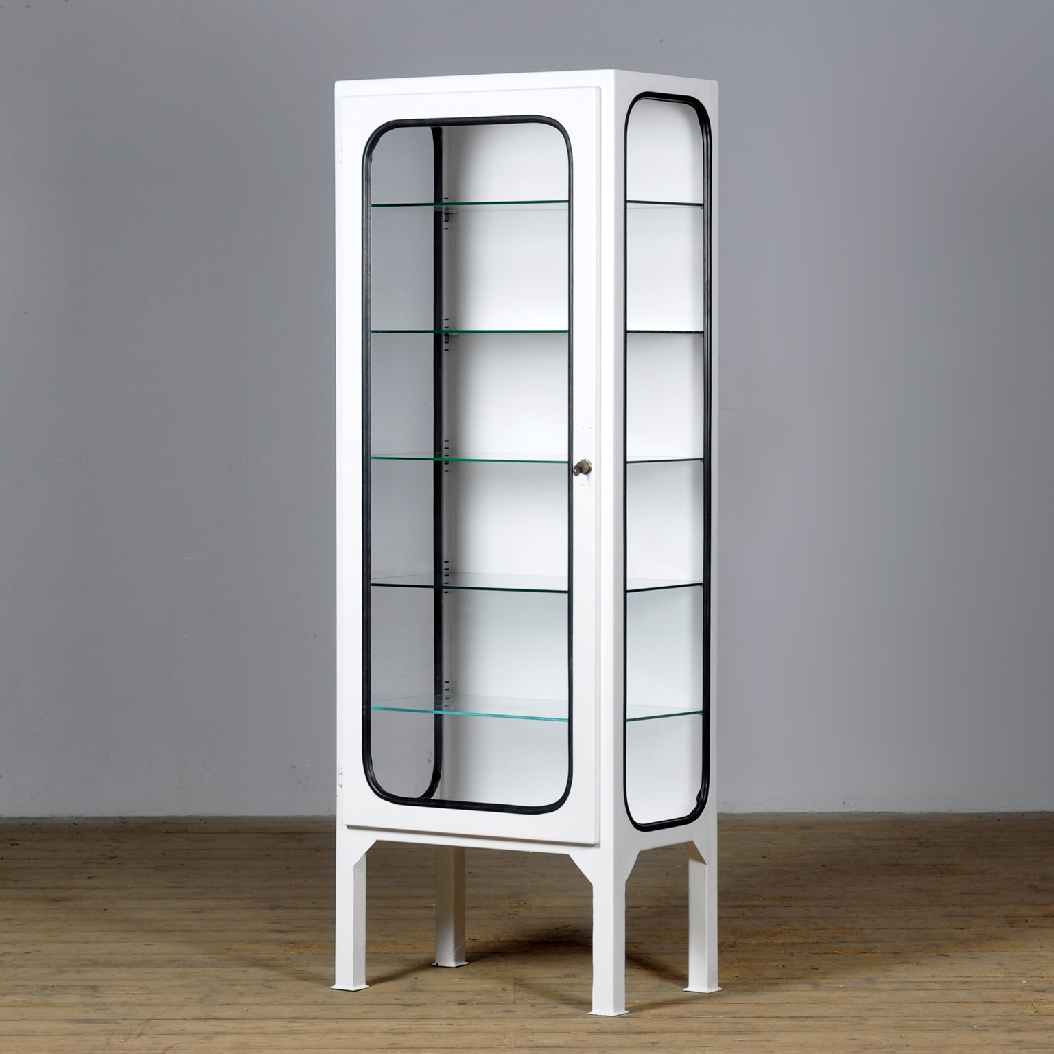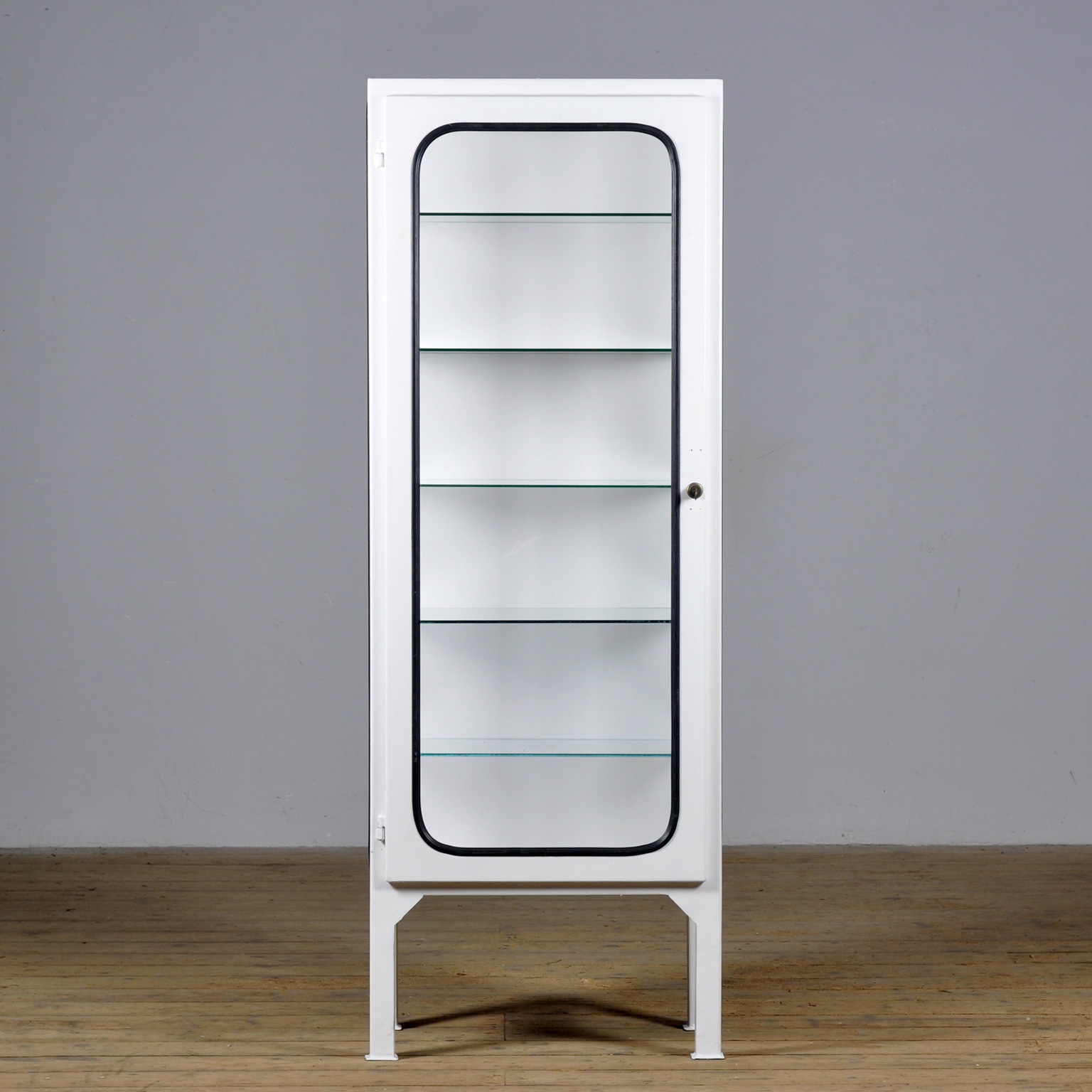 Vintage medical cabinet from the 1970s, made in Hungary. This characterful cabinet is made of iron and glass, with the glass secured to the steel with a rubber strip. The cabinet has a sleek, timeless design and fits perfectly in an industrial, modern, or mid-century interior. Equipped with a well-functioning lock and key, it’s ideal for storing tableware, collectibles, or designer pieces. The cabinet comes with five adjustable glass shelves, allowing you to easily customize the layout. A unique and functional eye-catcher with an authentic vintage look.