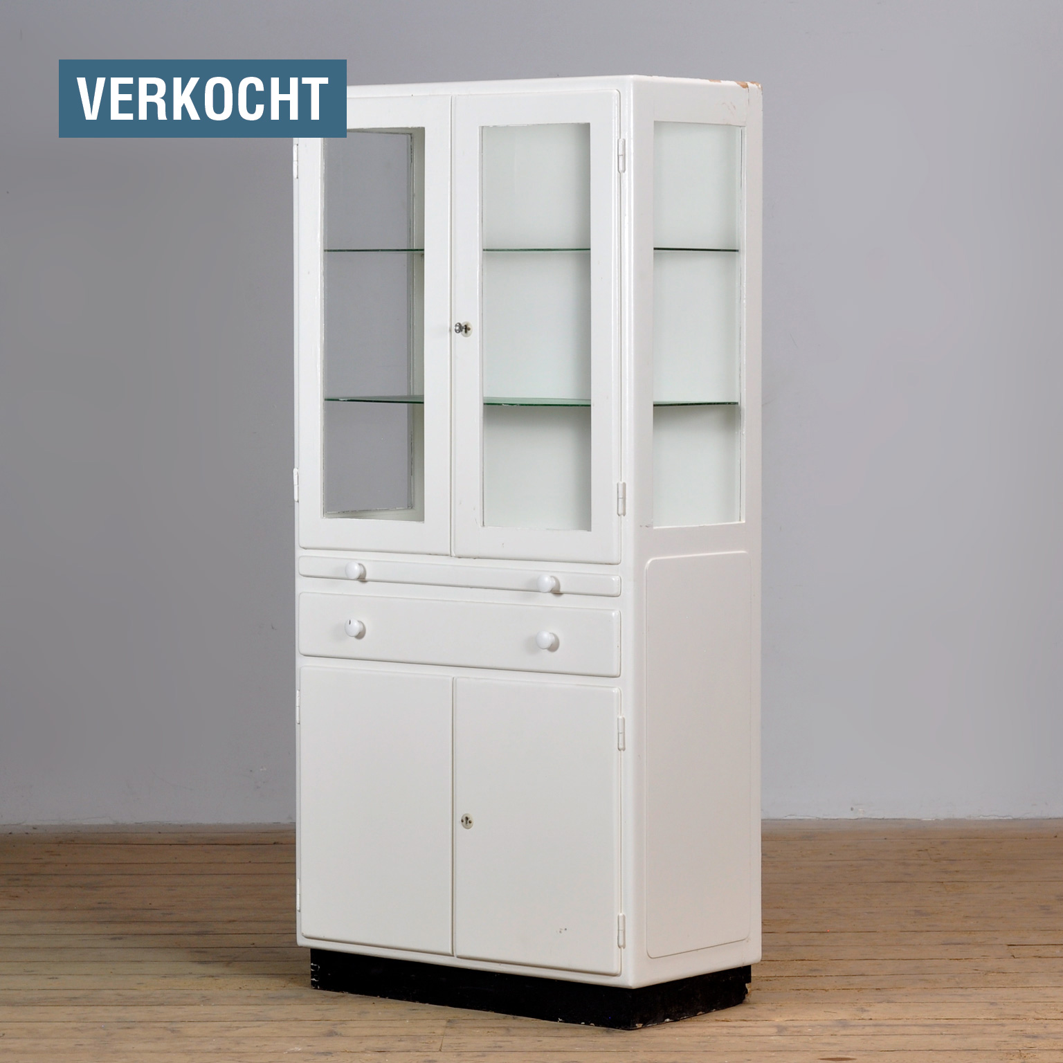 Wooden medical cabinet from the 1950s. The upper section features two original ribbed glass shelves with a pull-out shelf underneath. The lower section offers storage space and a drawer. The cabinet retains its original antique glass.