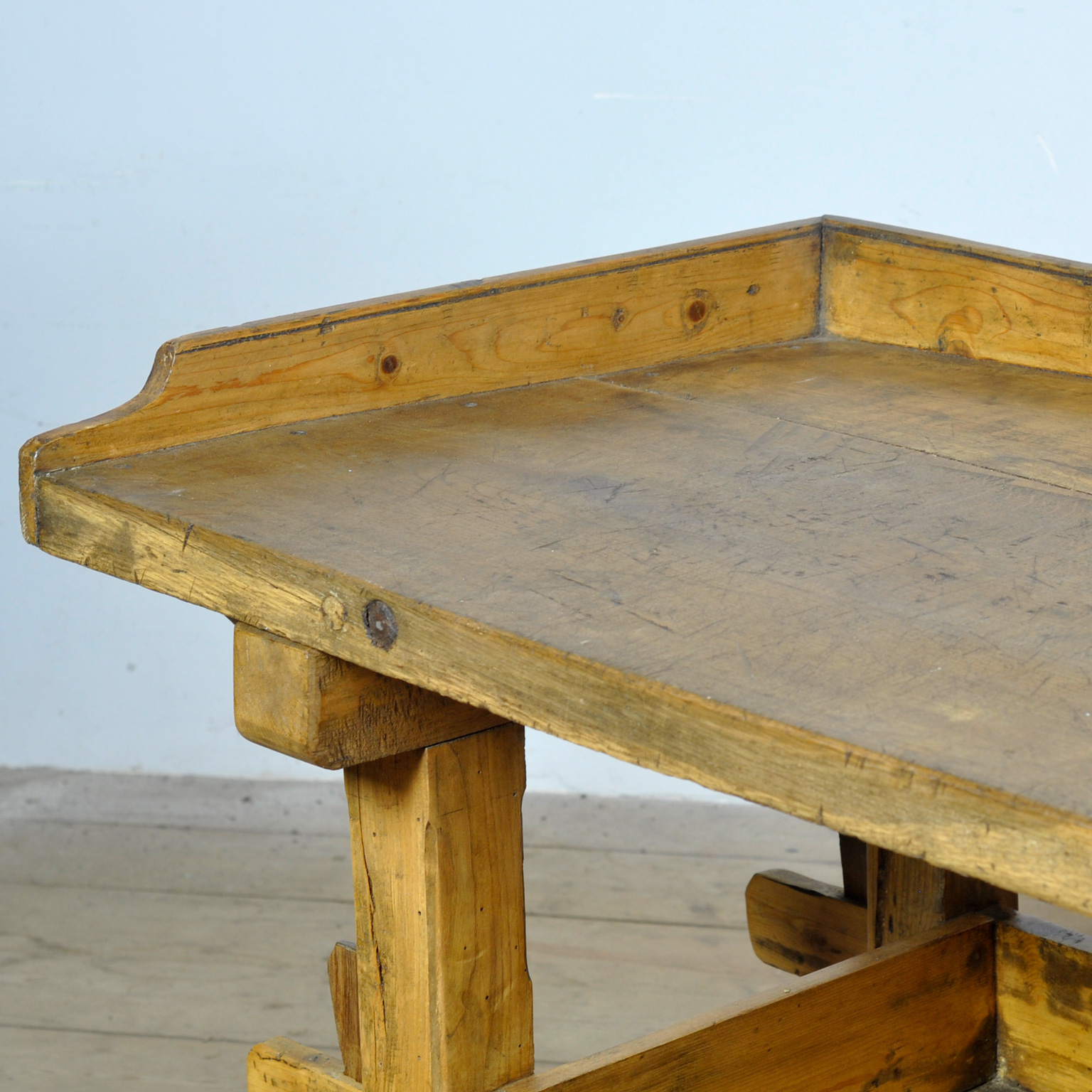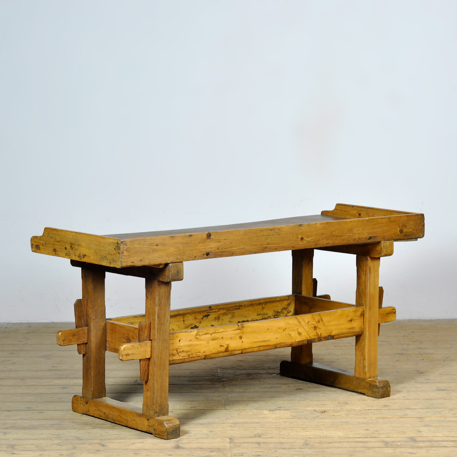 Deze werkbank, vervaardigd circa 1900, combineert de robuustheid van eikenhout met de warme uitstraling van grenen. Het meubel toont een eerlijke patina, ontstaan door jarenlang gebruik in een werkplaats, keuken of bakkerij, en straalt daardoor karakter en geschiedenis uit. De solide constructie, met stevige poten en een praktisch onderstel, biedt stabiliteit en functionaliteit. Het ruime blad met opstaande rand maakt het geheel bijzonder geschikt voor decoratief en gebruiksdoeleinden. Deze werkbank vormt een stijlvolle aanvulling in zowel klassieke als moderne interieurs en is tevens inzetbaar als presentatiemeubel of werktafel. Een tijdloos object dat authenticiteit en ambacht op elegante wijze benadrukt.