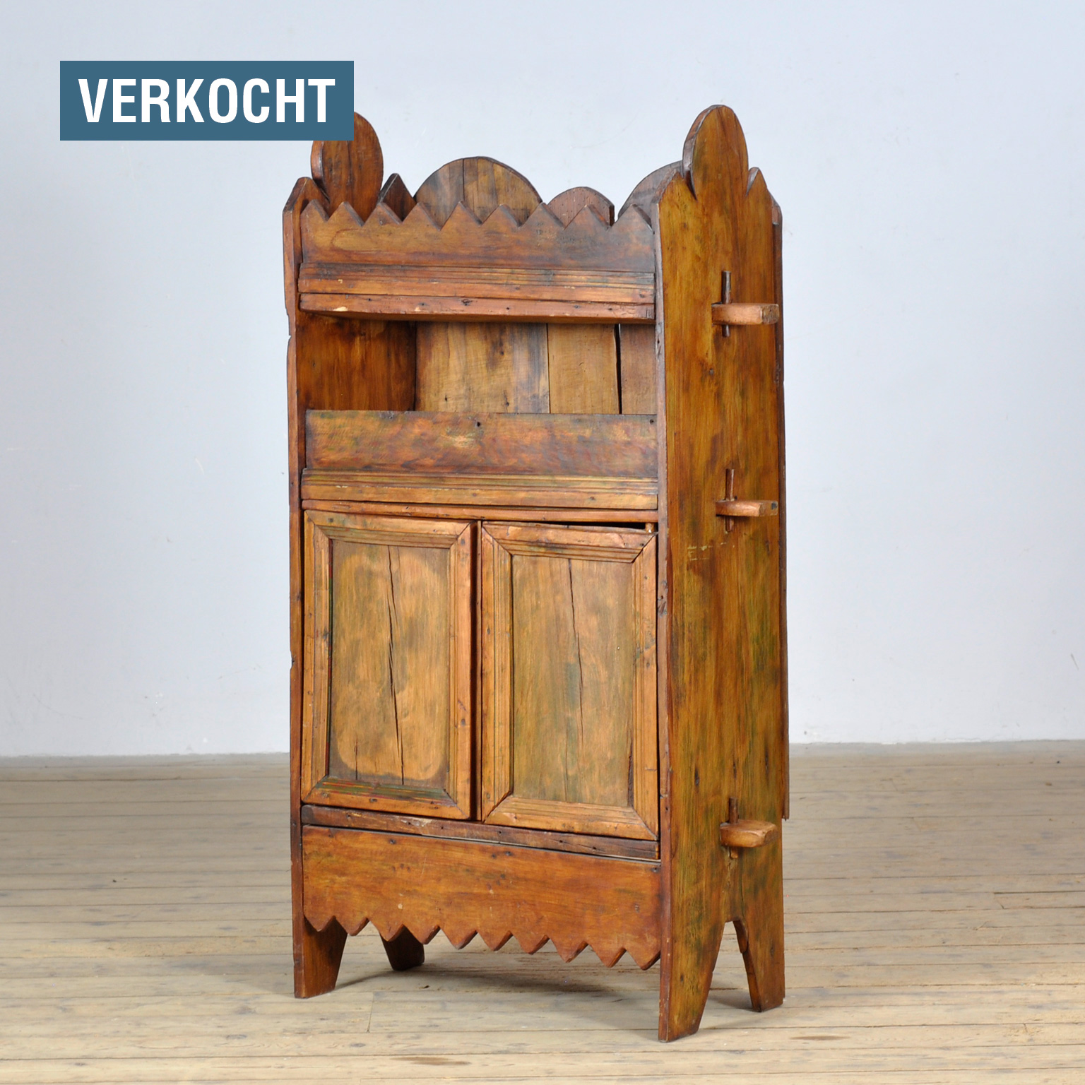 Rustiek Wabi Sabi kastje gemaakt van massief beuken in Italie, circa 1800. Deze kast biedt voldoende ruimte om verschillende items op te bergen. Aan de voorzijde twee planken en een opbergruimte achter de twee deurtjes. Ideaal als gang kastje. Dit stuk is in goede originele staat en weerspiegelt een warm en gezellig gevoel, ideaal om uw interieur extra karakter te geven.