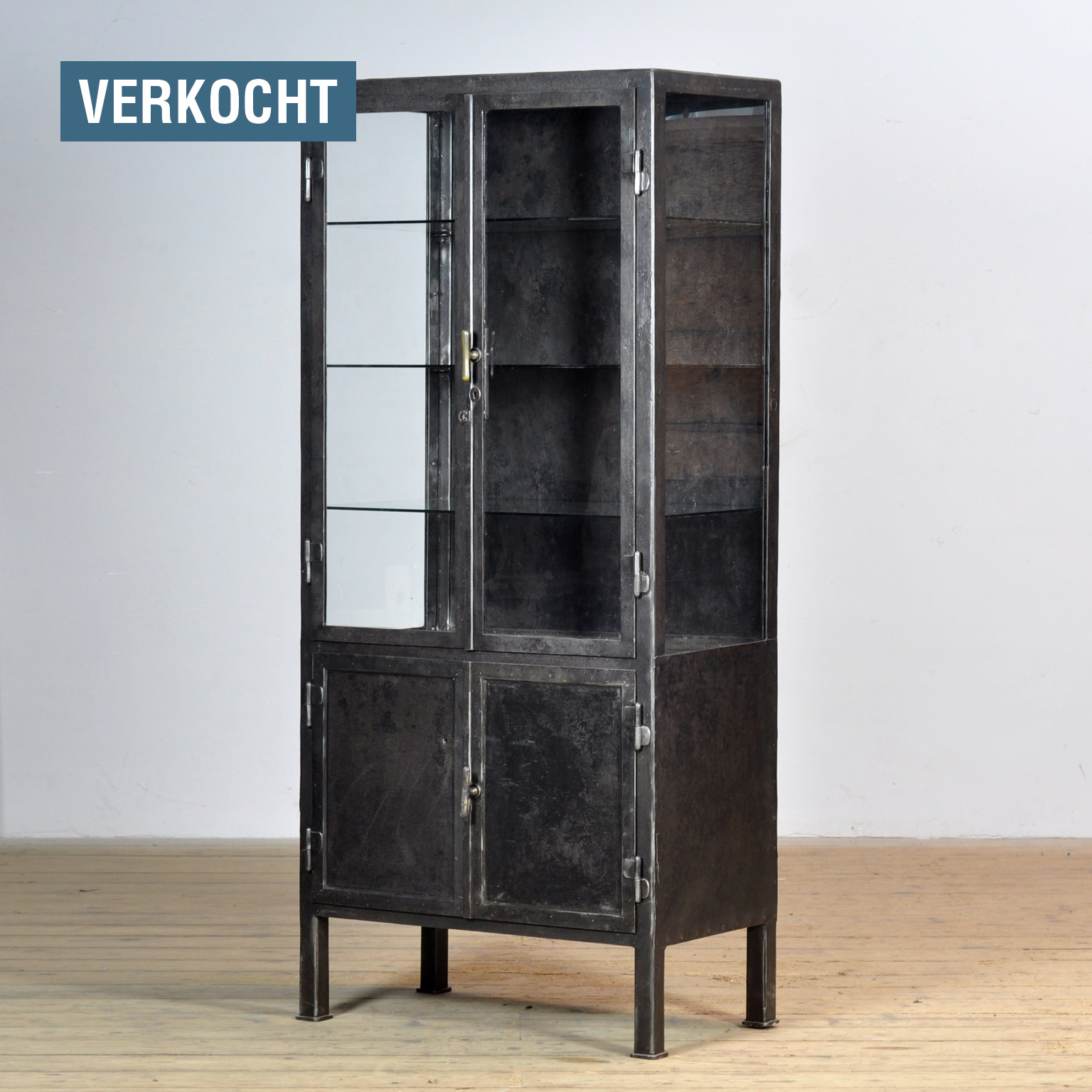 Originele medicijnkast uit de jaren ’20, vervaardigd in Hongarije. Deze kast is gemaakt van ijzer en glas, wat zorgt voor een stoere industriële uitstraling. De kast is zorgvuldig gestript tot op het metaal en afgewerkt met een roestwerende olie, waardoor het authentieke karakter behouden blijft. Dankzij de drie glazen legplanken biedt de kast volop ruimte voor het stijlvol presenteren van servies, glaswerk of verzamelobjecten. Met zijn robuuste uitstraling en unieke patina is deze medicijnkast niet alleen functioneel, maar ook een echte eyecatcher in elk interieur — van industrieel tot modern.