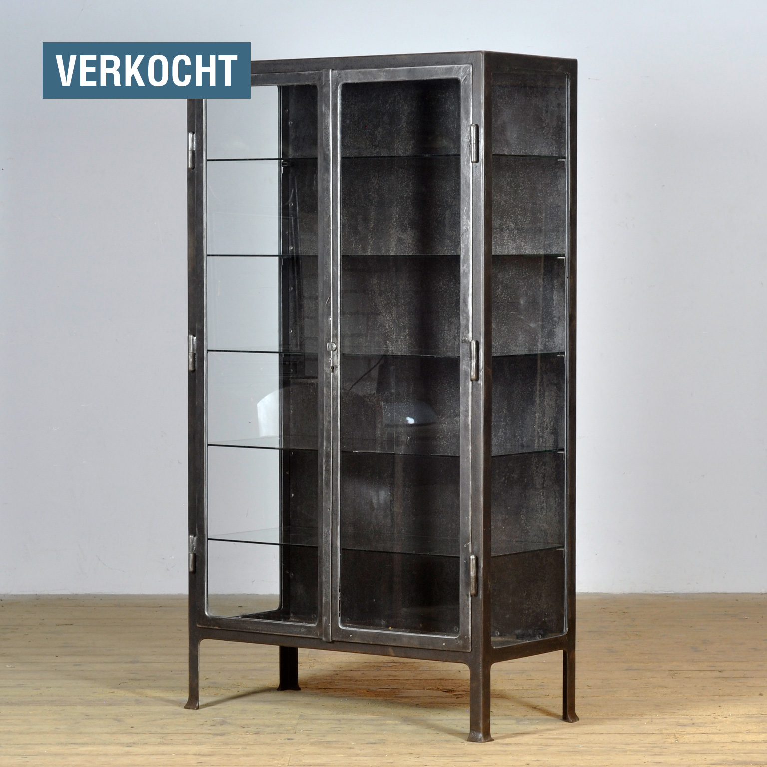 Medicijnkast uit de jaren ’30, vervaardigd in Hongarije. Deze kast is gemaakt van ijzer en glas, wat zorgt voor een stoere industriële uitstraling. De kast is gestript tot op het metaal en afgewerkt met een roestwerende olie, waardoor het authentieke karakter behouden blijft. Dankzij de vijf glazen legplanken biedt de kast volop ruimte voor het presenteren van servies, glaswerk of verzamelobjecten. Met zijn robuuste uitstraling is deze medicijnkast niet alleen functioneel, maar ook een echte eyecatcher in elk interieur — van industrieel tot modern.
