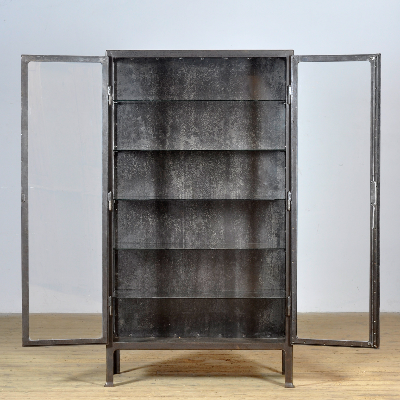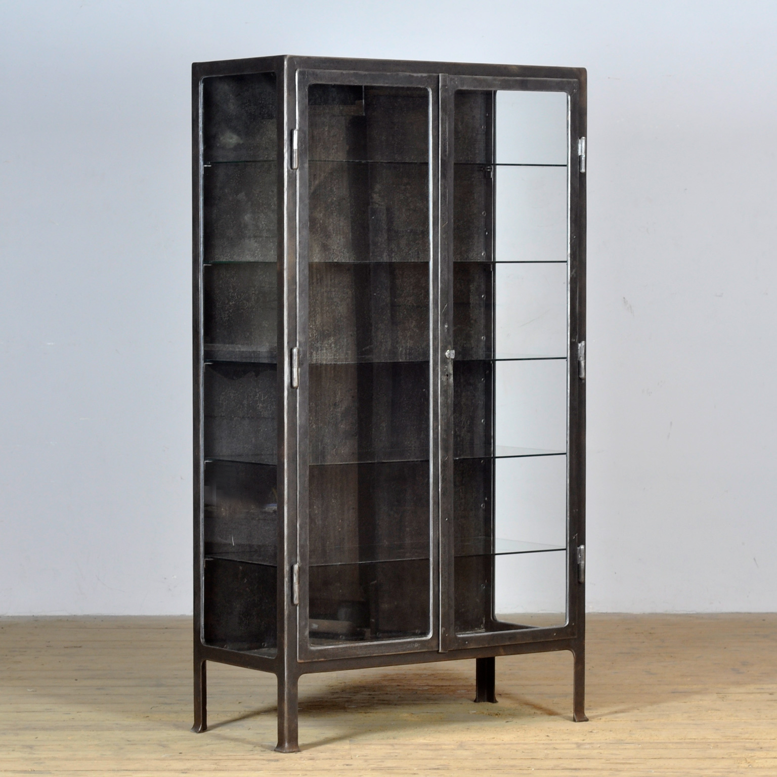 Medicijnkast uit de jaren ’30, vervaardigd in Hongarije. Deze kast is gemaakt van ijzer en glas, wat zorgt voor een stoere industriële uitstraling. De kast is gestript tot op het metaal en afgewerkt met een roestwerende olie, waardoor het authentieke karakter behouden blijft. Dankzij de vijf glazen legplanken biedt de kast volop ruimte voor het presenteren van servies, glaswerk of verzamelobjecten. Met zijn robuuste uitstraling is deze medicijnkast niet alleen functioneel, maar ook een echte eyecatcher in elk interieur — van industrieel tot modern.