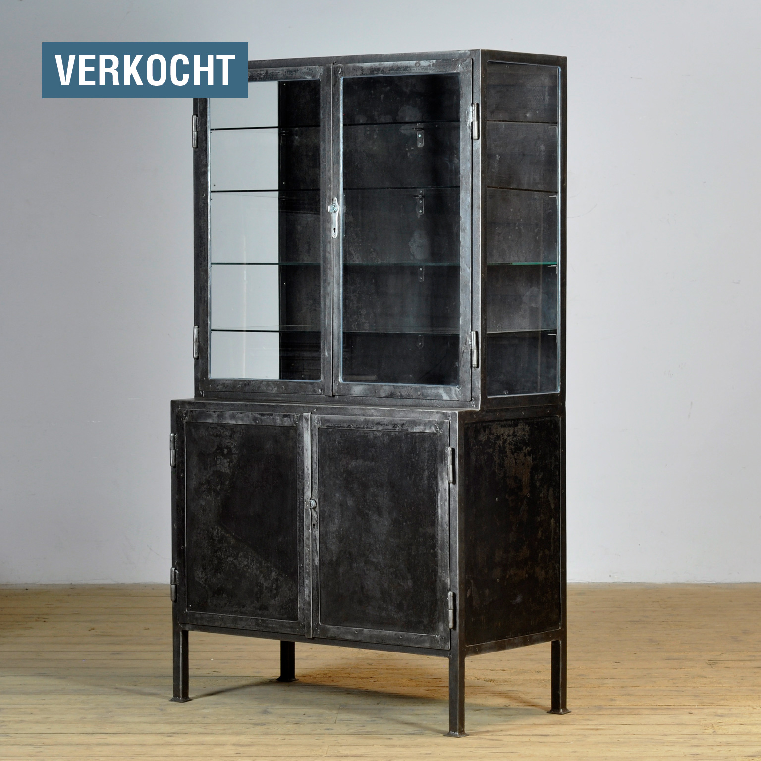 Medicijnkast uit de jaren ’30, vervaardigd in Hongarije. Deze kast is gemaakt van ijzer en glas, wat zorgt voor een stoere industriële uitstraling. De kast is gestript tot op het metaal en afgewerkt met een roestwerende olie, waardoor het authentieke karakter behouden blijft. Dankzij de vier glazen legplanken biedt de kast volop ruimte voor het presenteren van servies, glaswerk of verzamelobjecten. Met zijn robuuste uitstraling is deze medicijnkast niet alleen functioneel, maar ook een echte eyecatcher in elk interieur — van industrieel tot modern.