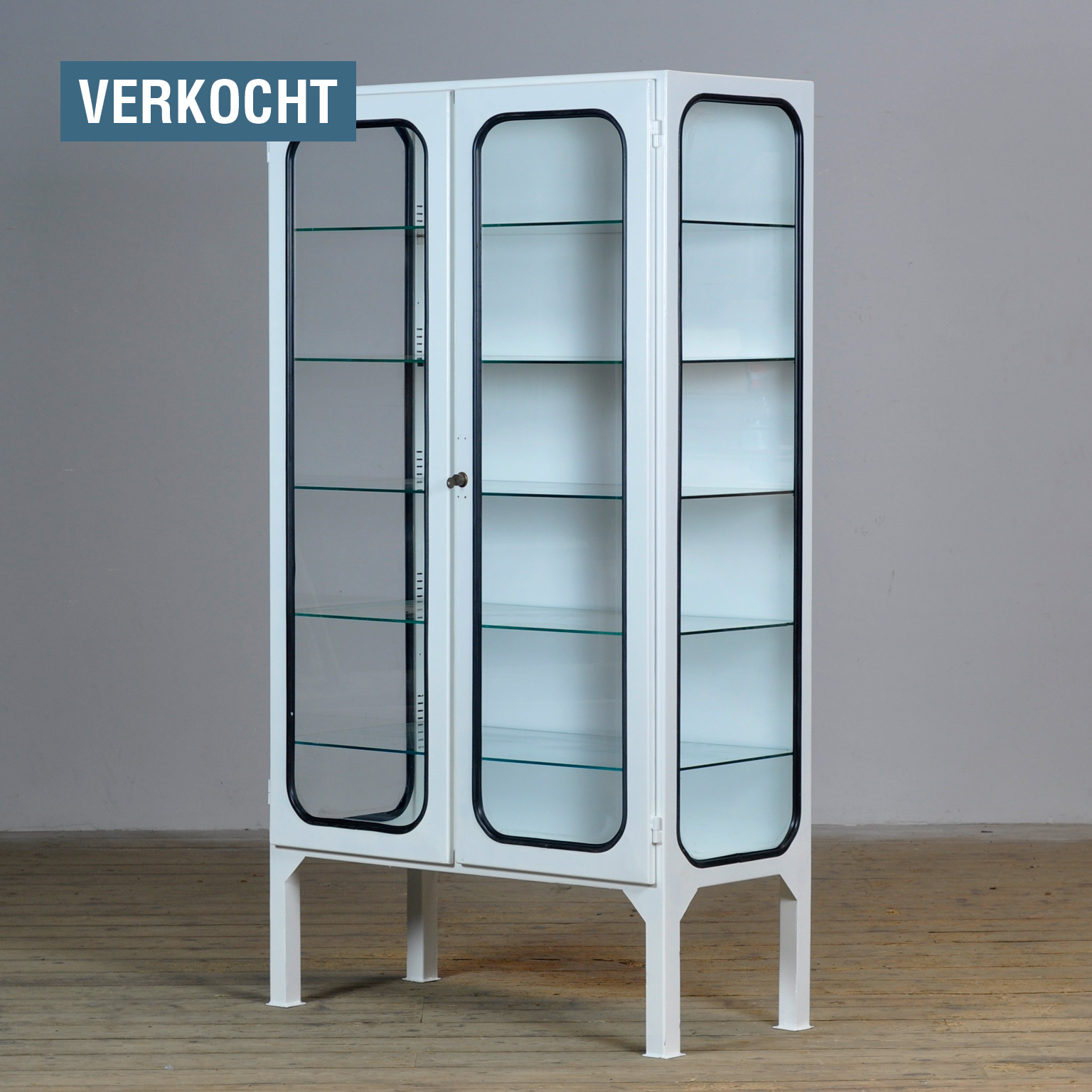 Medicijnkast van ijzer en glas dat door een rubber strip in het ijzer wordt geklemd. De kast komt uit de jaren ’70 en is geproduceerd in Hongarije. Goed werkend slot met sleutel. De kast wordt geleverd met 5 glazen (verstelbare) planken.
