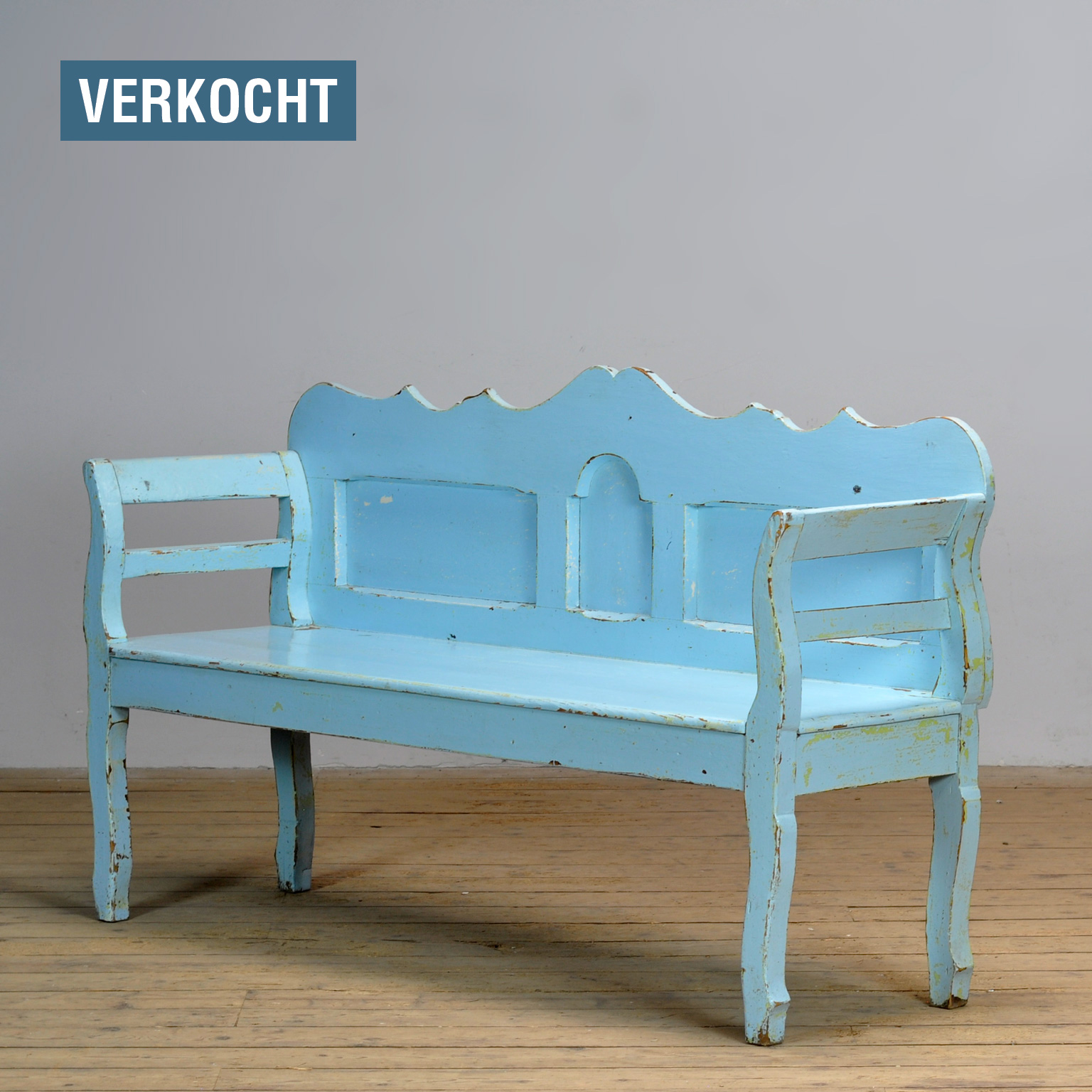 Een charmante bank uit Hongarije met de originele verf. De bank is gemaakt rond 1925. Door de tijd heen tijd en gebruik is de blauwe verf op plekken weggesleten tot het hout.