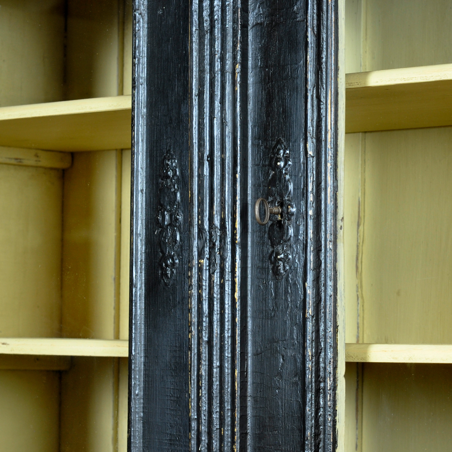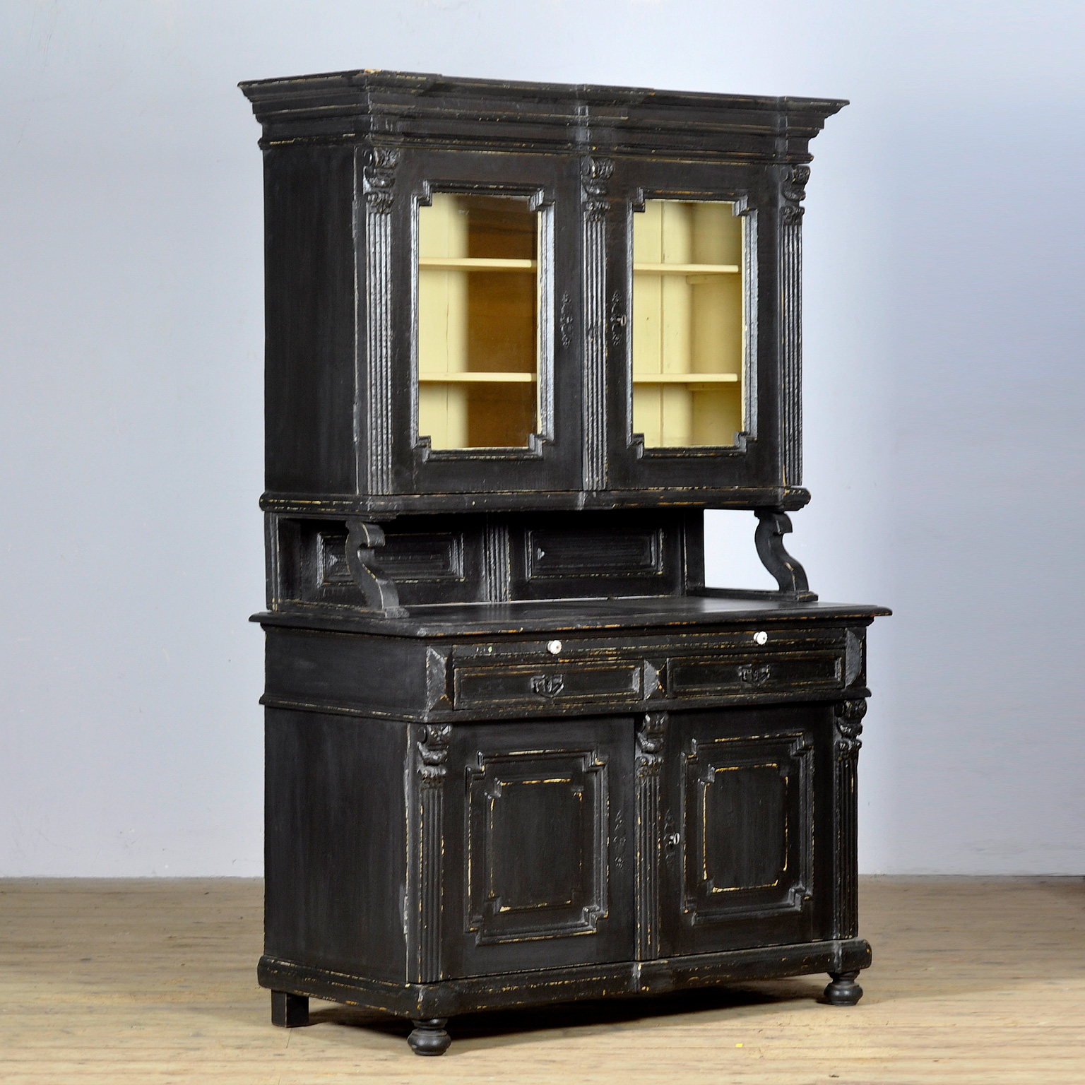 Grote grenen buffetkast uit circa 1900 in de originele verf. De kast bestaat uit twee losse delen. Het bovenste deel heeft twee deuren met daarachter twee ruime legplanken, ideaal voor servies of decoratie. Het onderstel is voorzien van twee lades en twee deuren met een extra plank, wat zorgt voor veel praktische opbergruimte. De kast heeft een bijzonder mooie, doorleefde patina die het authentieke karakter benadrukt. Een sfeervol en karaktervol meubel dat perfect past in zowel een landelijk als eclectisch interieur en direct warmte en historie toevoegt aan de ruimte.
