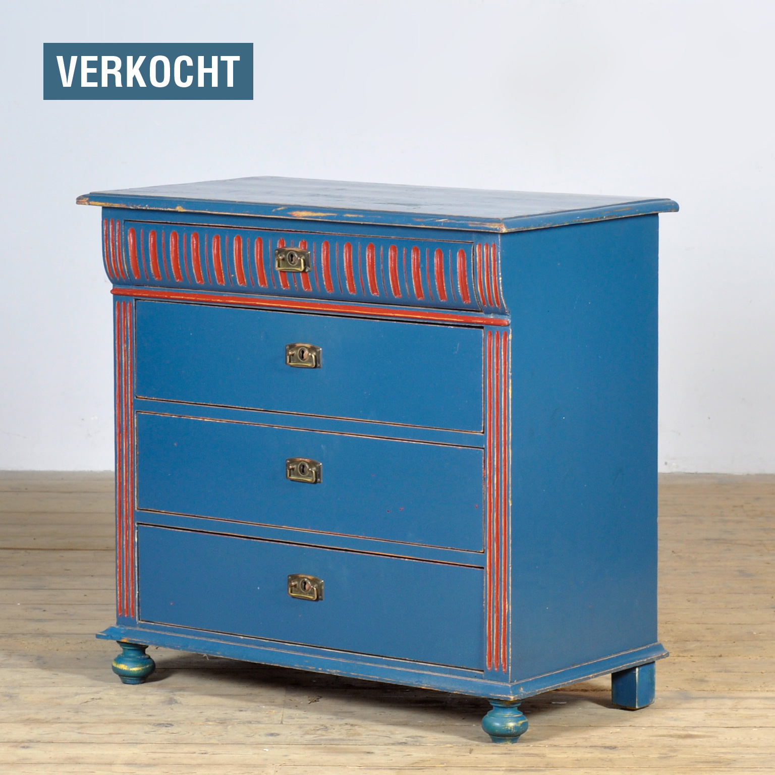 Dit charmante ladenkastje uit circa 1925, afkomstig uit Hongarije, is een prachtig voorbeeld van ambachtelijk vakmanschap. Het kastje is vervaardigd uit grenenhout en heeft een warme, karaktervolle uitstraling. De bovenste lade is sierlijk gebogen, wat het meubel een uniek en elegant detail geeft. Alle vier de laden zijn opgebouwd met traditionele zwaluwstaartverbindingen, wat zorgt voor extra stevigheid en duurzaamheid. De authentieke blauwe afwerking met subtiele slijtsporen geeft het kastje een fraaie vintage uitstraling. Een bijzonder meubelstuk dat zowel praktisch als sfeervol is in ieder interieur.