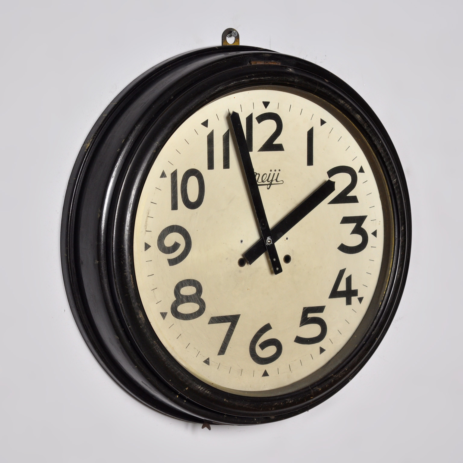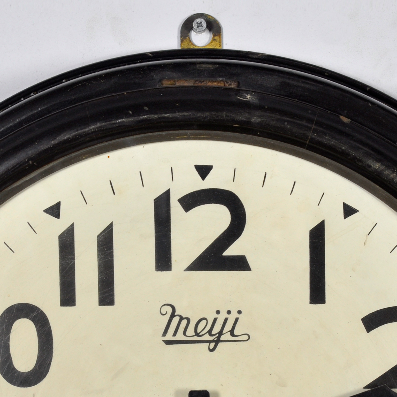 Deze houten wandklok van Meiji is geproduceerd in Japan in de jaren ’20. Met zijn ronde, zwarte houten frame en helder afleesbare wijzerplaat hing de klok in stations, scholen en overheidsgebouwen. Een klok uit een tijd waarin functionaliteit en duurzaamheid hand in hand gingen met ingetogen schoonheid. Het ontwerp is sober maar krachtig: grote cijfers, contrasterende wijzers en een rustige uitstraling. Juist die eenvoud geeft de klok zijn diepgang en tijdloze charme. Perfect als statement piece in een industrieel, vintage of minimalistisch interieur.