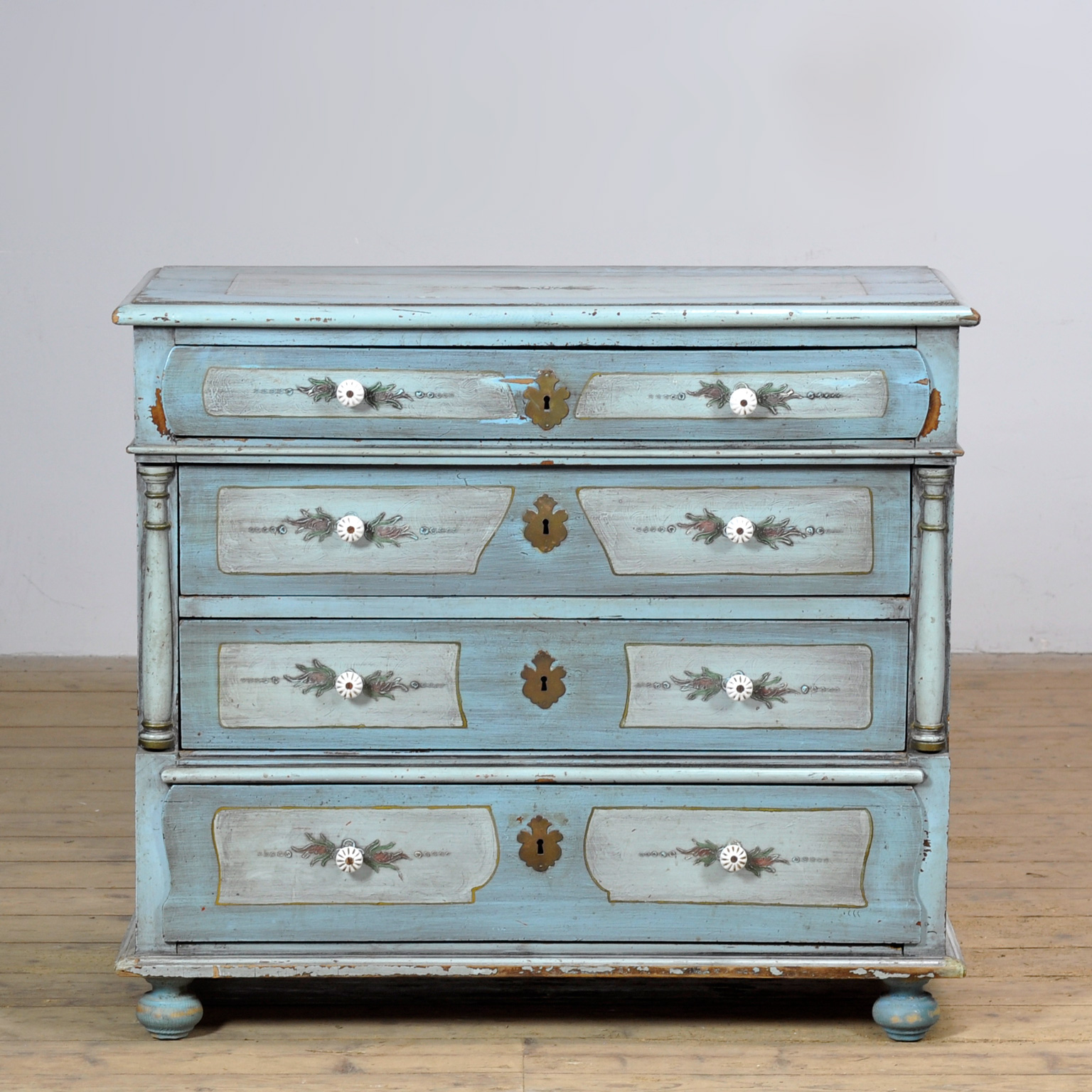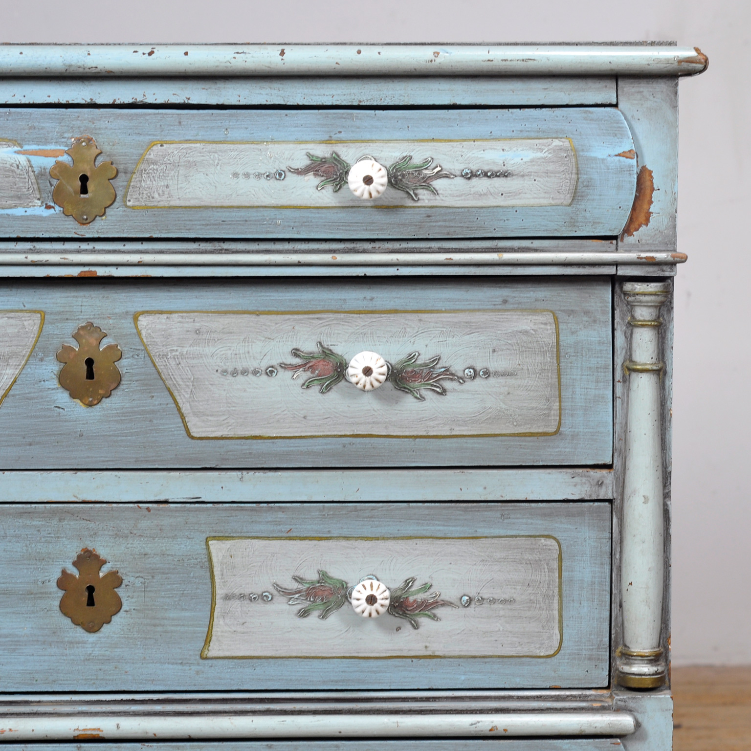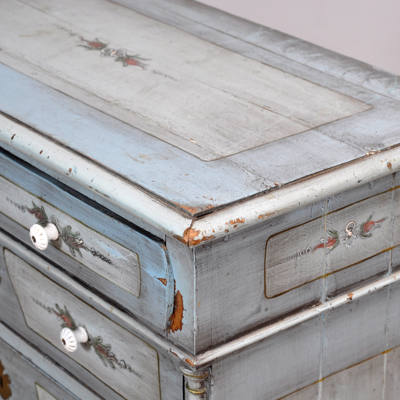 Dit meubelstuk betreft een 19e-eeuwse ladekast met Gustaviaanse invloeden, een Zweedse neoklassieke stijl die populair was van de late 18e tot het midden van de 19e eeuw. Vervaardigd uit grenenhout rond 1870, weerspiegelt het de verfijnde Scandinavische traditie.