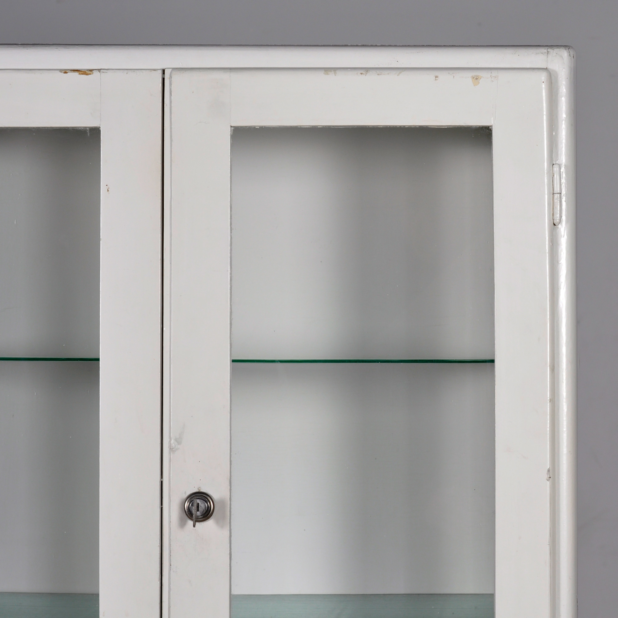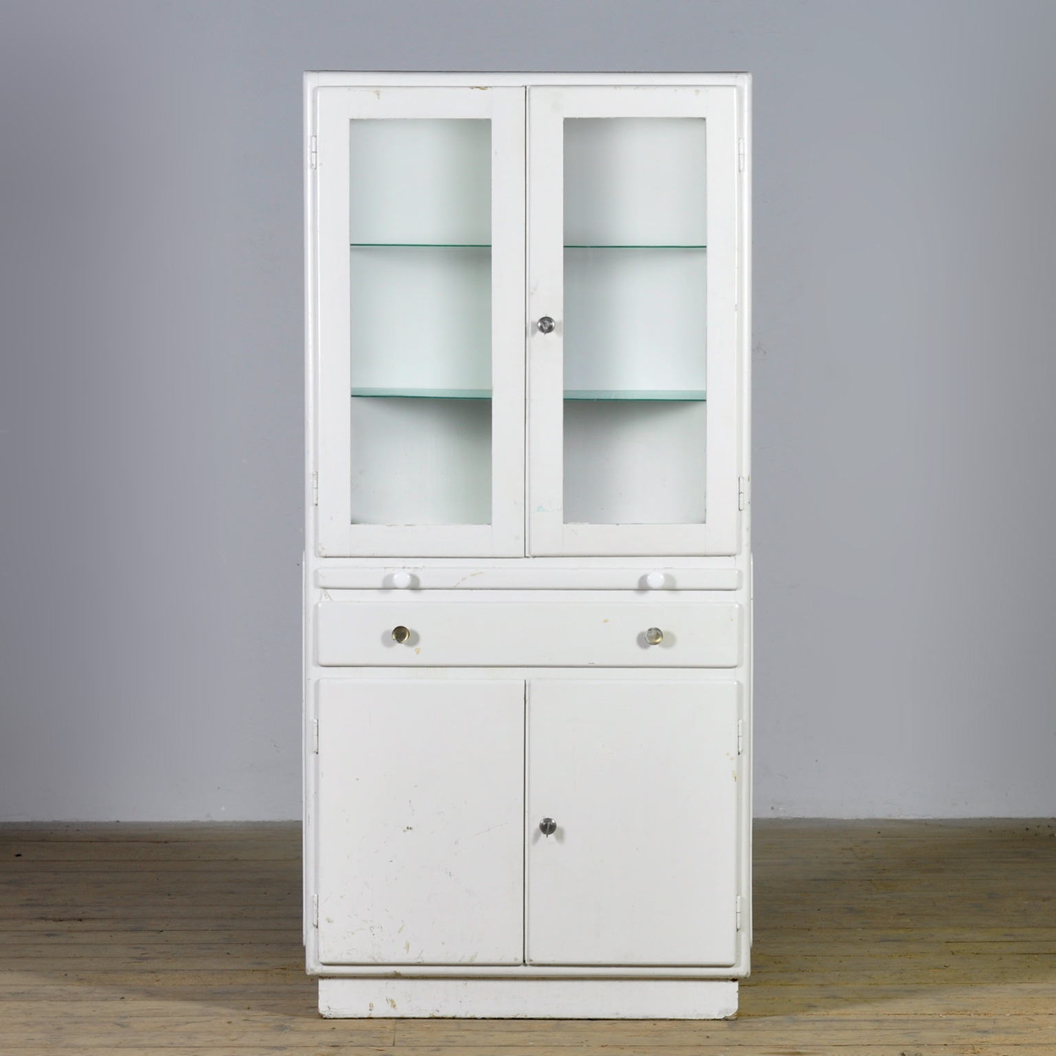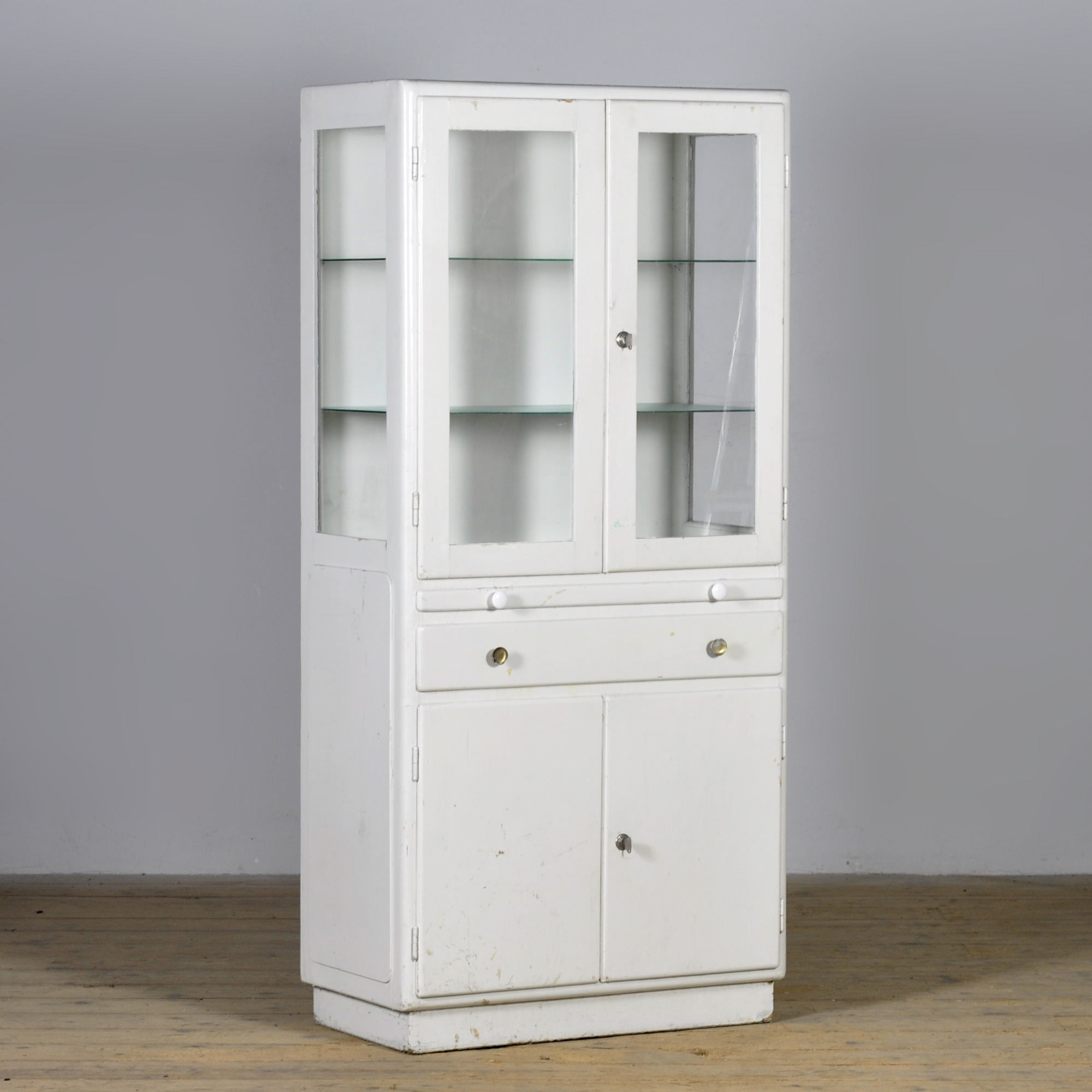 Houten medicijnkast uit de jaren ’50. In het bovenste gedeelte twee originele geribbelde glazen platen met daaronder een uitschuifbare plank. In het onderste gedeelte en opbergruimte en een lade. De kast heeft zijn originele antieke glas.