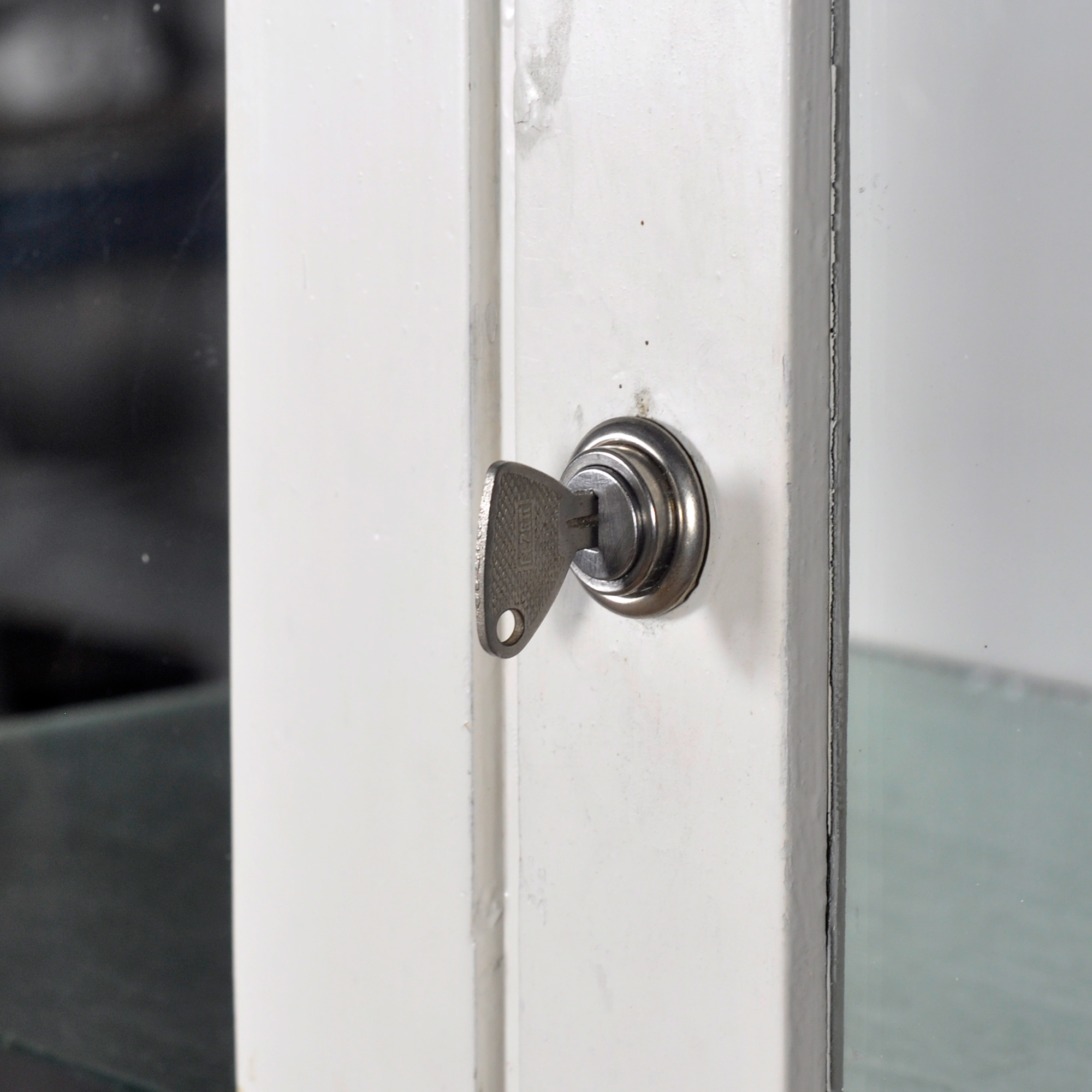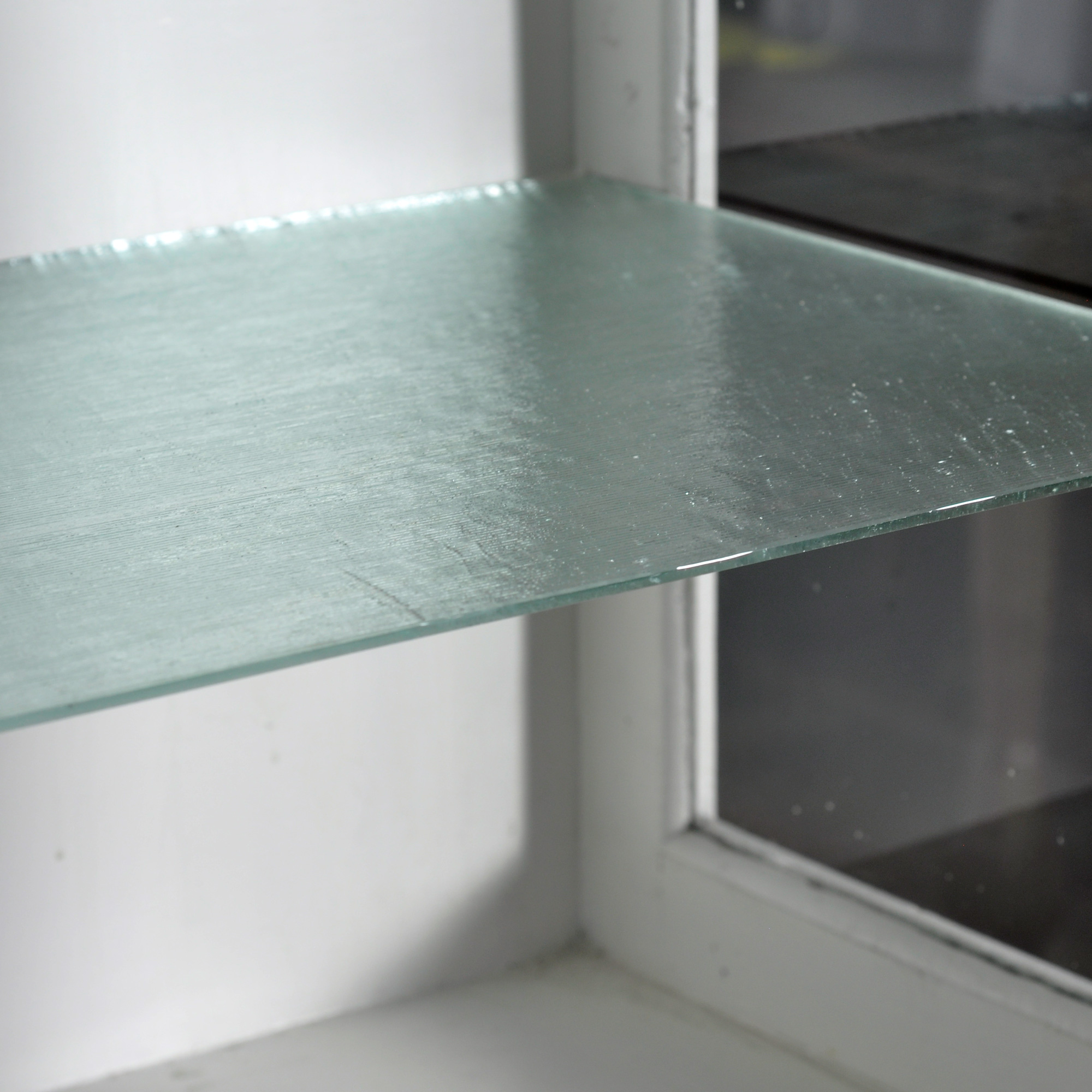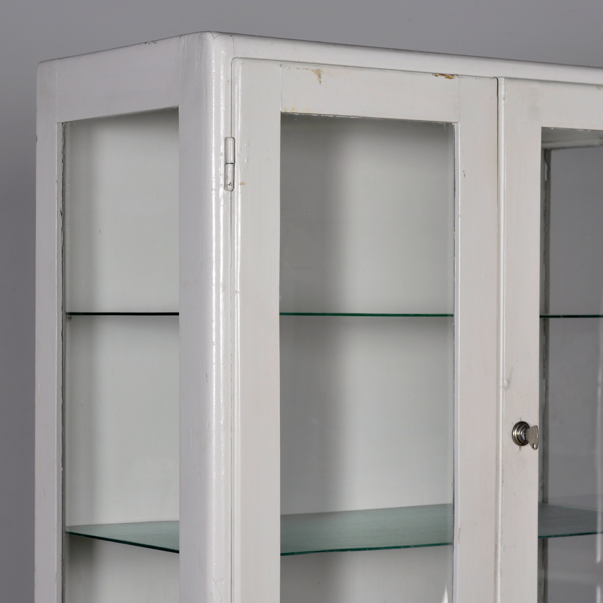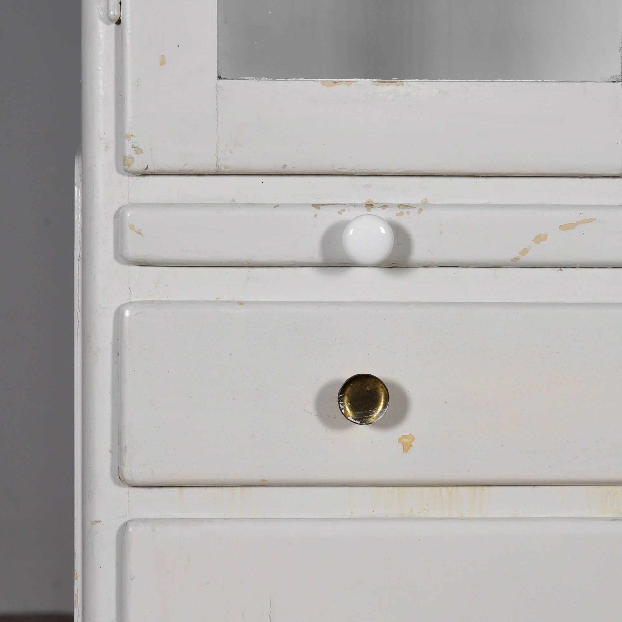 Houten medicijnkast uit de jaren ’50. In het bovenste gedeelte twee originele geribbelde glazen platen met daaronder een uitschuifbare plank. In het onderste gedeelte en opbergruimte en een lade. De kast heeft zijn originele antieke glas.