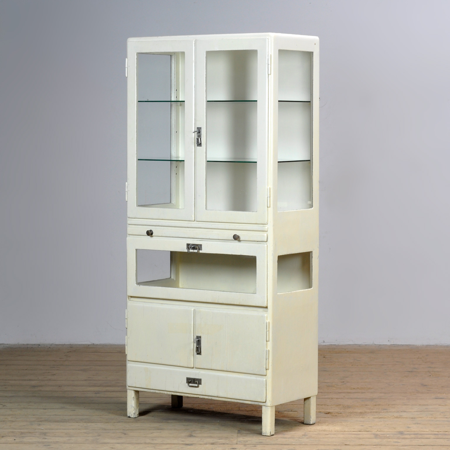 Deze houten medicijnkast uit de jaren 30 combineert functionaliteit met tijdloze charme. Het bovenste gedeelte beschikt over twee glazen planken achter vitrinedeuren, ideaal voor het overzichtelijk presenteren van inhoud. Daaronder bevindt zich een praktische uitschuifbare plank met glas. In het onderste gedeelte een aanvullende vitrine met klep, geschikt voor het veilig opbergen van kleinere items, evenals een afgesloten opbergruimte en een lade. De kast verkeert in nette staat met lichte gebruikssporen passend bij de leeftijd en vormt een stijlvolle aanvulling op elk interieur. Een uniek stuk met karakter en praktische mogelijkheden.