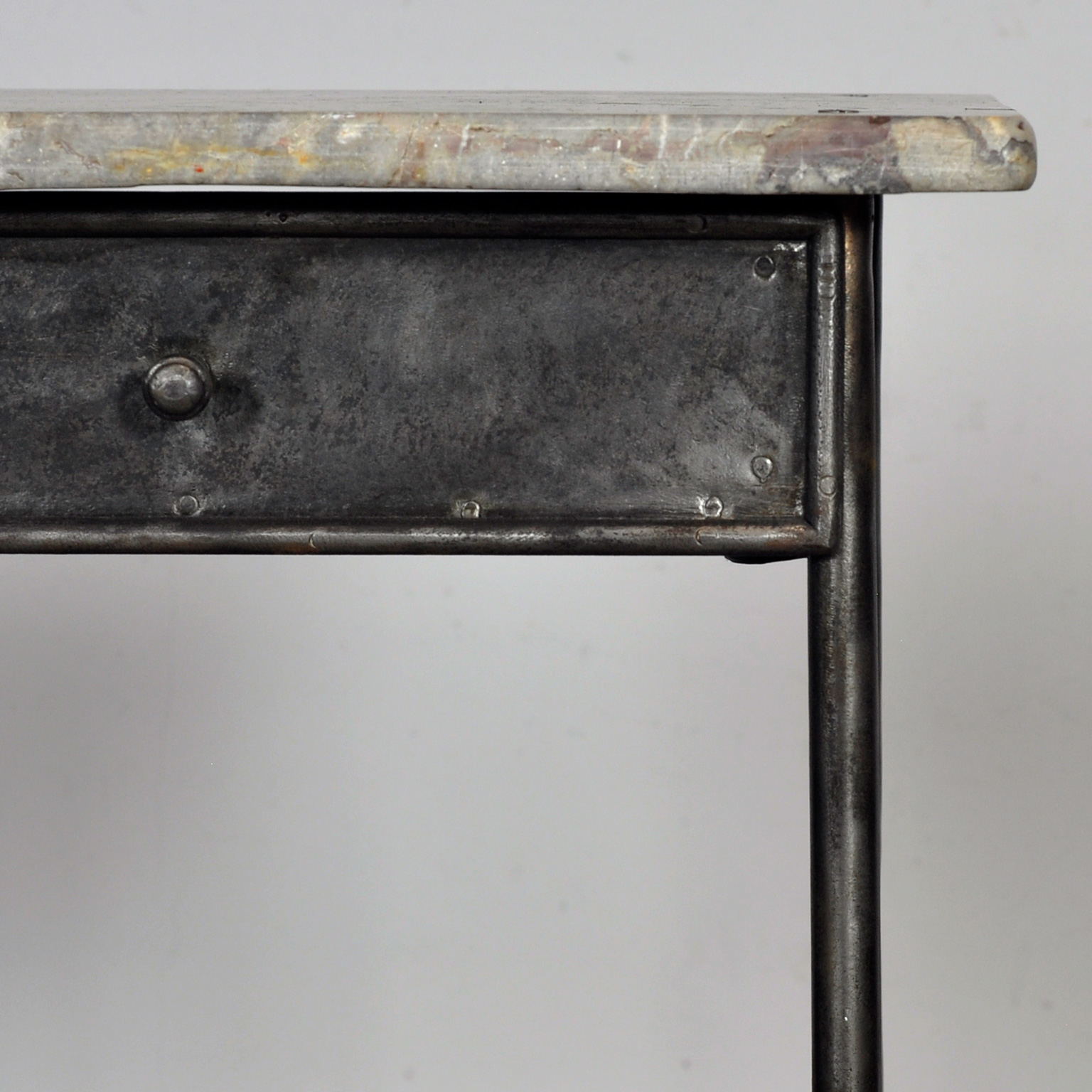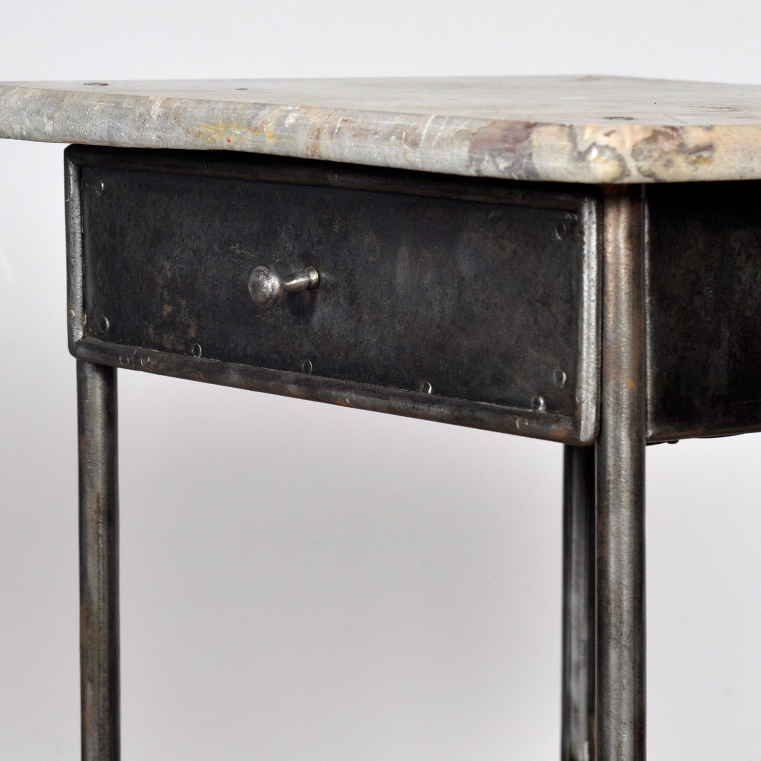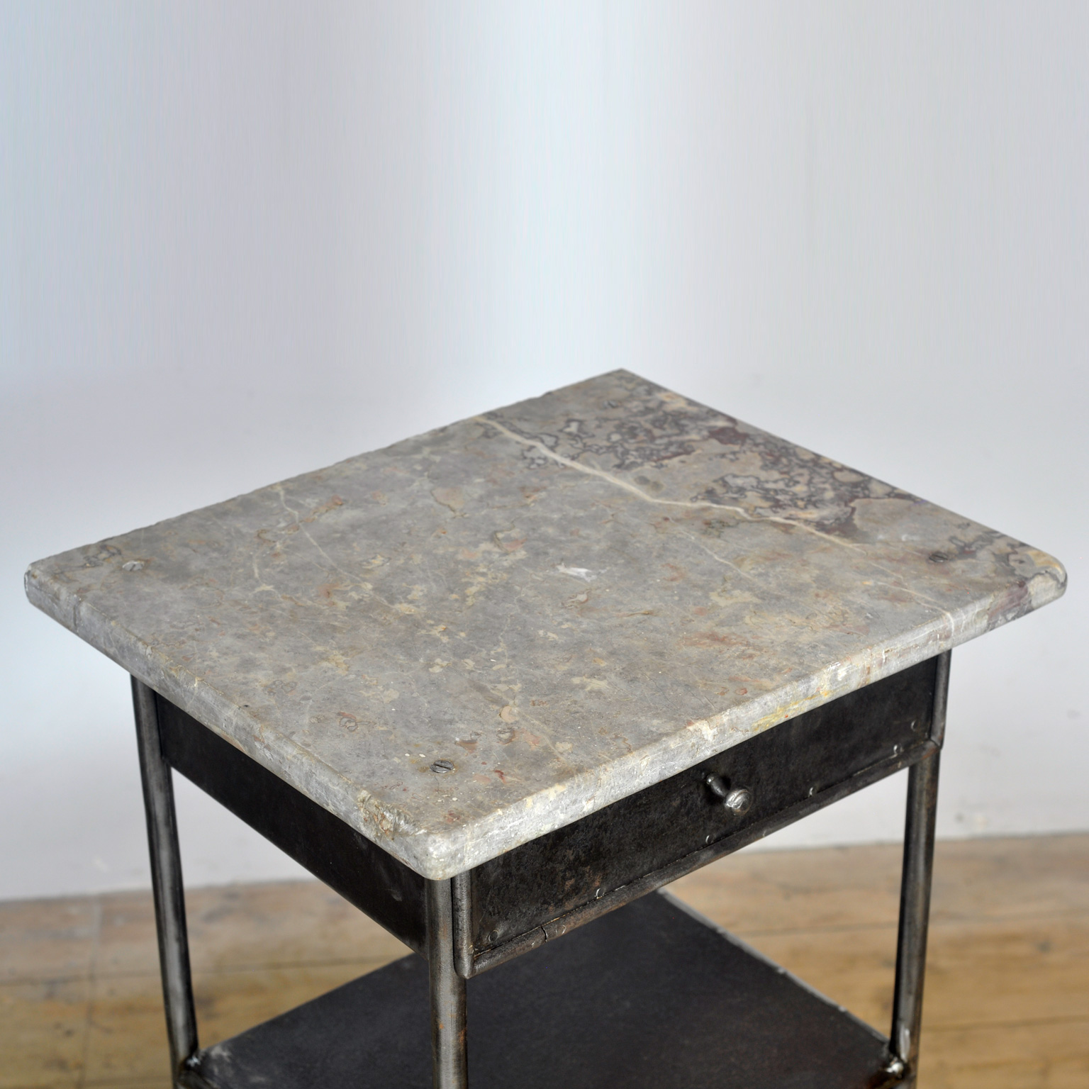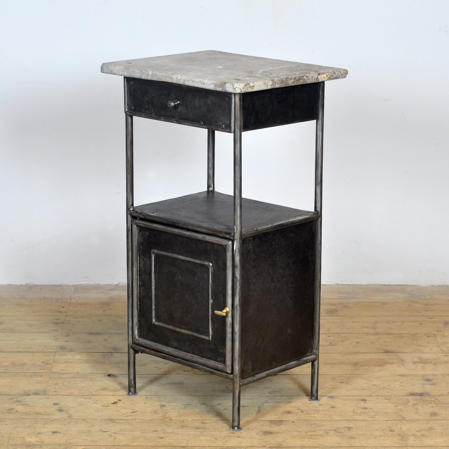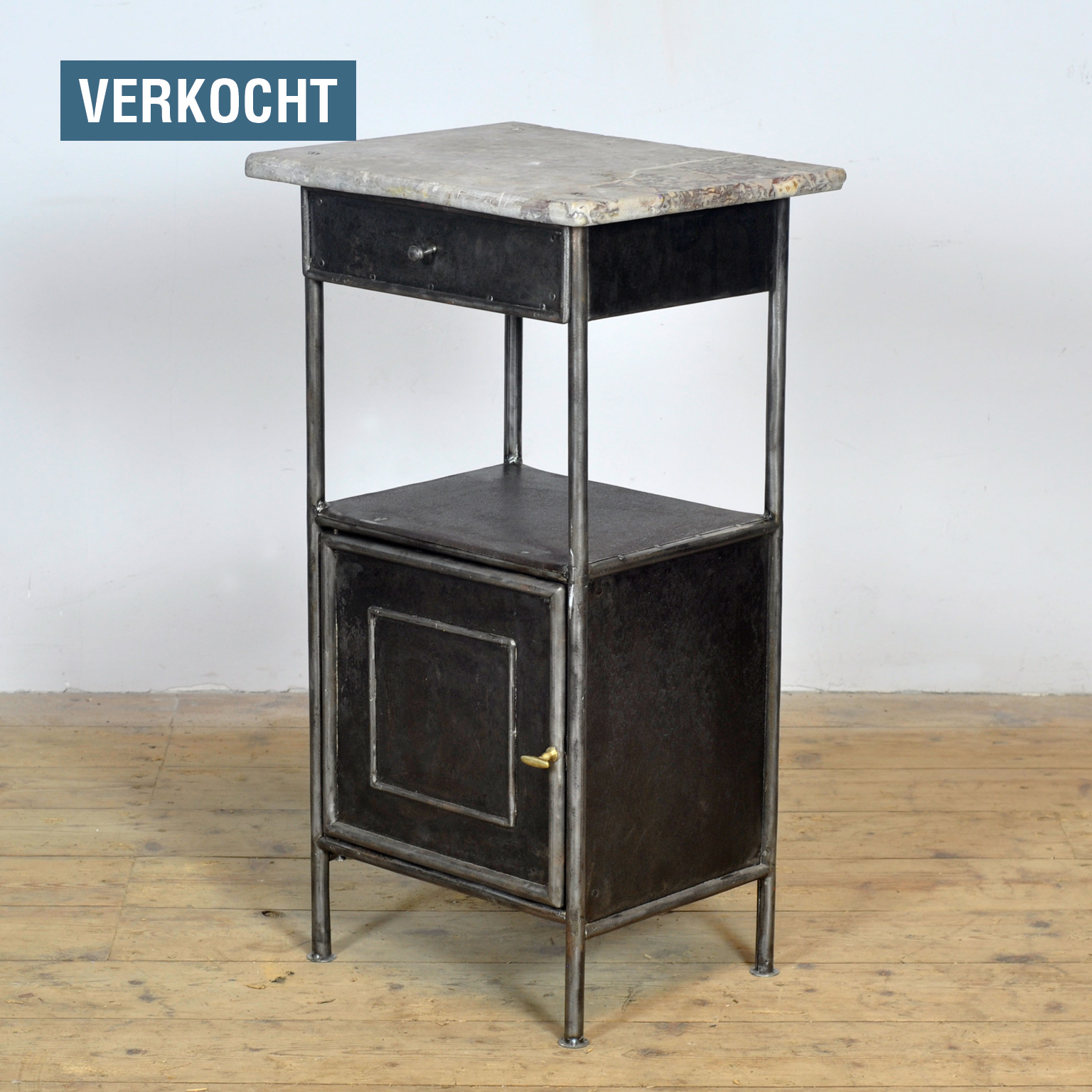 Dit nachtkastje is gemaakt van ijzer en afkomstig uit een oud ziekenhuis in Boedapest. Het dateert uit circa 1910 en heeft een marmeren bovenkant die mooi contrasteert met het industriële onderstel. Het kastje is volledig gestript tot op het originele metaal en vervolgens gepolijst, waardoor de charme naar voren komen. Met een lade en een kastje biedt het zowel praktische opbergruimte als een uniek stukje geschiedenis voor in de slaapkamer. Een bijzondere blikvanger met een verhaal. Een kleine schade aan het blad (zie foto).
