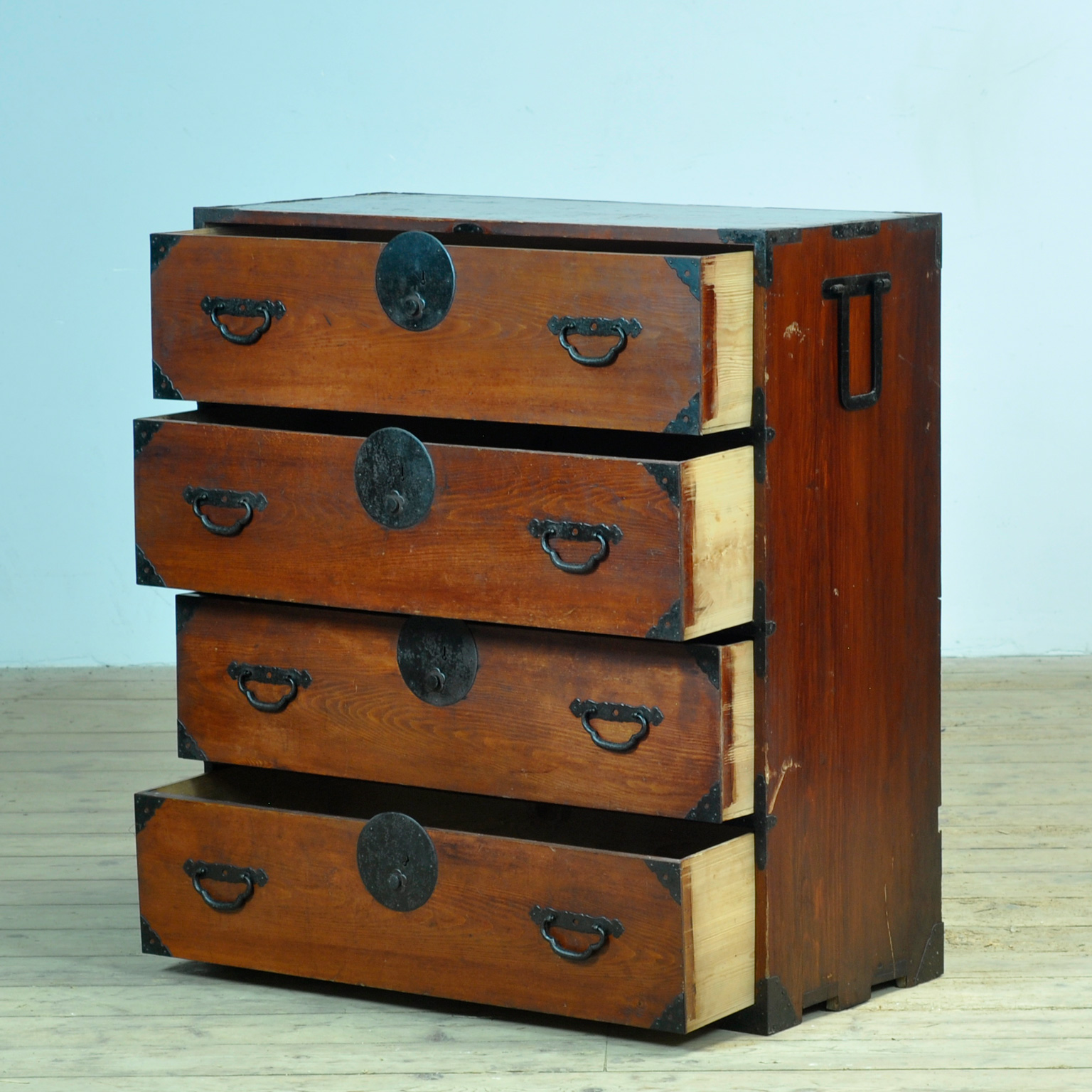 Japanse traditionele Tansu ladekast uit de jaren 1870. Vervaardigd tijdens het late Meiji-tijdperk (1868-1912). Dit meubelstuk straalt authenticiteit en karakter uit. De kast heeft een warme, doorleefde uitstraling die de tand des tijds heeft doorstaan. Functioneel en charmant, deze Tansu biedt veelzijdige opbergruimte, perfect voor het opbergen van documenten of persoonlijke spullen. Een stuk dat een unieke, historische toets geeft aan elk modern of klassiek interieur.