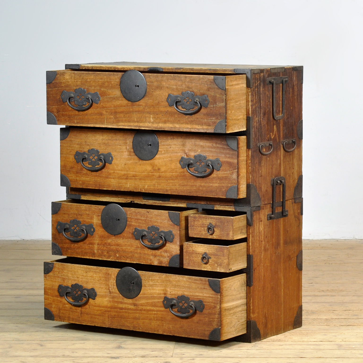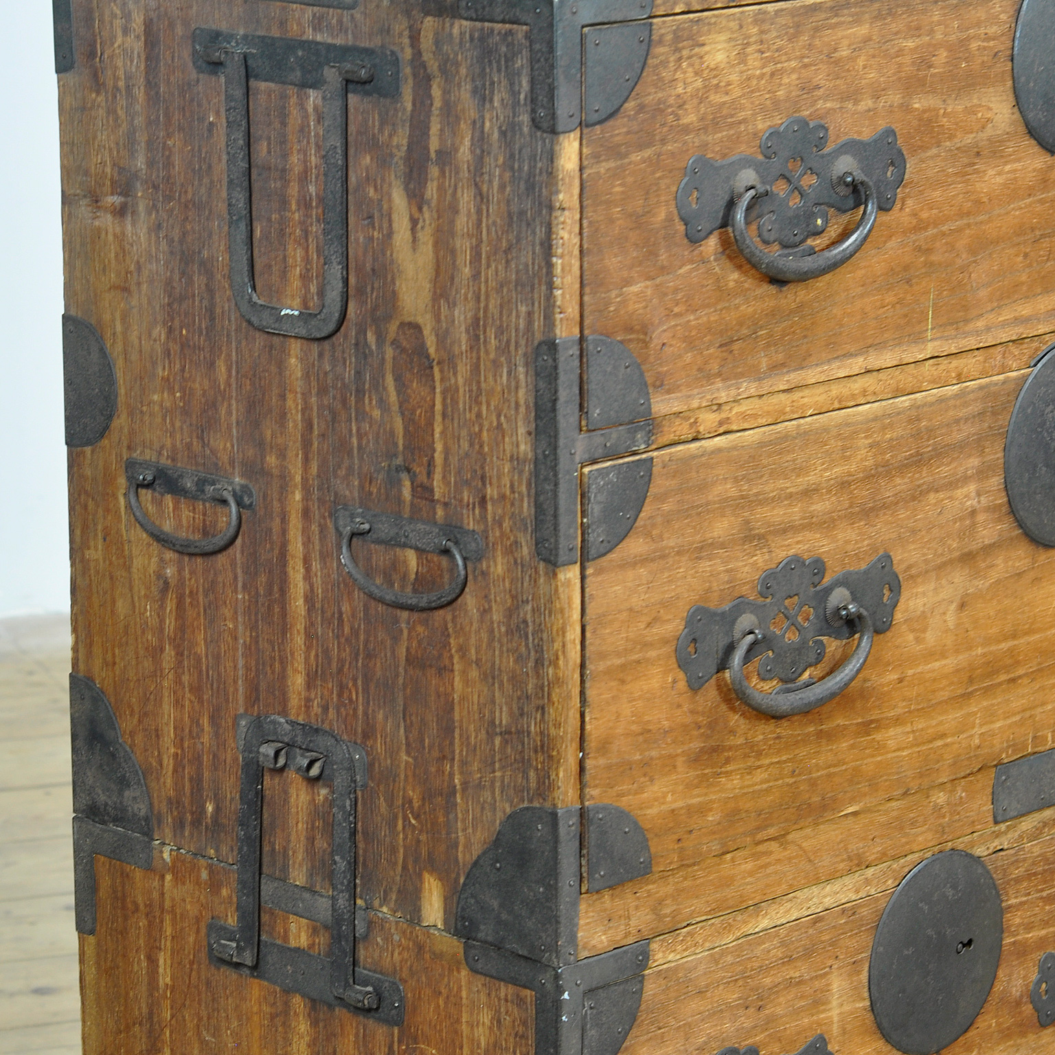 Japanse traditionele Tansu ladekast uit de jaren 1870. Vervaardigd tijdens het late Meiji-tijdperk (1868-1912). Dit meubelstuk straalt authenticiteit en karakter uit. De kast heeft een warme, doorleefde uitstraling die de tand des tijds heeft doorstaan. Functioneel en charmant, deze Tansu biedt veelzijdige opbergruimte, perfect voor het opbergen van documenten of persoonlijke spullen. Een stuk dat een unieke, historische toets geeft aan elk modern of klassiek interieur. De kast bestaat uit 2 delen.