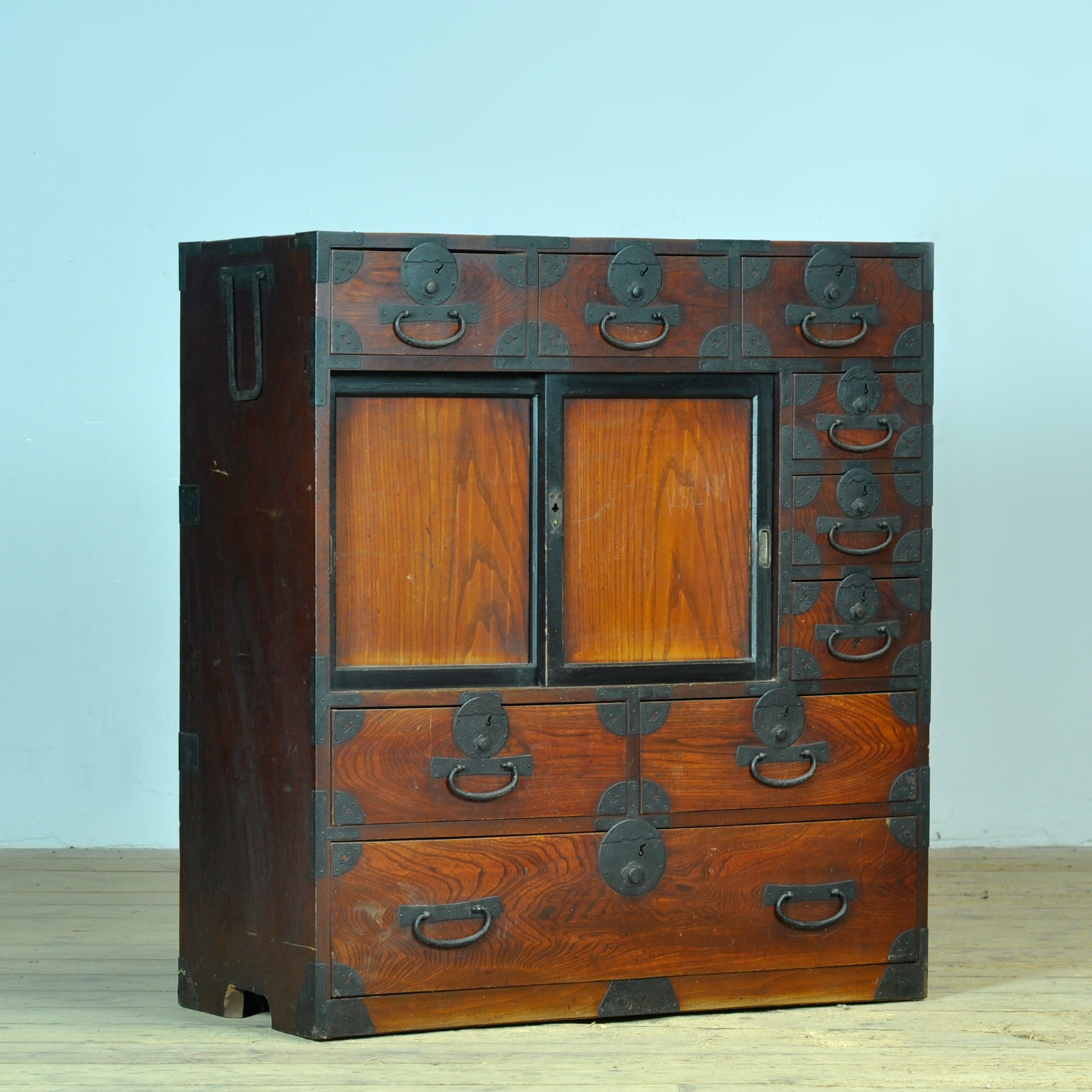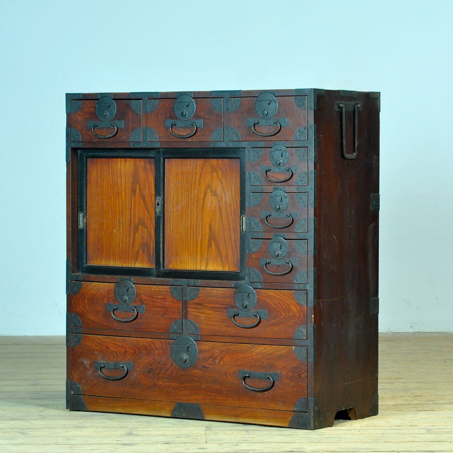 Japanse traditionele Tansu ladekast met schuifdeurtjes uit de jaren 1890. Vervaardigd tijdens het late Meiji-tijdperk (1868-1912). Dit meubelstuk straalt authenticiteit en karakter uit. De kast heeft een warme, doorleefde uitstraling die de tand des tijds heeft doorstaan. Het robuuste ijzeren beslag met klassieke slotplaten accentueert het traditionele vakmanschap.