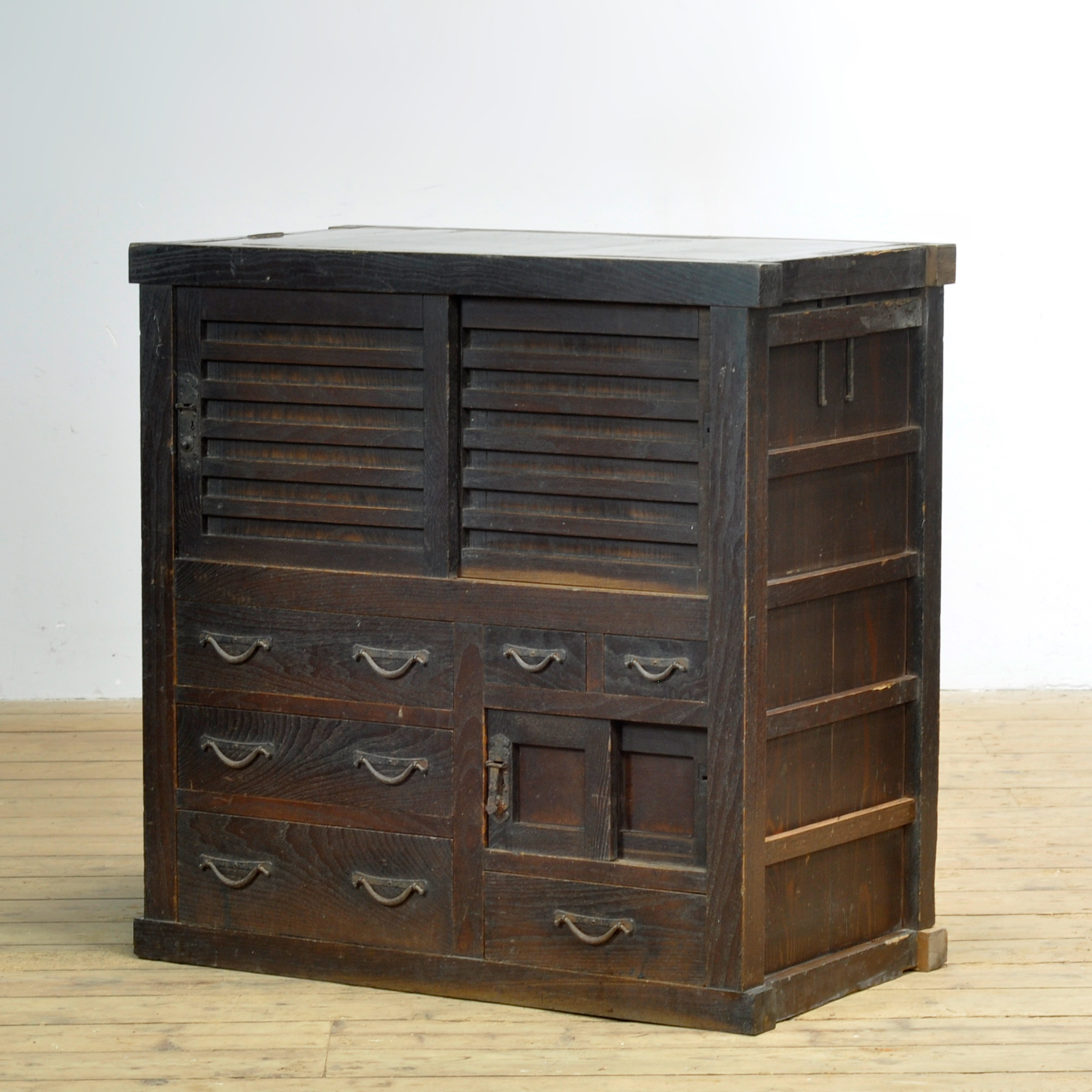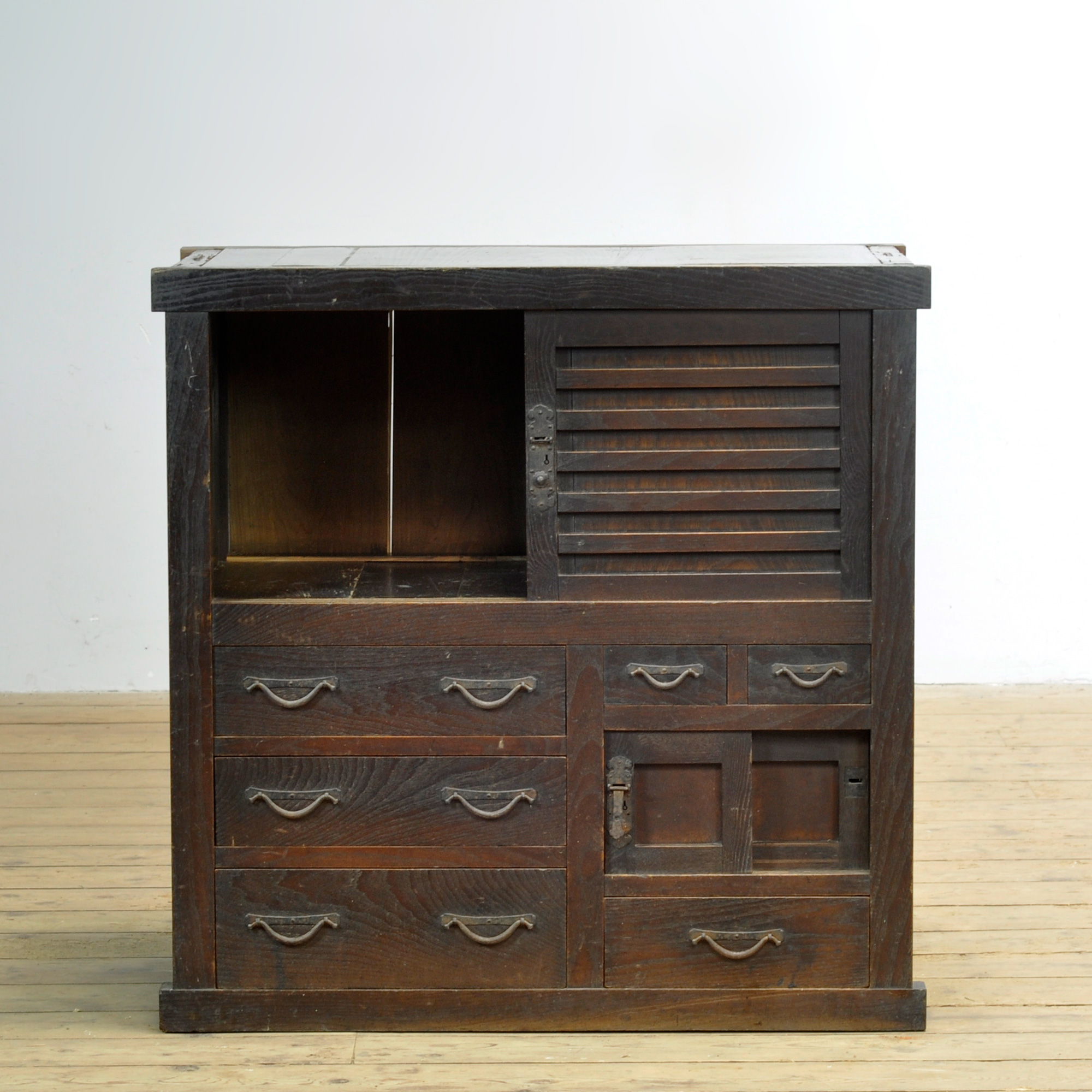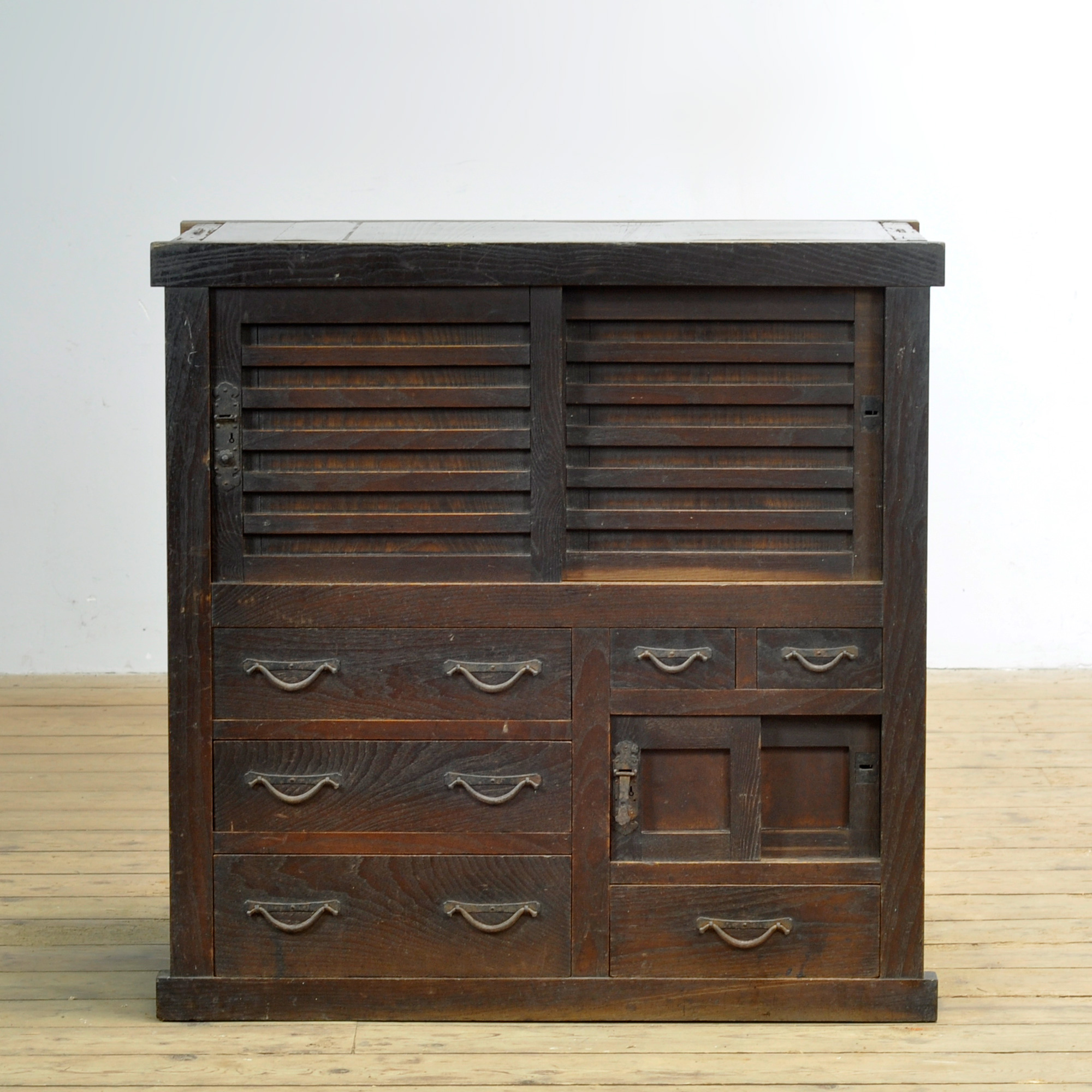 Japanse traditionele Tansu ladekast met schuifdeurtjes uit de jaren 1890. Vervaardigd tijdens het late Meiji-tijdperk (1868-1912). Dit meubelstuk straalt authenticiteit en karakter uit. De kast heeft een warme, doorleefde uitstraling die de tand des tijds heeft doorstaan. Het robuuste ijzeren beslag met klassieke slotplaten accentueert het traditionele vakmanschap.