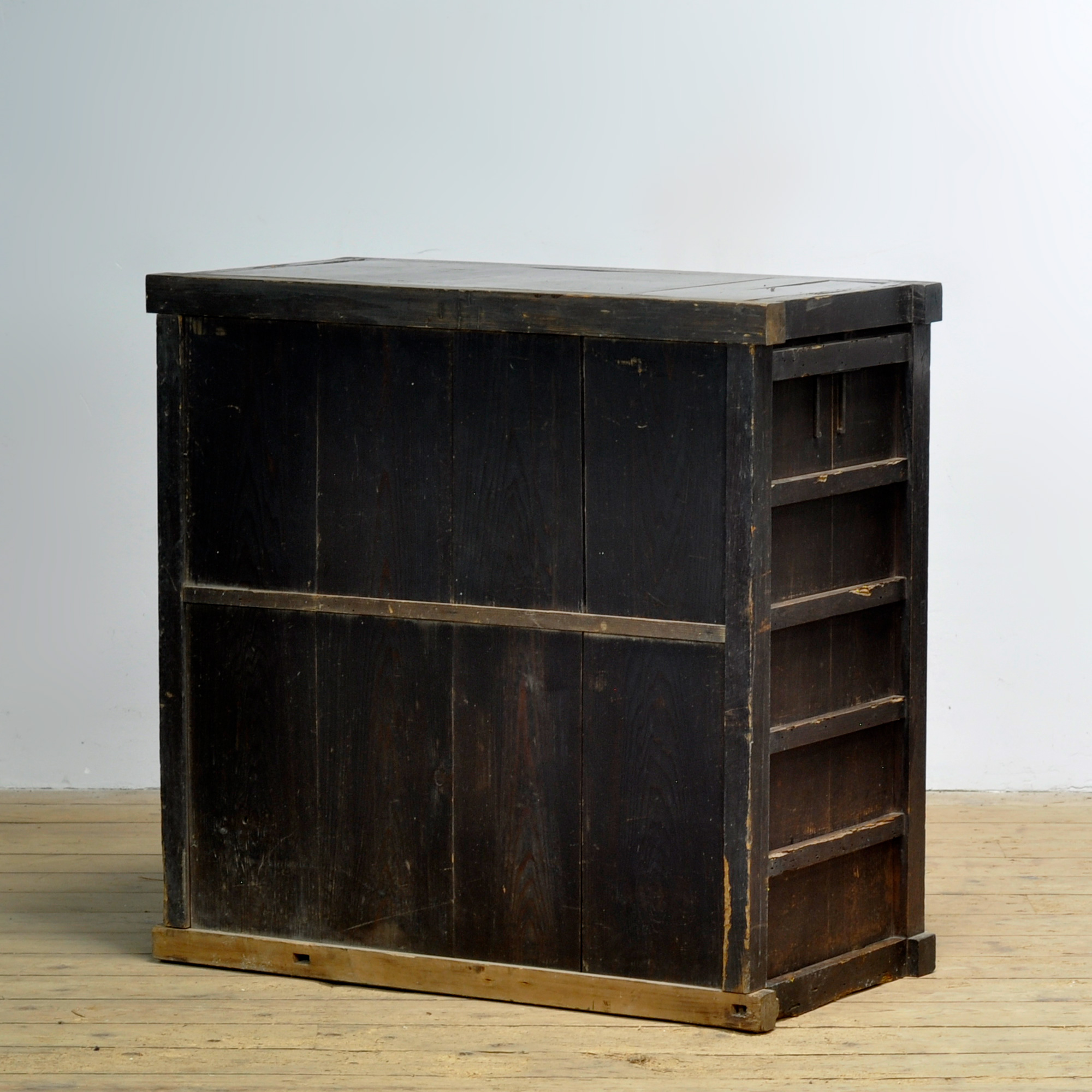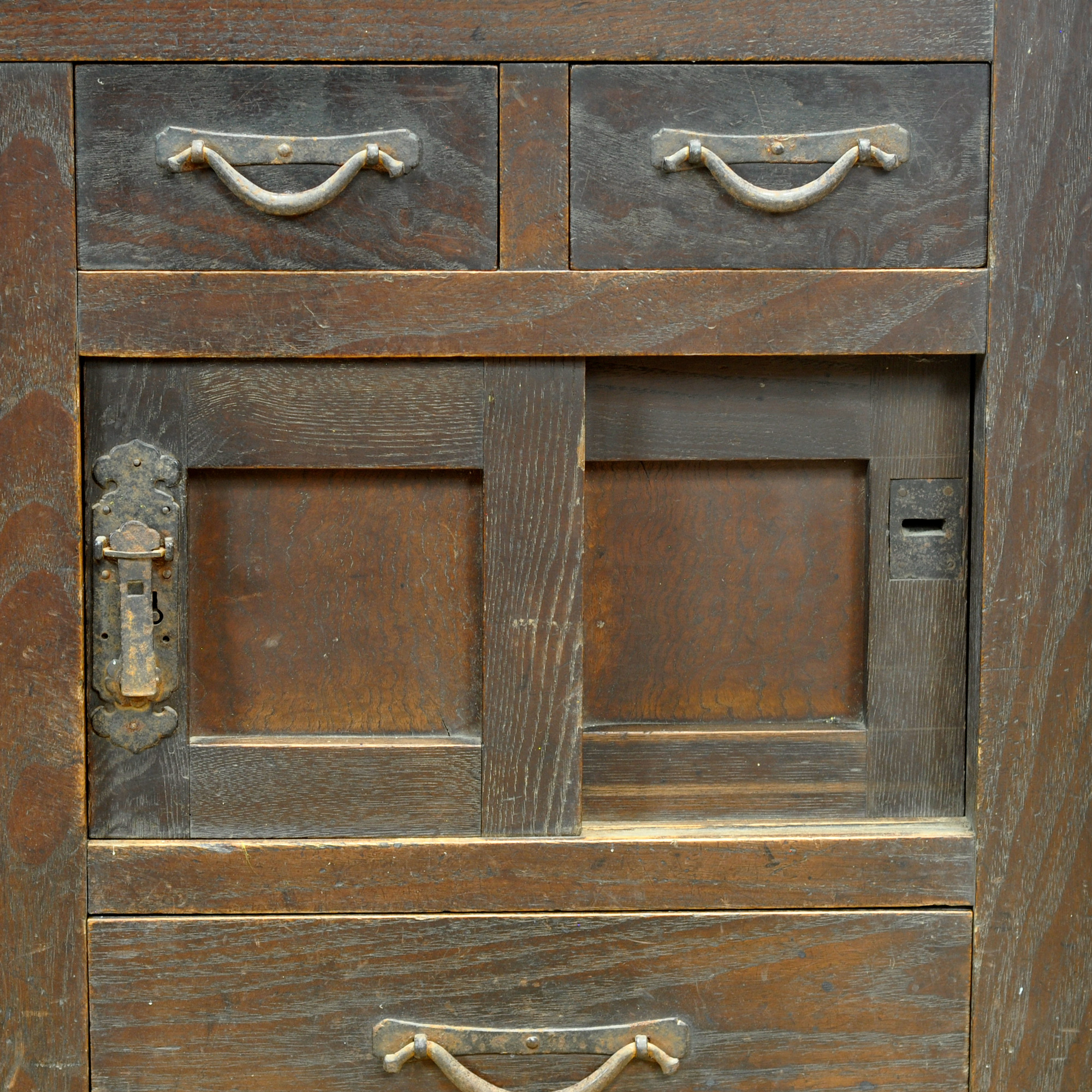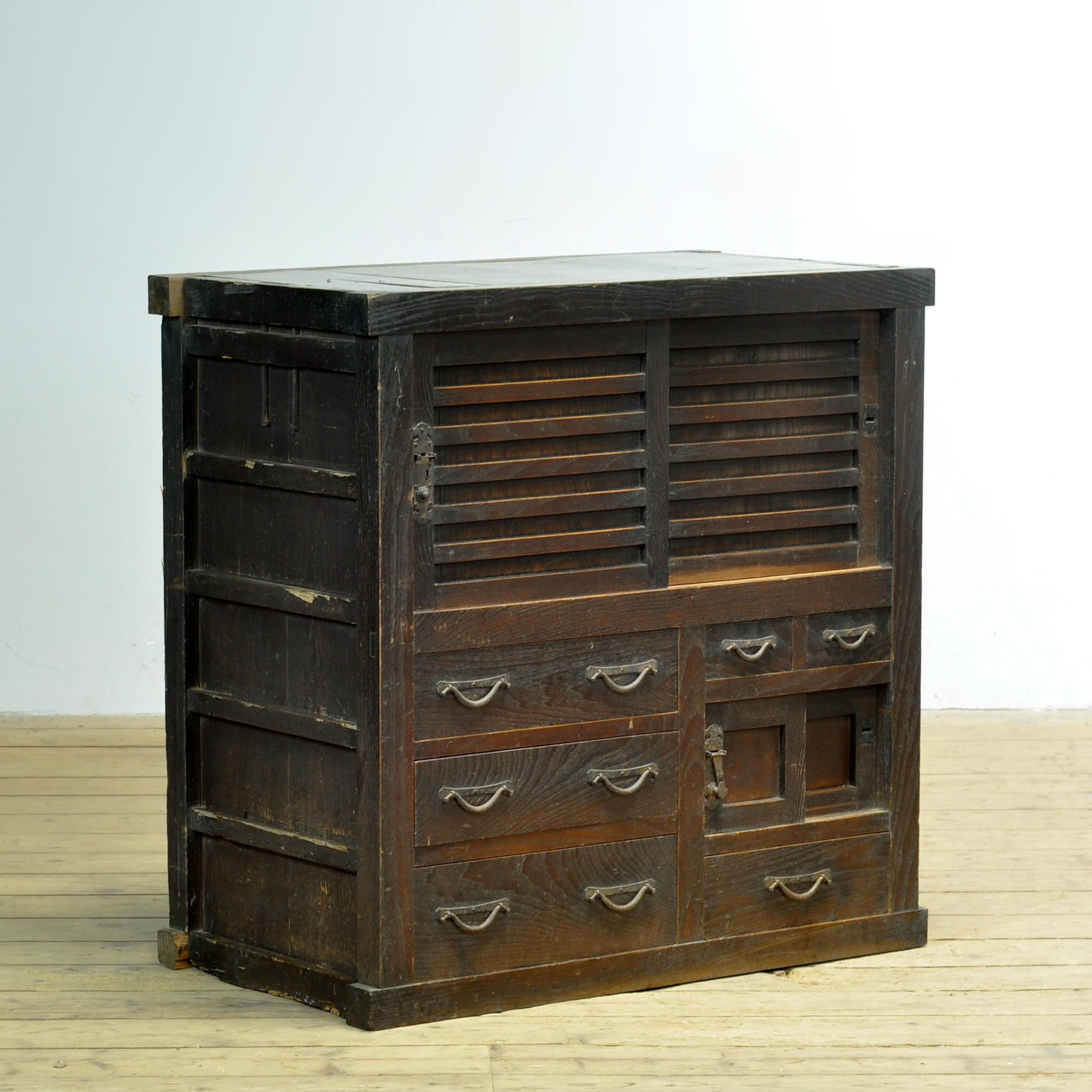 Japanse traditionele Tansu ladekast met schuifdeurtjes uit de jaren 1890. Vervaardigd tijdens het late Meiji-tijdperk (1868-1912). Dit meubelstuk straalt authenticiteit en karakter uit. De kast heeft een warme, doorleefde uitstraling die de tand des tijds heeft doorstaan. Het robuuste ijzeren beslag met klassieke slotplaten accentueert het traditionele vakmanschap.
