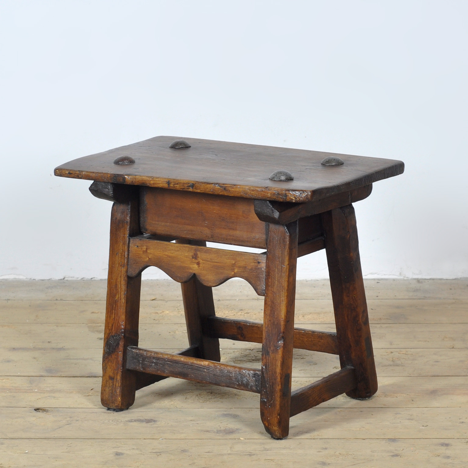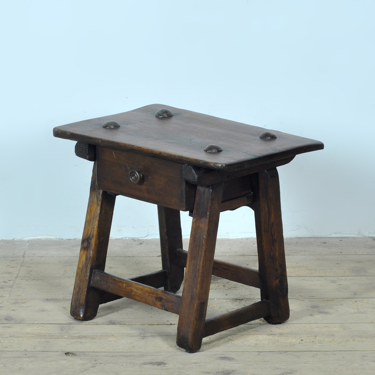 Dit kleine Spaanse tafeltje van eiken hout dateert uit circa 1840. Het meubel is voorzien van een enkele lade met originele knop en staat op licht schuin geplaatste poten met verbinders. Het blad is vastgezet met spijkers met grote knop. De warme patina en zichtbare gebruikssporen onderstrepen de leeftijd. Ideaal als bijzettafel, nachtkastje of decoratief accent in zowel klassieke als moderne interieurs. Een zeldzaam en sfeervol object voor de liefhebber van antiek. Het stuk verkeert in goede staat met passende slijtage, zorgvuldig gereinigd en direct bruikbaar in uw woning of project.