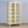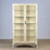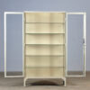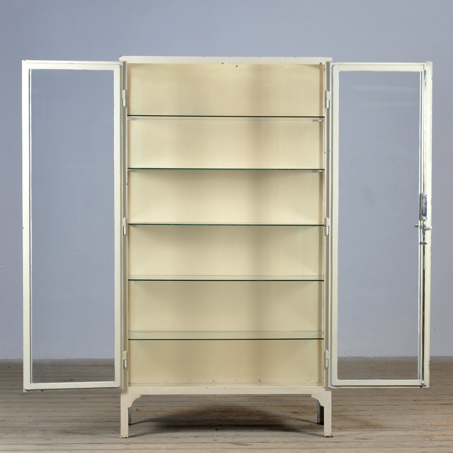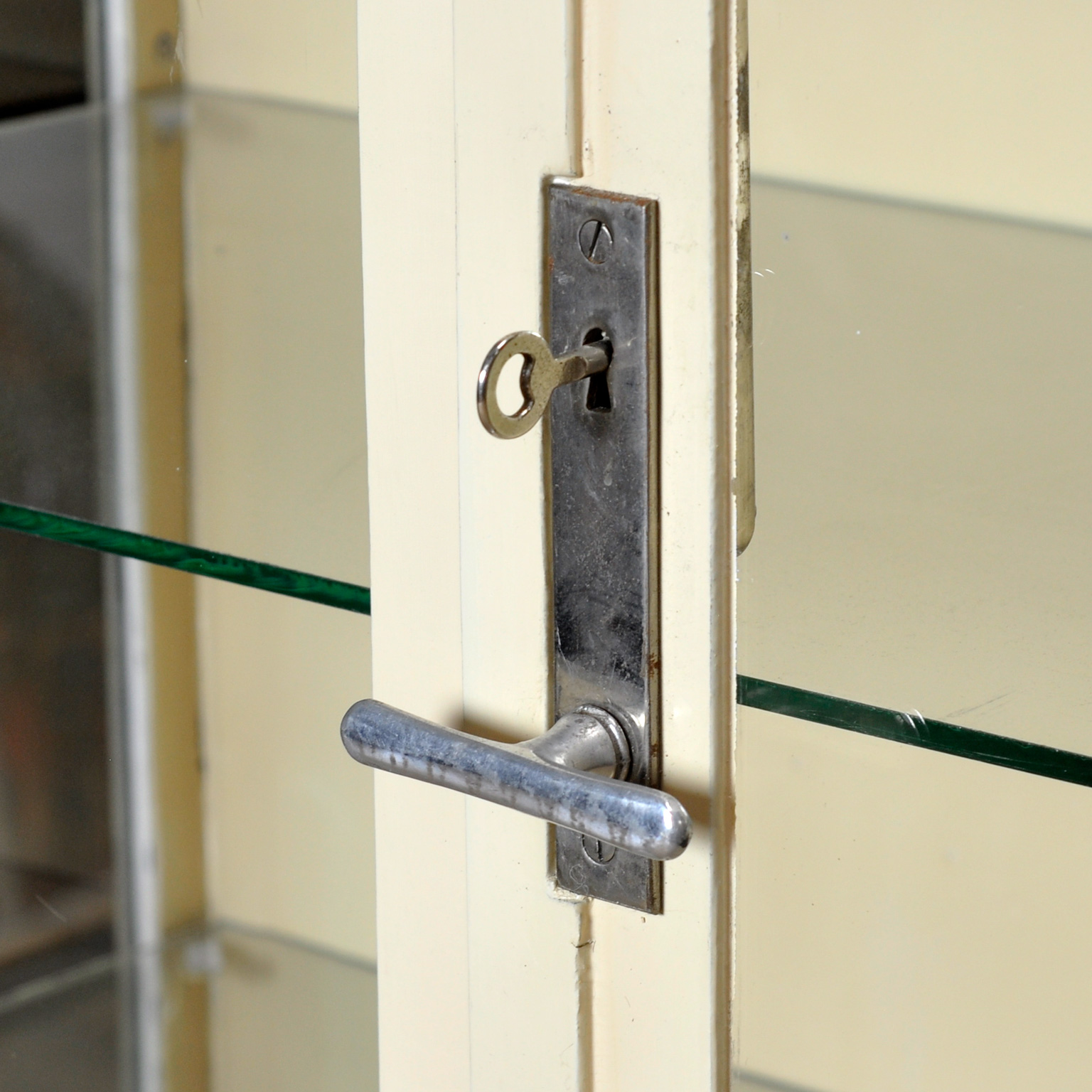 Medicijnkast uit de jaren ’30 met het originele slot en hendel. Deze vitrinekast is gemaakt van ijzer met glazen legplanken, ideaal voor het tonen of opbergen van je mooiste items. De kast combineert industriële charme met tijdloze elegantie en past perfect in zowel moderne als vintage interieurs. Een uniek stuk met karakter en geschiedenis. De kast heeft nog zijn originele antieke glas op een zijkant na.