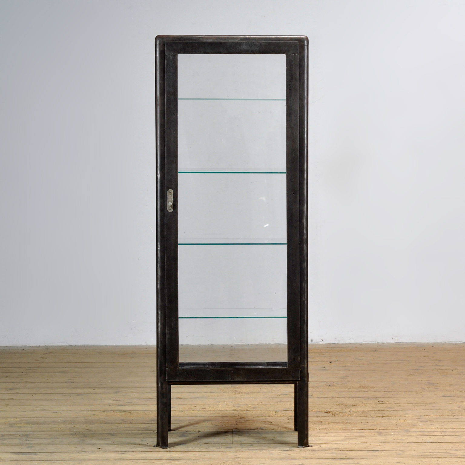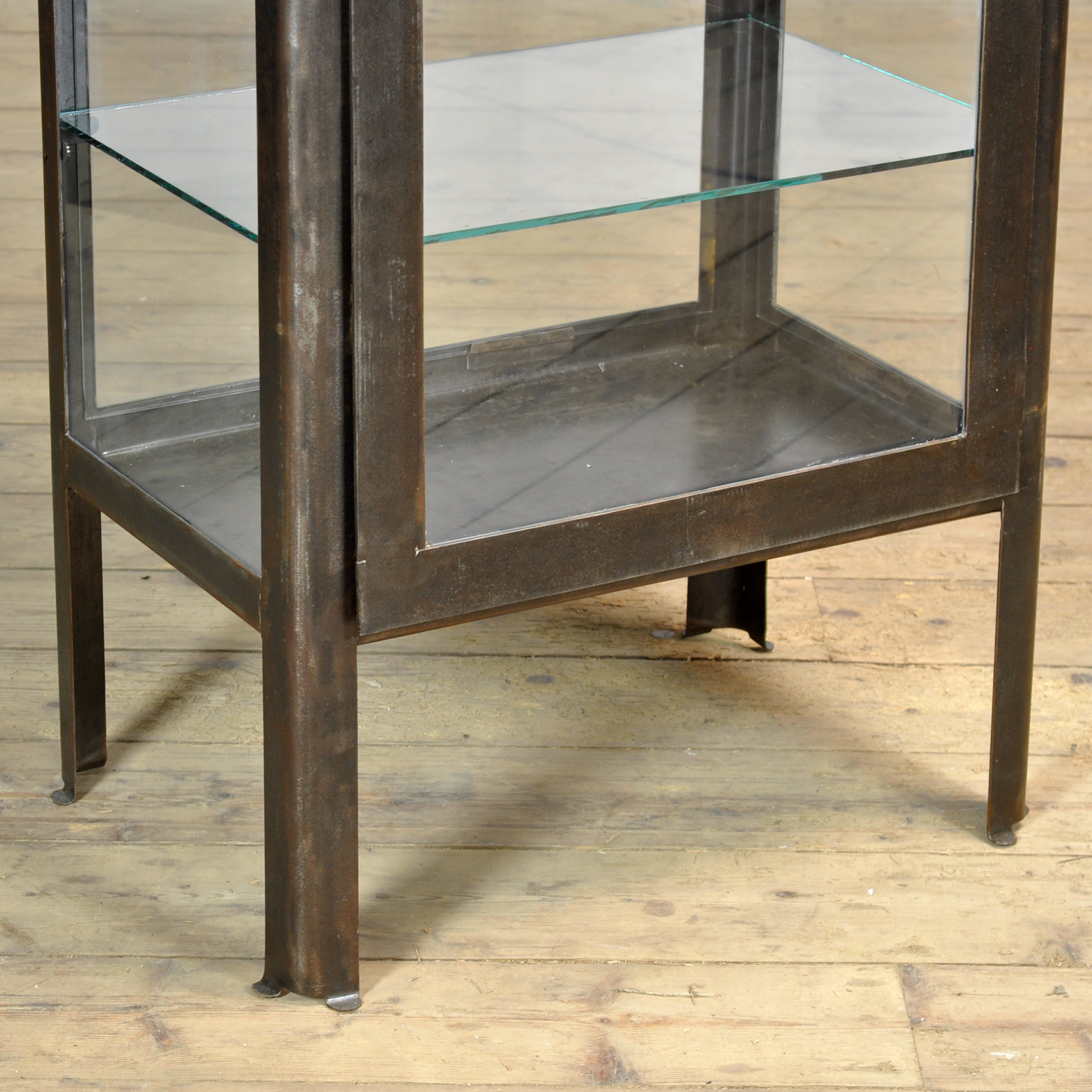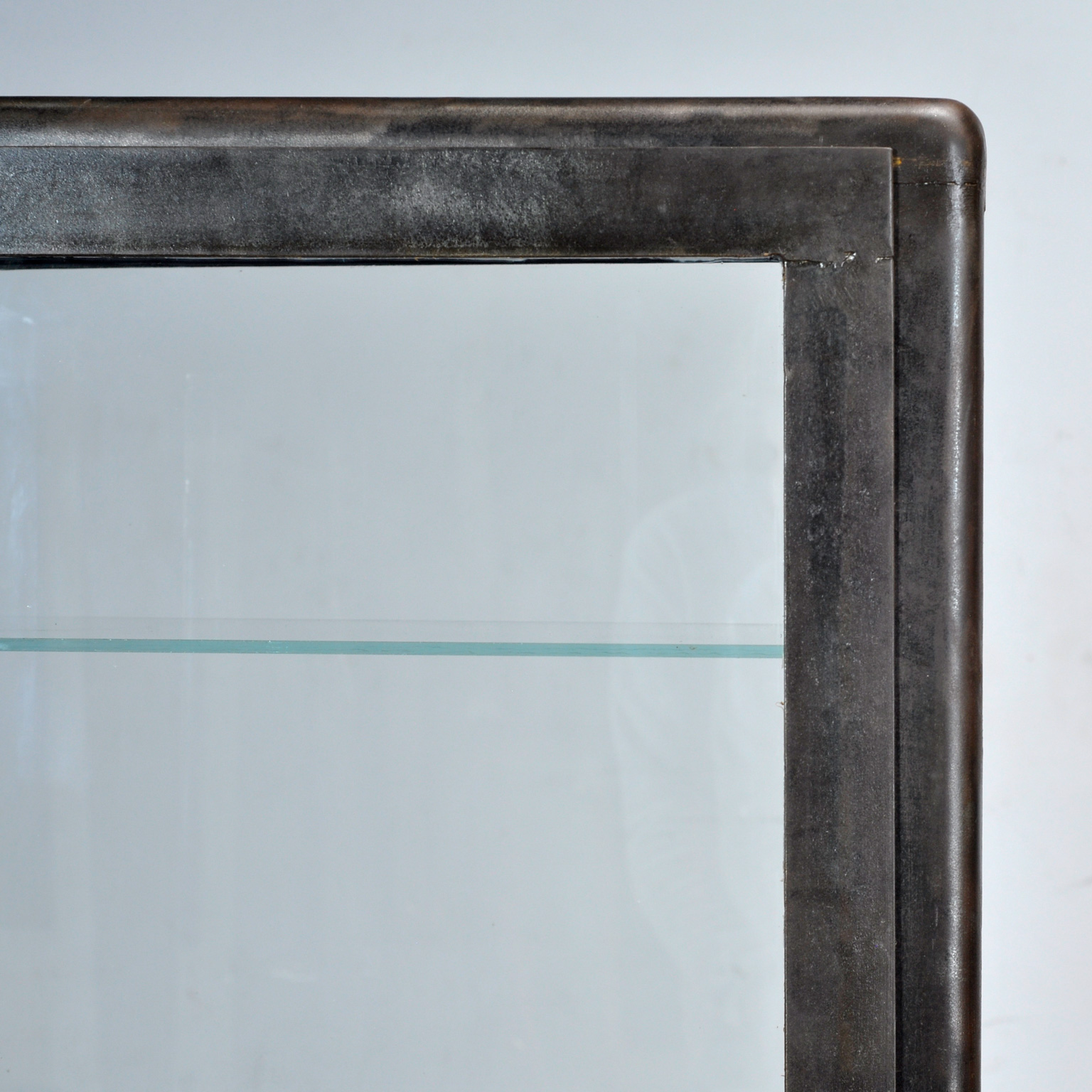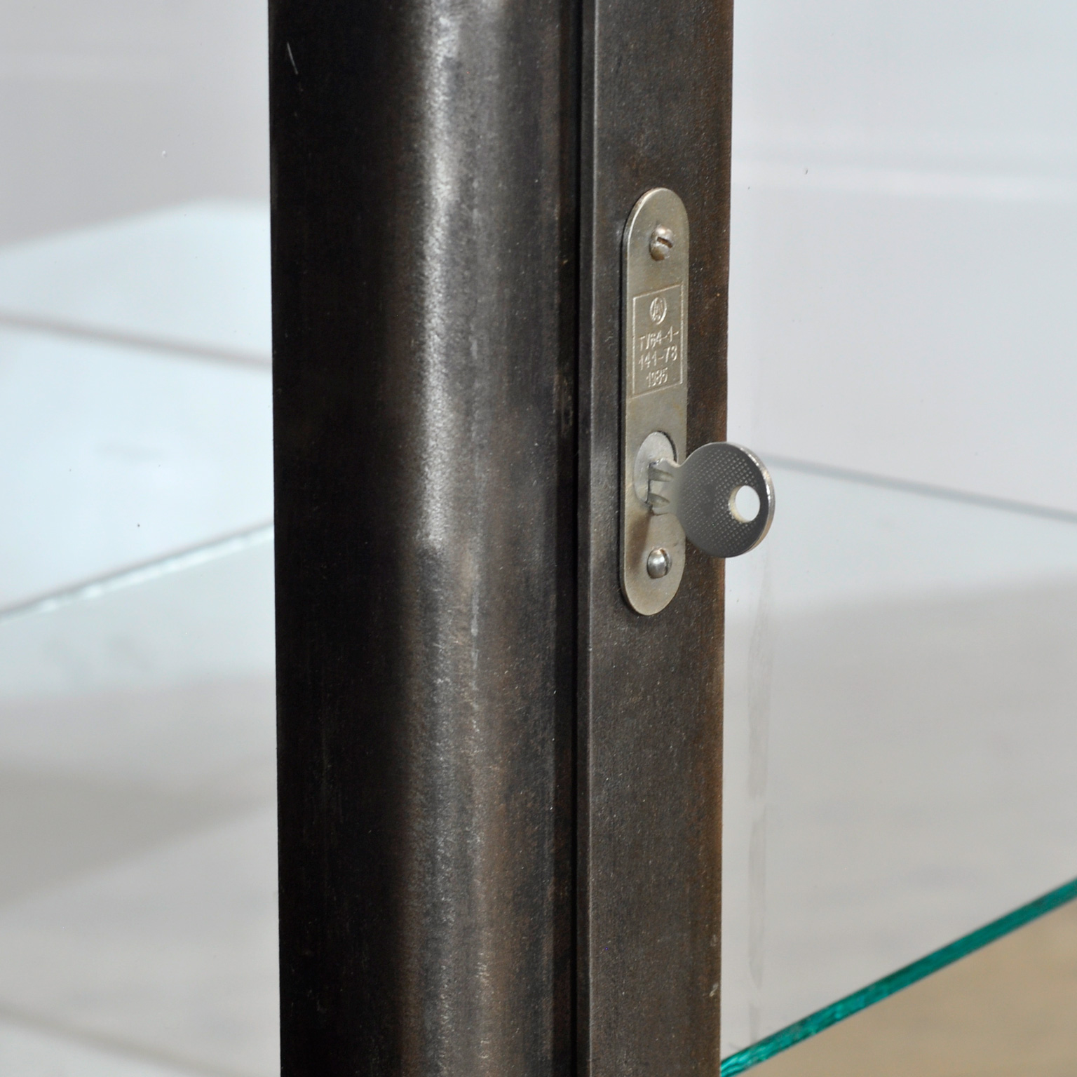Deze medicijnkast uit Oekraïne is een stuk met glas aan alle vier de zijden, waardoor je items prachtig zichtbaar zijn. Het metalen frame is volledig gestript van verf, wat zorgt voor een stoere, industriële uitstraling. Met zijn glazen legplanken en solide constructie is dit een perfect meubel voor het stijlvol presenteren van je objecten.