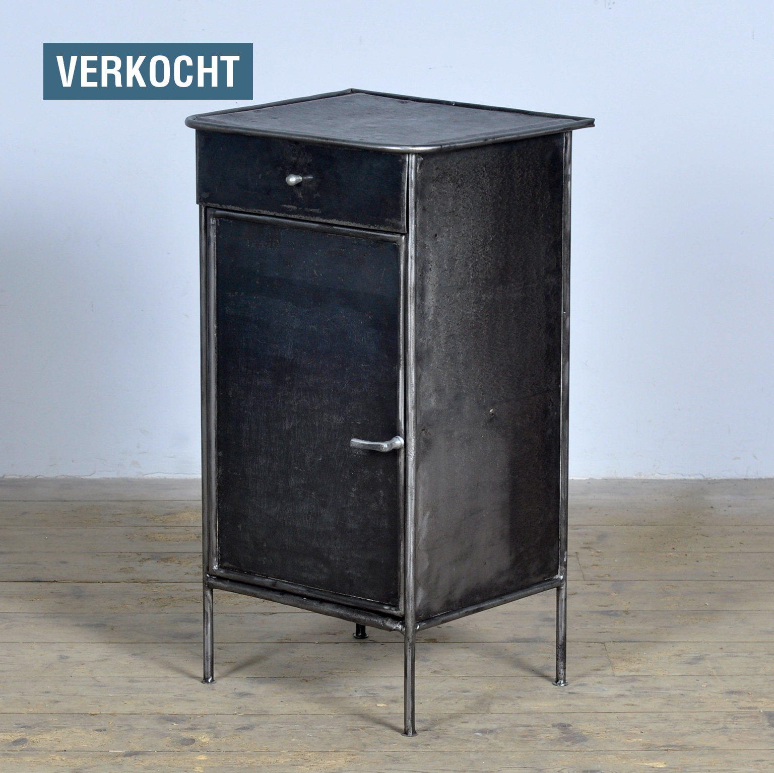 Nachtkastje gemaakt van ijzer afkomstig uit een ziekenhuis in Budapest. Gestript tot het metaal en gepolijst. Circa 1910.