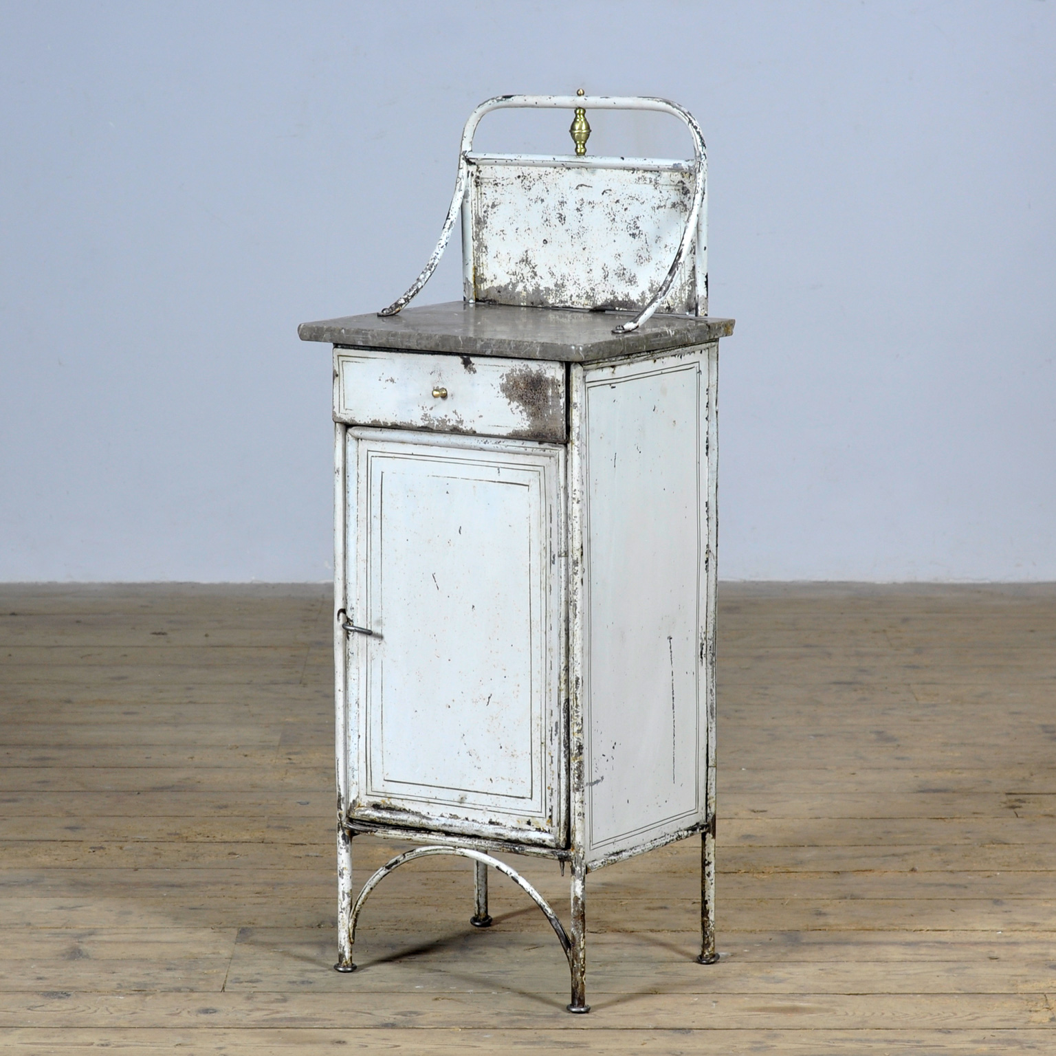 Nachtkastje uit circa 1920, voorzien van een elegant marmeren blad. Dit sfeervolle meubelstuk verkeert in authentieke, doorleefde staat en combineert functionaliteit met tijdloze uitstraling. Het kastje beschikt over een lade en deur voor praktische opbergruimte. Een karaktervol object dat zowel in een klassiek als in een modern interieur een onderscheidende, stijlvolle toevoeging vormt.