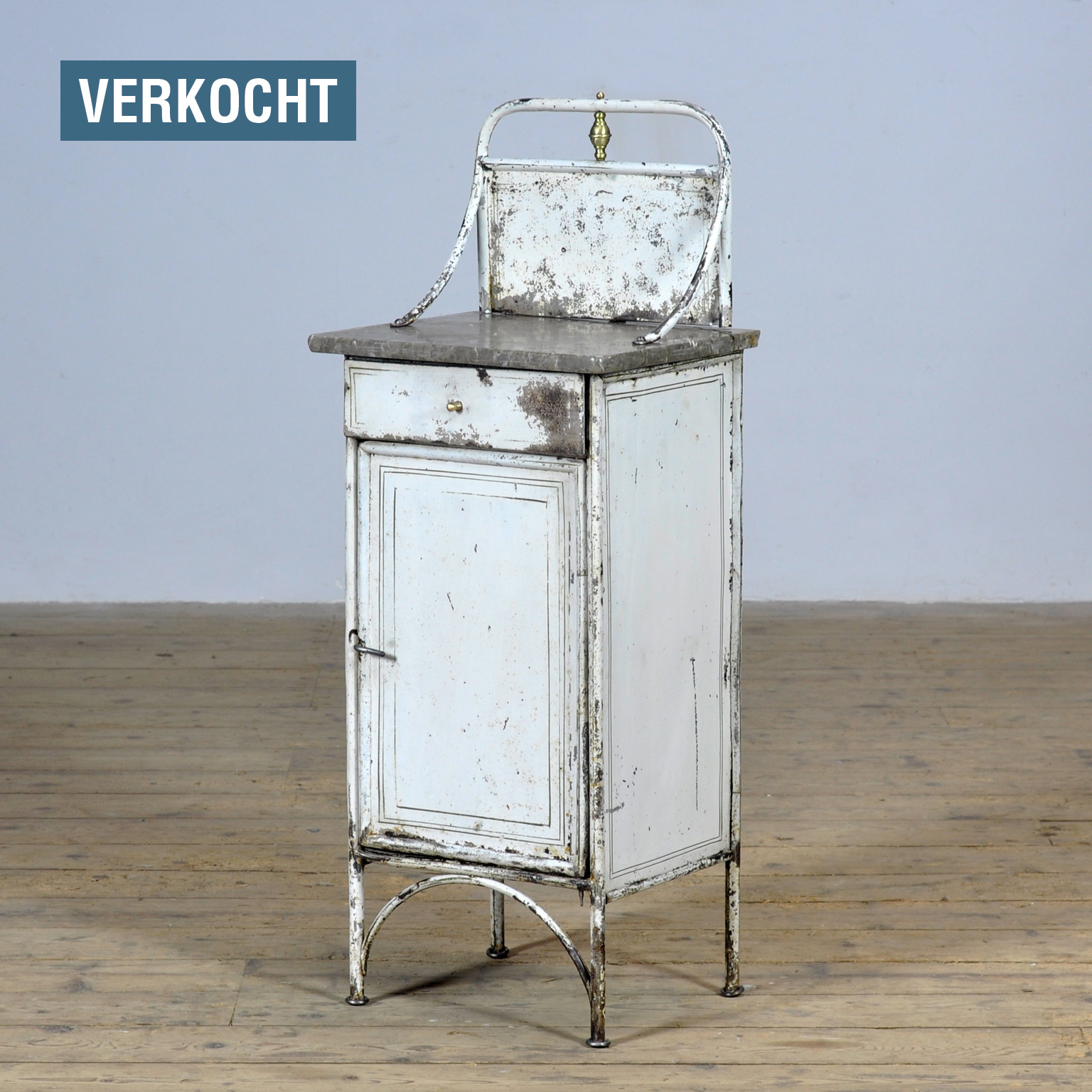 Nachtkastje uit circa 1920, voorzien van een elegant marmeren blad. Dit sfeervolle meubelstuk verkeert in authentieke, doorleefde staat en combineert functionaliteit met tijdloze uitstraling. Het kastje beschikt over een lade en deur voor praktische opbergruimte. Een karaktervol object dat zowel in een klassiek als in een modern interieur een onderscheidende, stijlvolle toevoeging vormt.